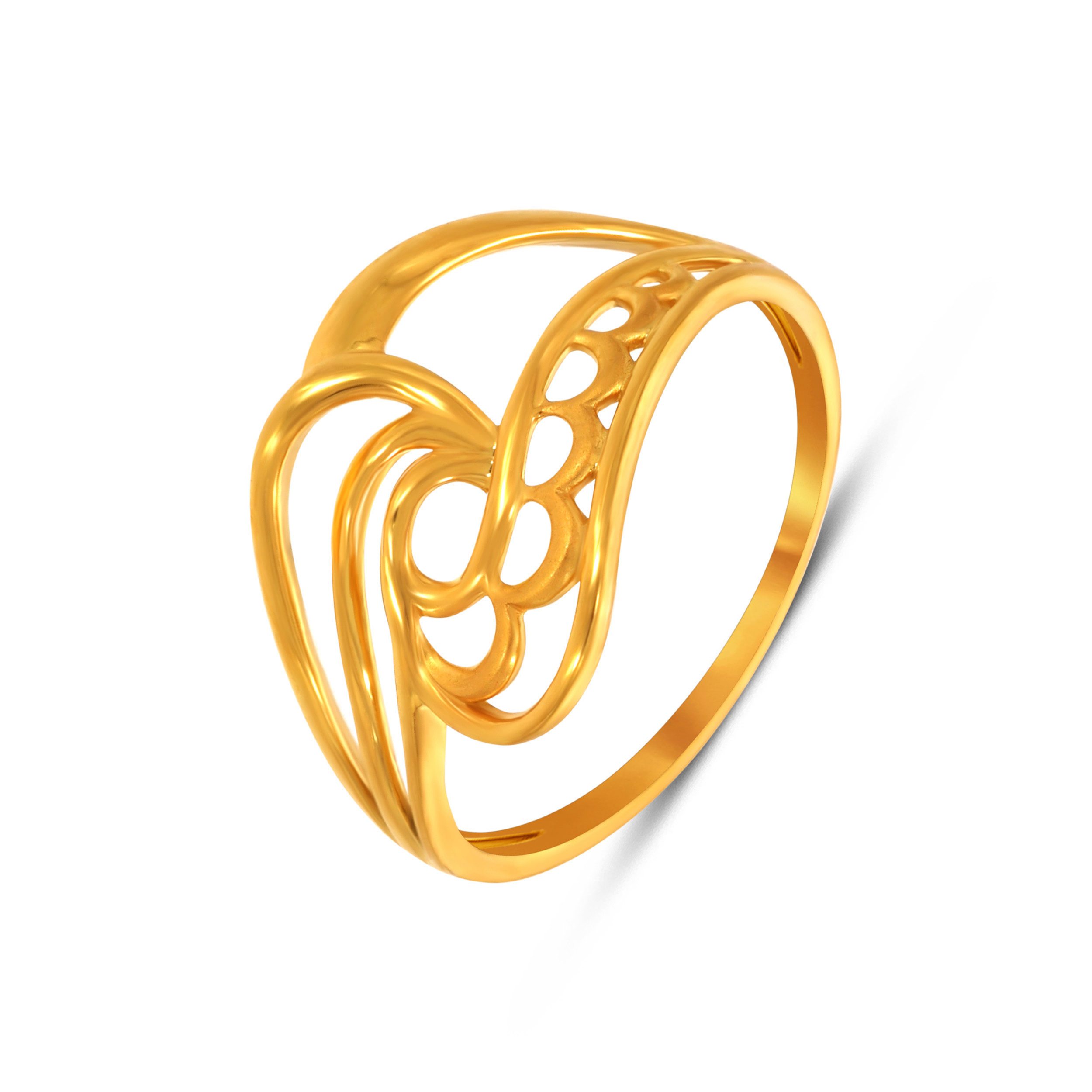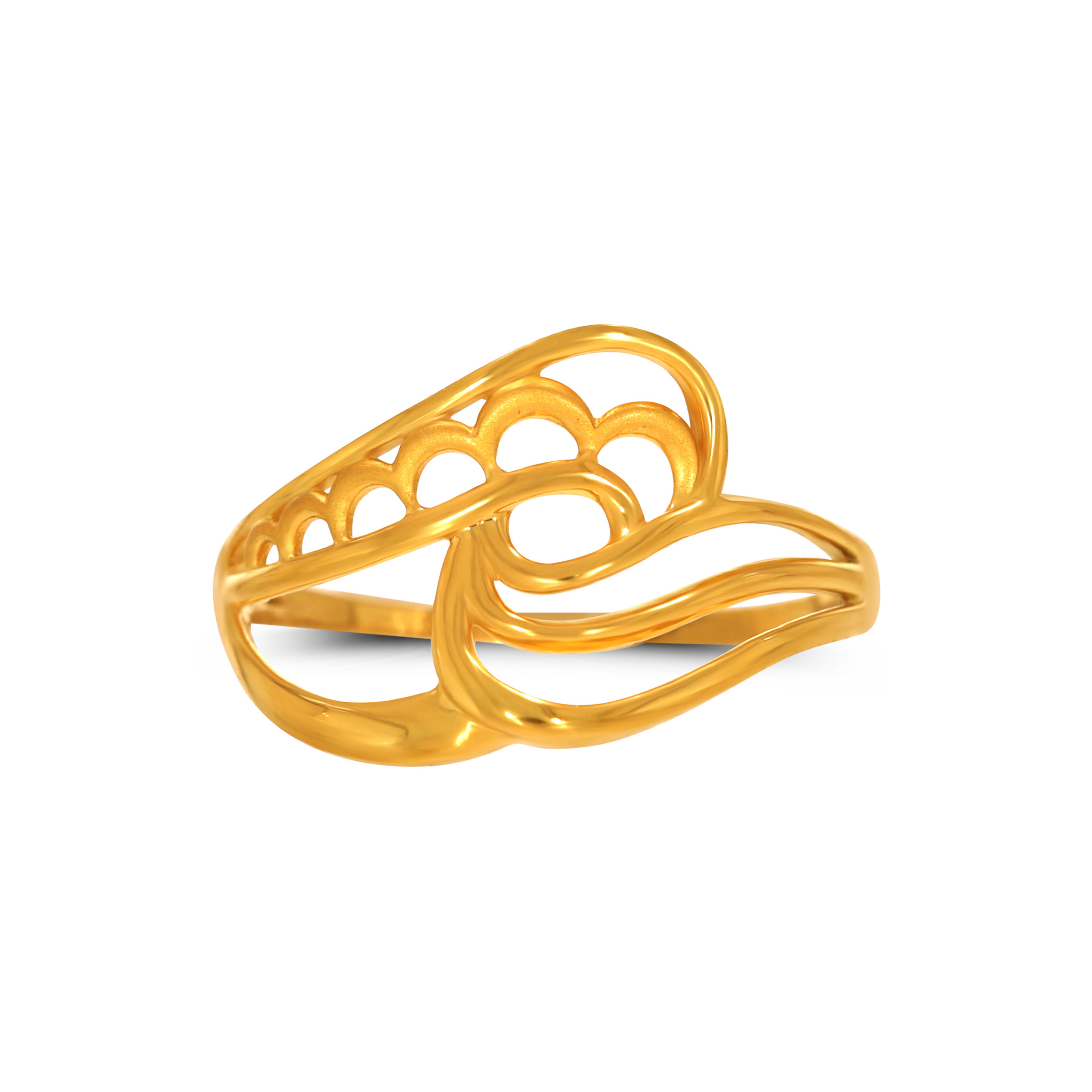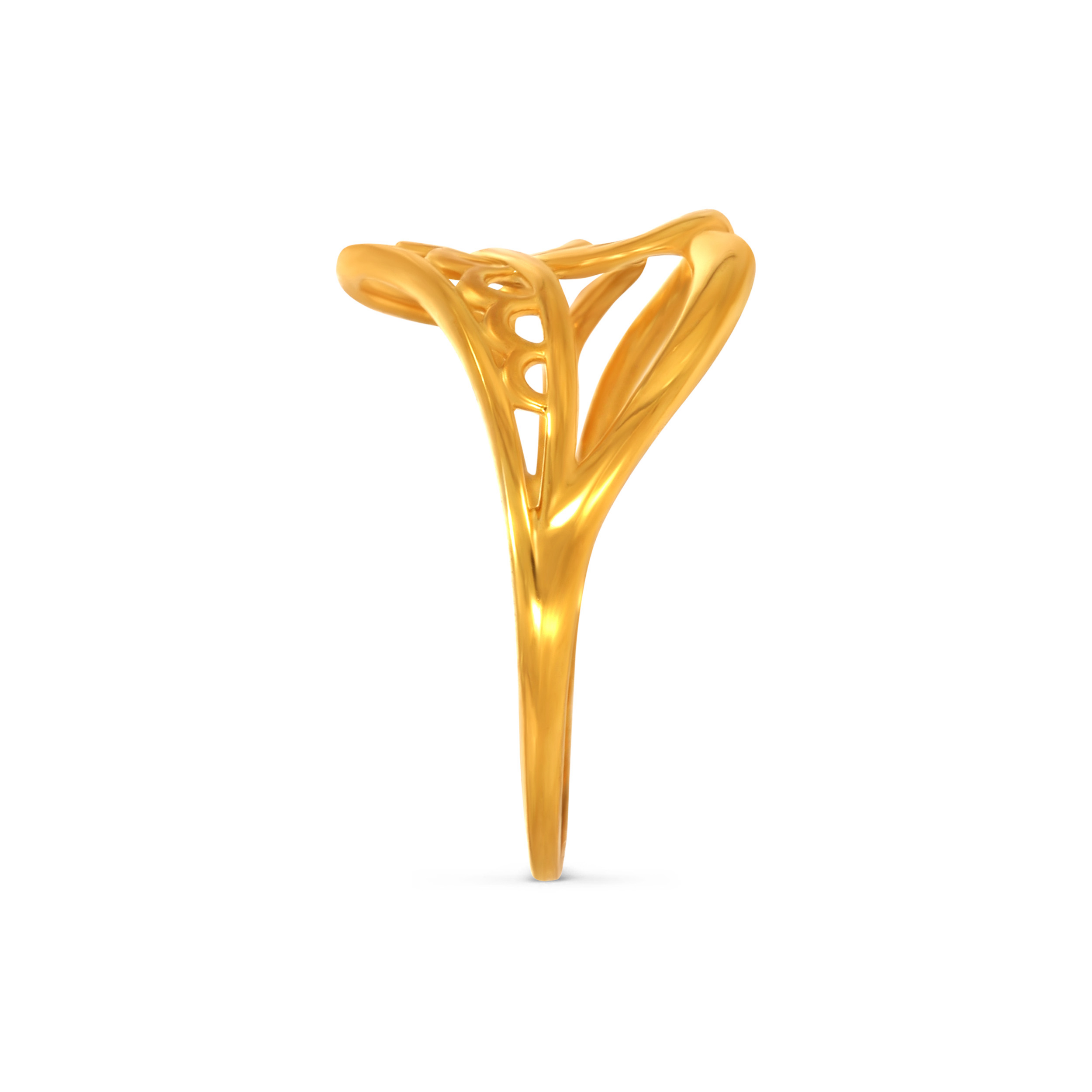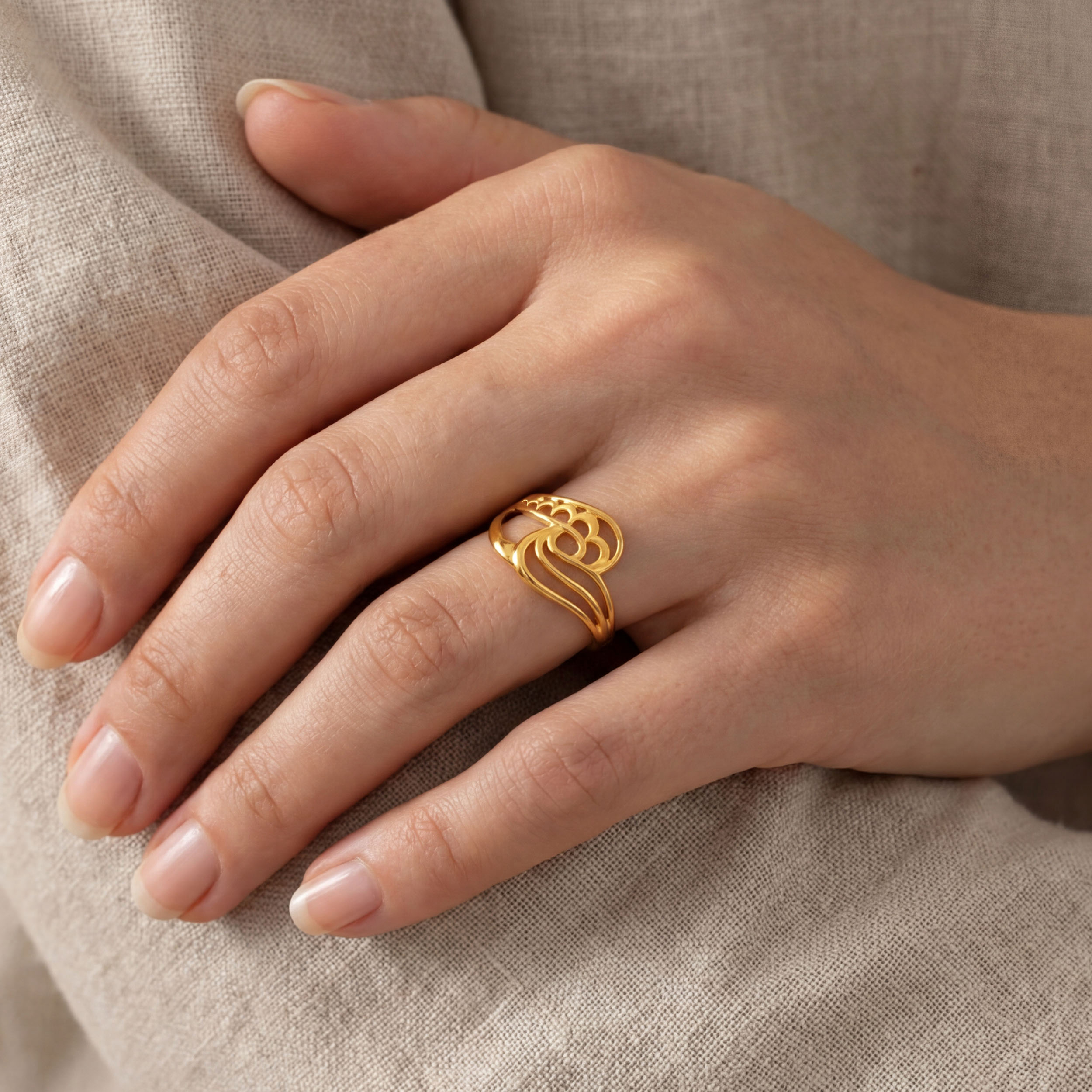 A tiny bloom rests between gently curved leaves, giving this gold ring a soft, organic rhythm. Graceful without being ornate, it complements subtle festive outfits or light silk ensembles beautifully.