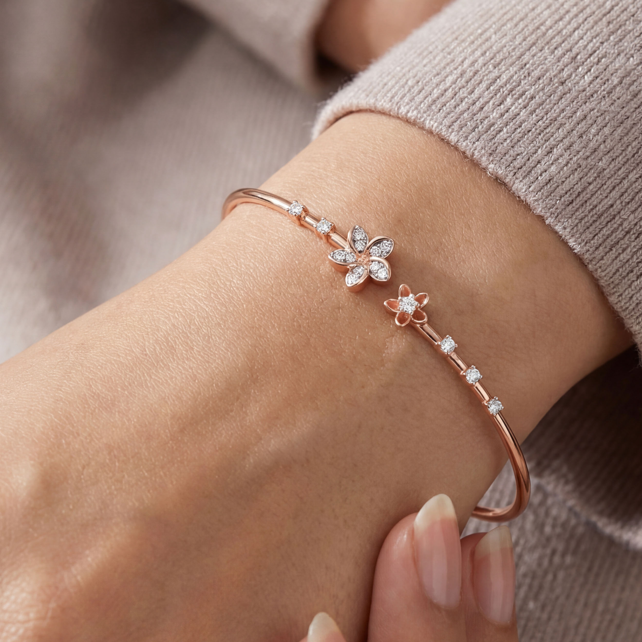 Elevate your everyday sparkle with this contemporary diamond bypass bracelet. Designed with a sleek, slender profile and a modern open-ended design, this piece features mismatched floral elements for a touch of curated imperfection.