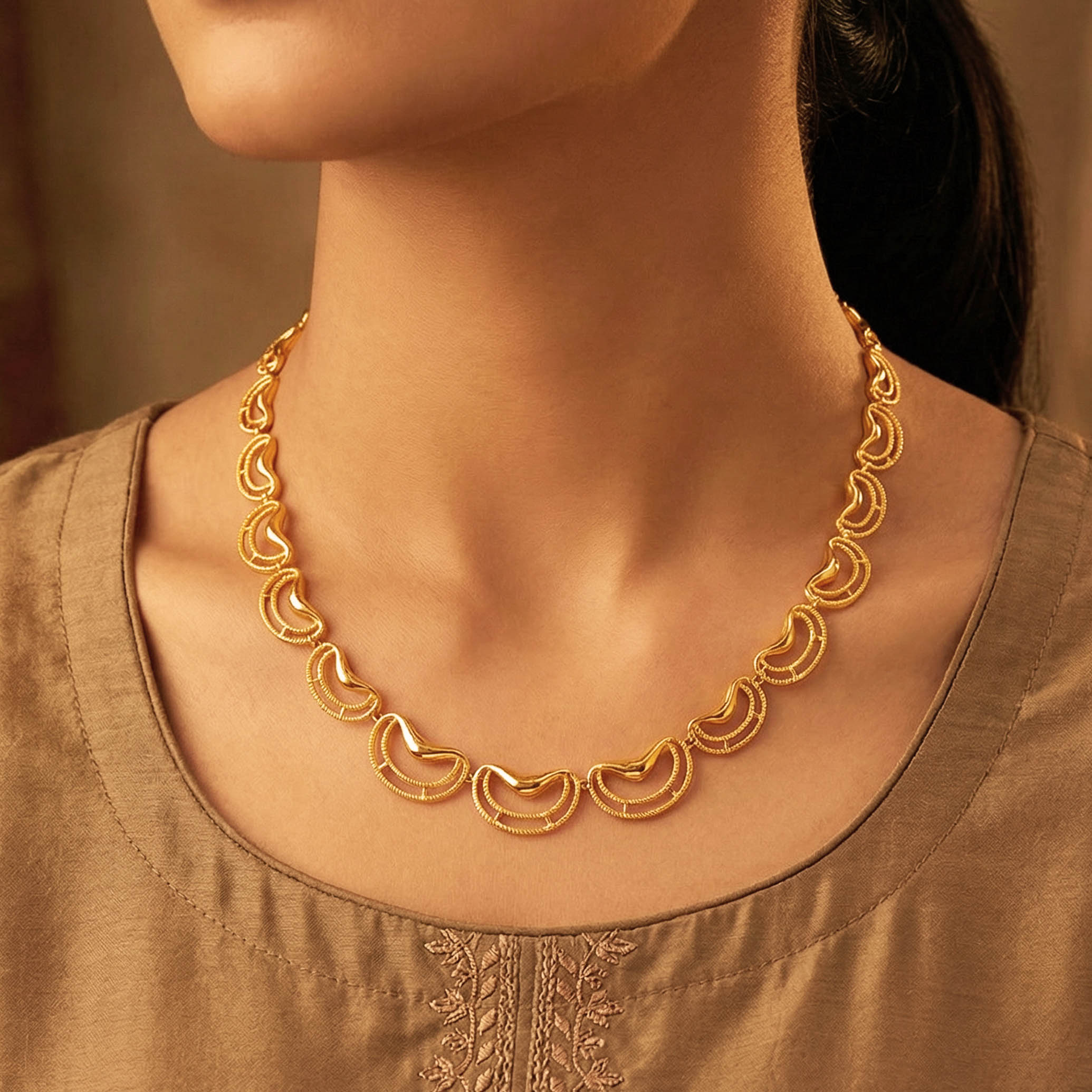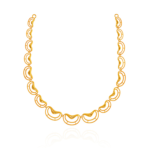 Add sparkle to your soirée with this abstract, uniquely designed gold necklace. Balancing traditional influence with everyday elegance, it styles beautifully with cocktail sarees, gowns, or Indo-Western ensembles for an effortlessly striking look.