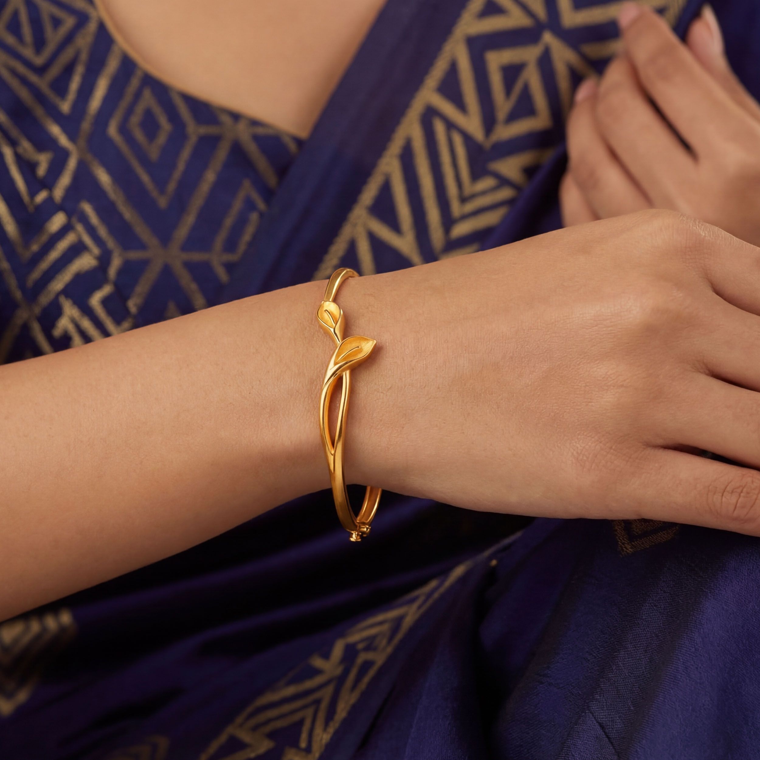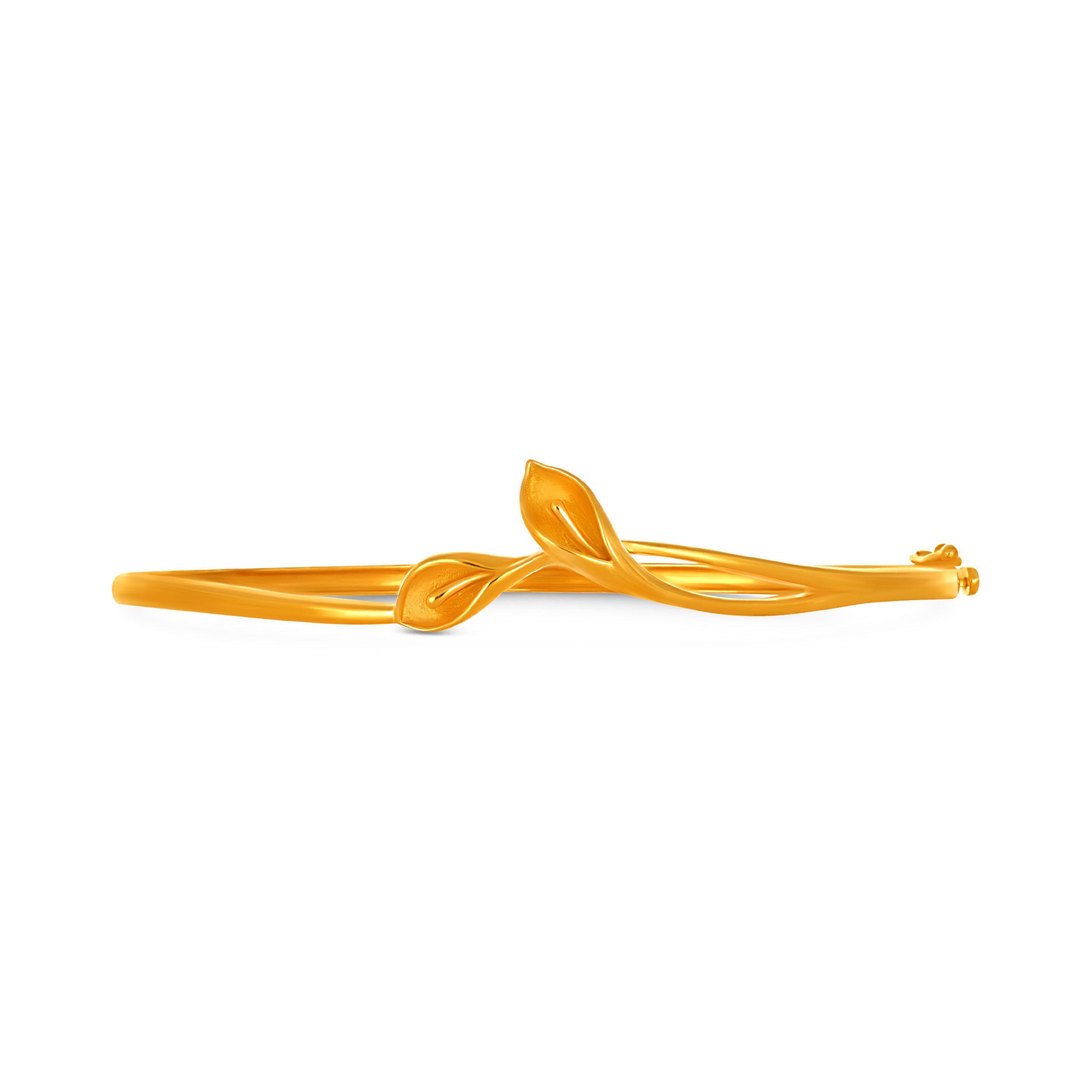 Refined and feminine, this gold chur features two mirror-finish botanical leaves that lend a soft, nature-inspired touch. Its open-frame design keeps it light and versatile, making it ideal for everyday wear. Style it with a floral brunch dress or a minimal linen co-ord set for an easy, polished look.