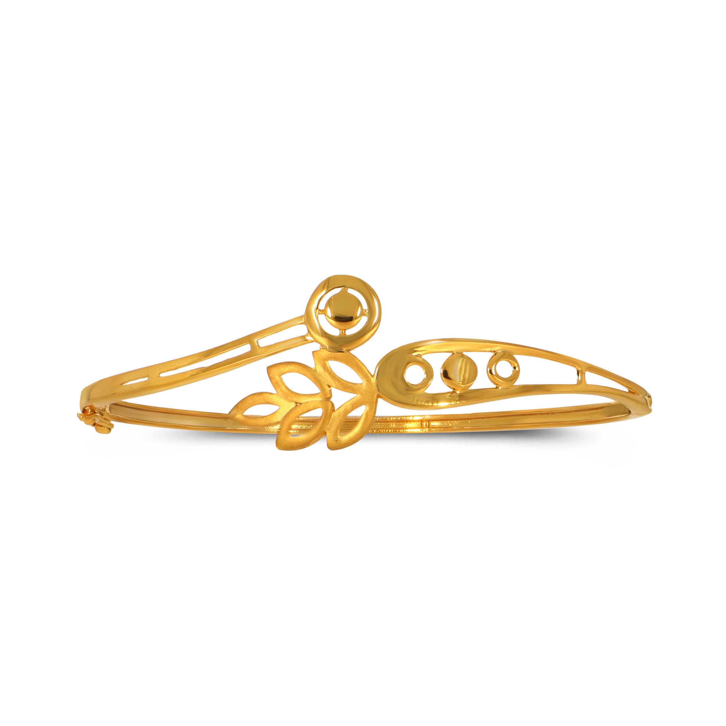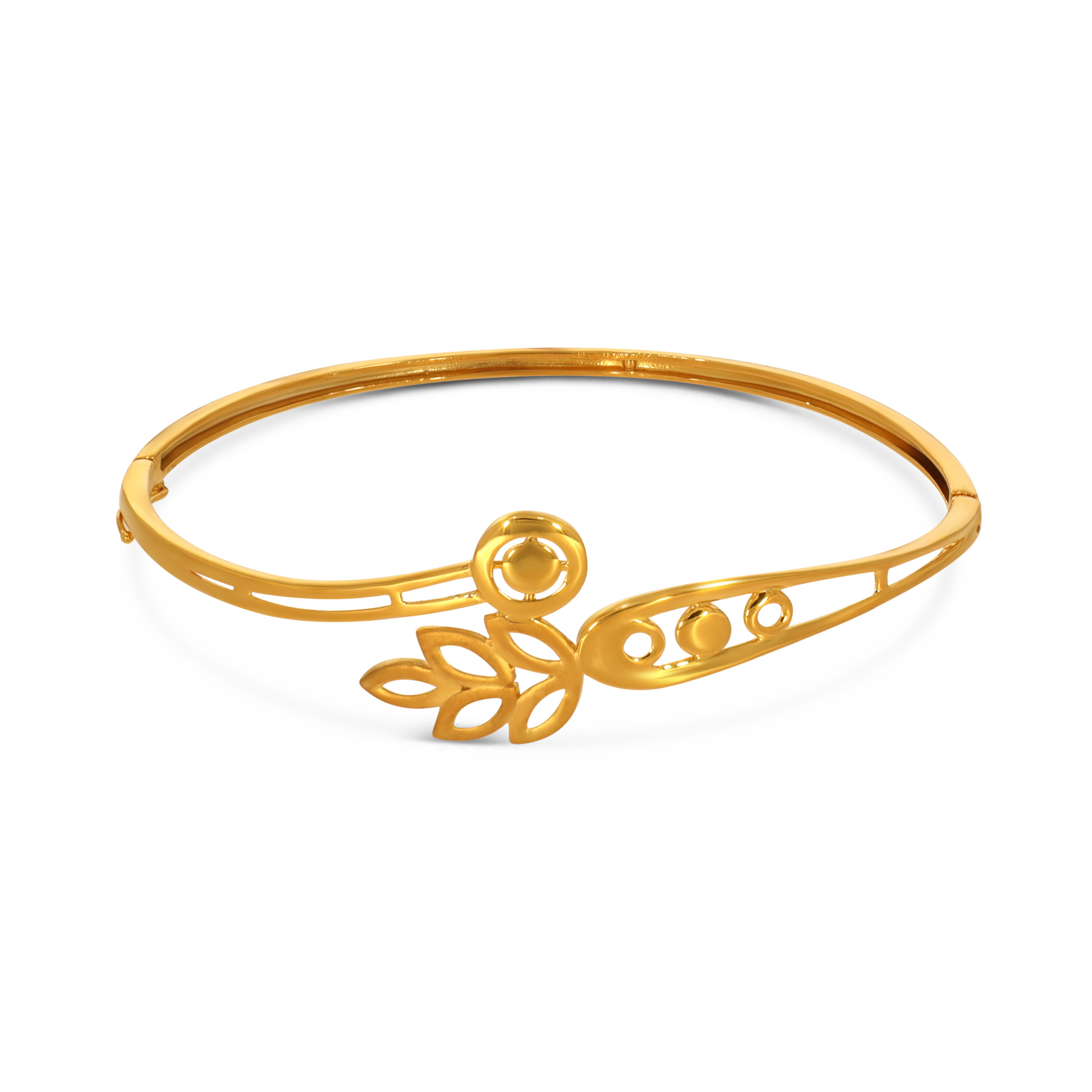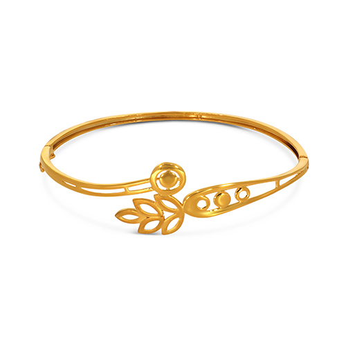 Capture the essence of nature with this sculpted gold bangle, where overlapping curves form a graceful leaf silhouette that wraps effortlessly around the wrist. The fluid, leafy motif adds depth and texture, catching the light with every movement for a look that feels organic yet refined.