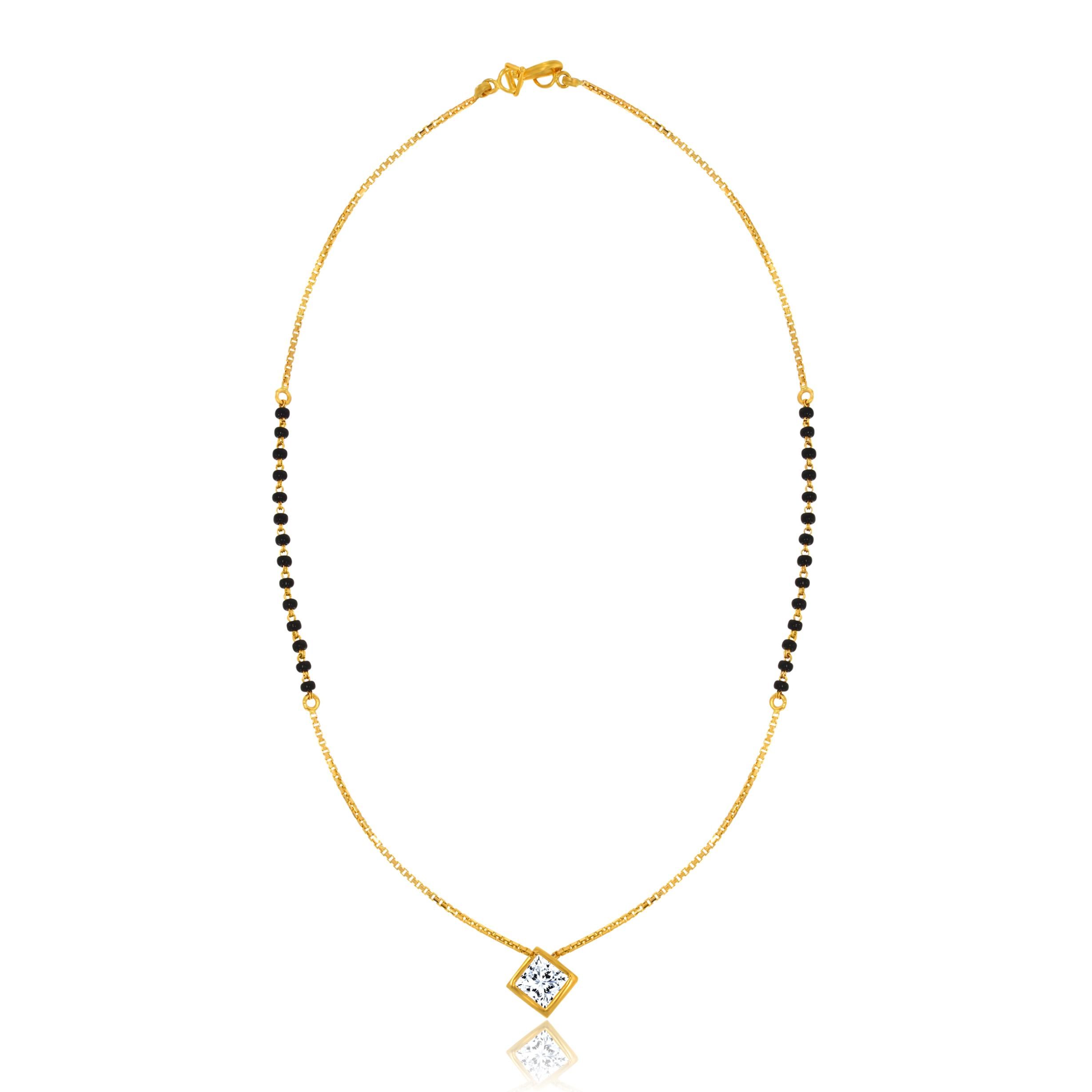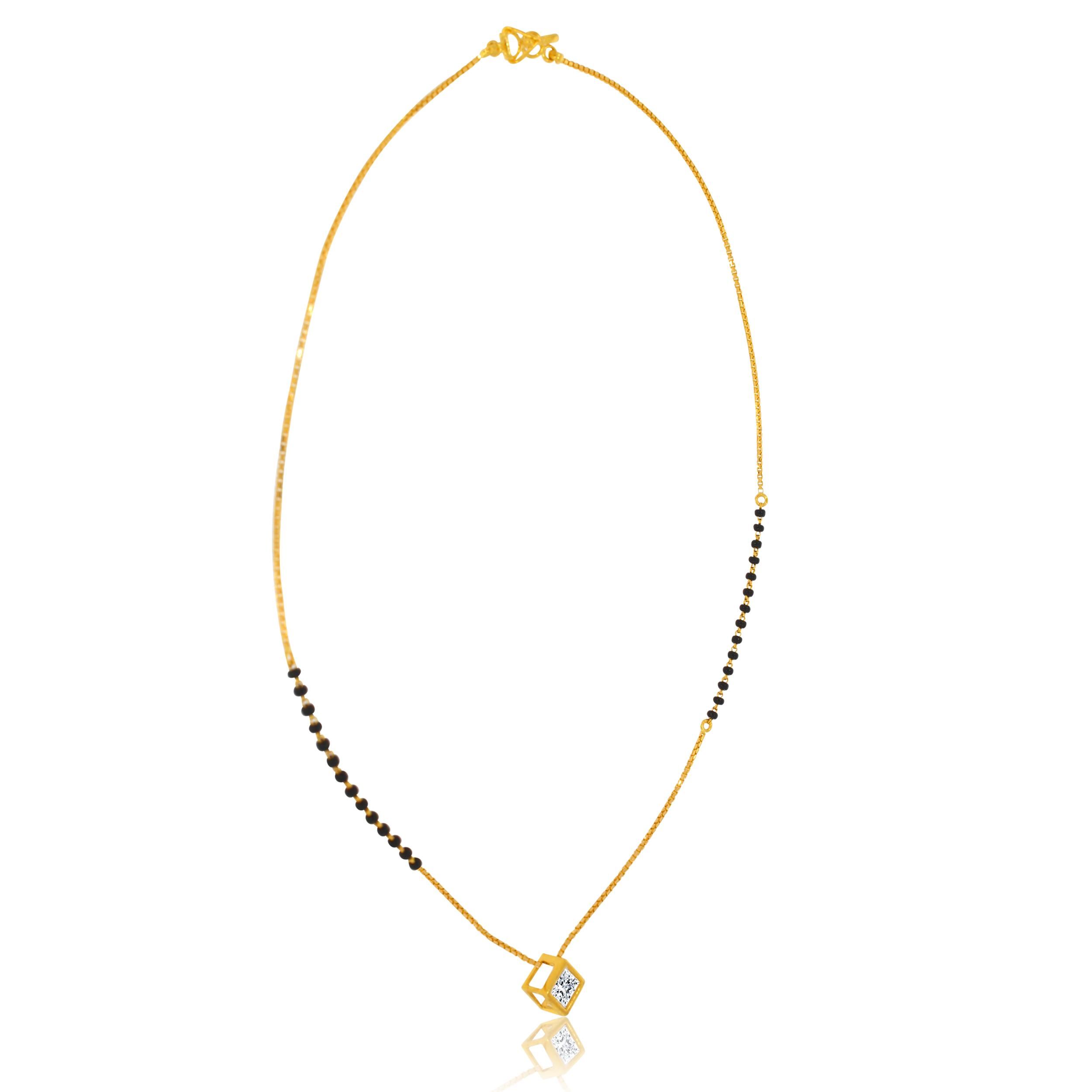 Casually adorn your simple beauty with this frugal yet beautiful box of love mangalsutra. The black beads have added pristine beauty to this chain and the stone in the box-like design is adding an extra glow to the entire gold mangalsutra. Wear it all day long.