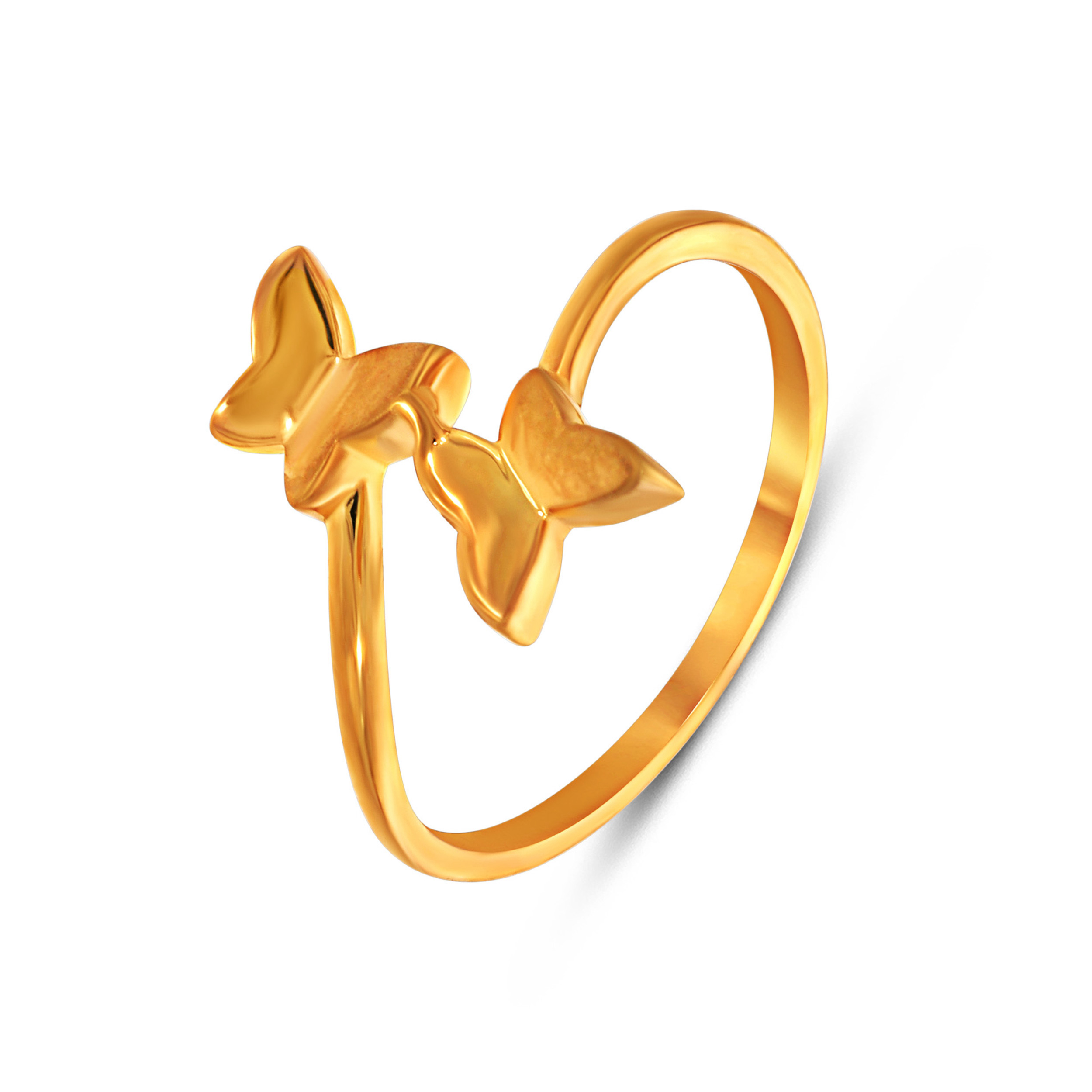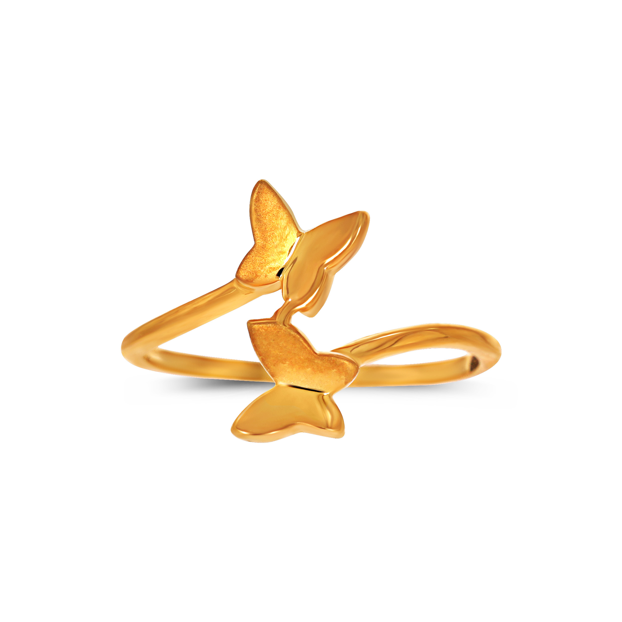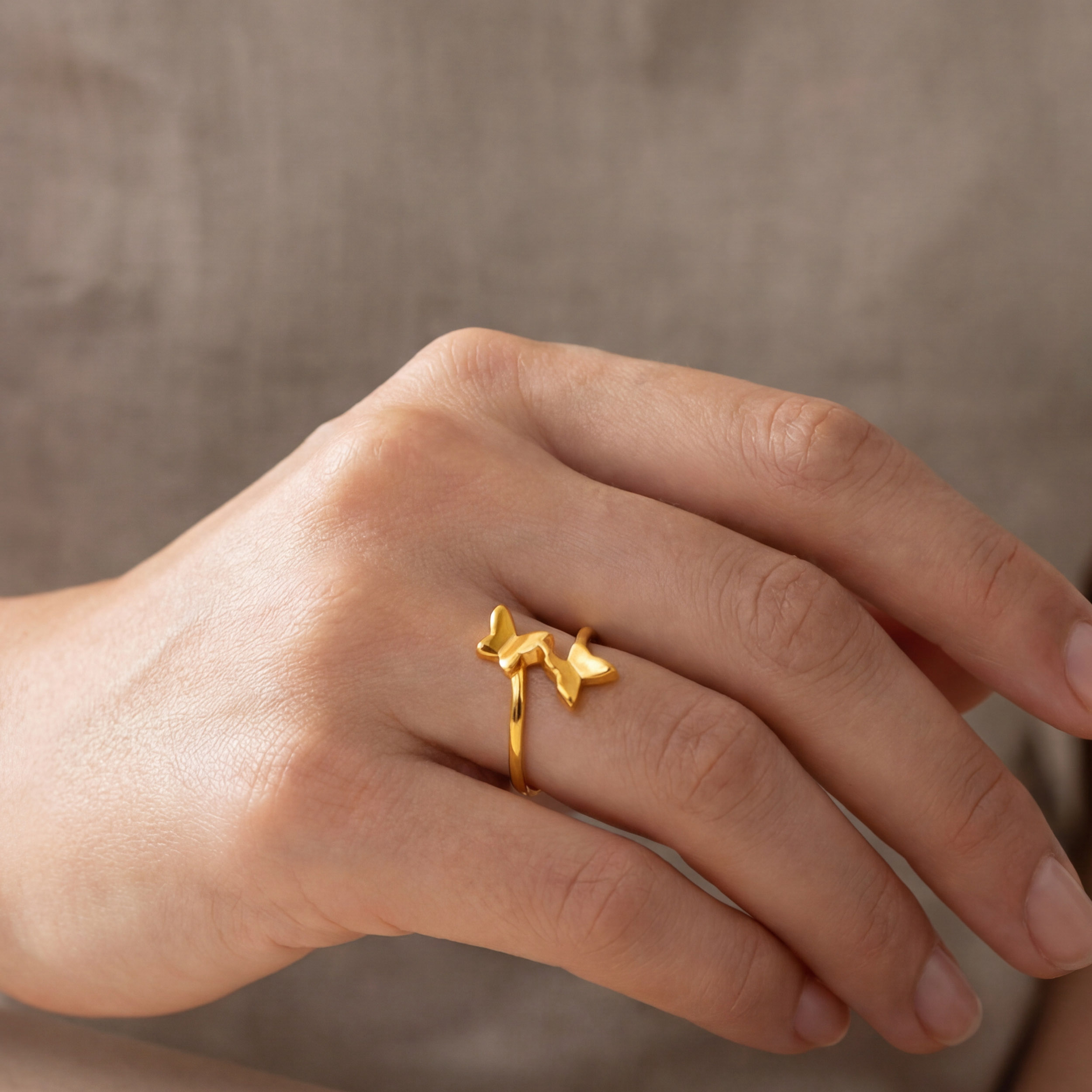 Playful and poetic, this lightweight gold ring captures love in twin butterfly forms poised mid-flight. Its sleek band keeps the look contemporary. Style it with a summer co-ord set or a crisp white shirt for a fresh finish.