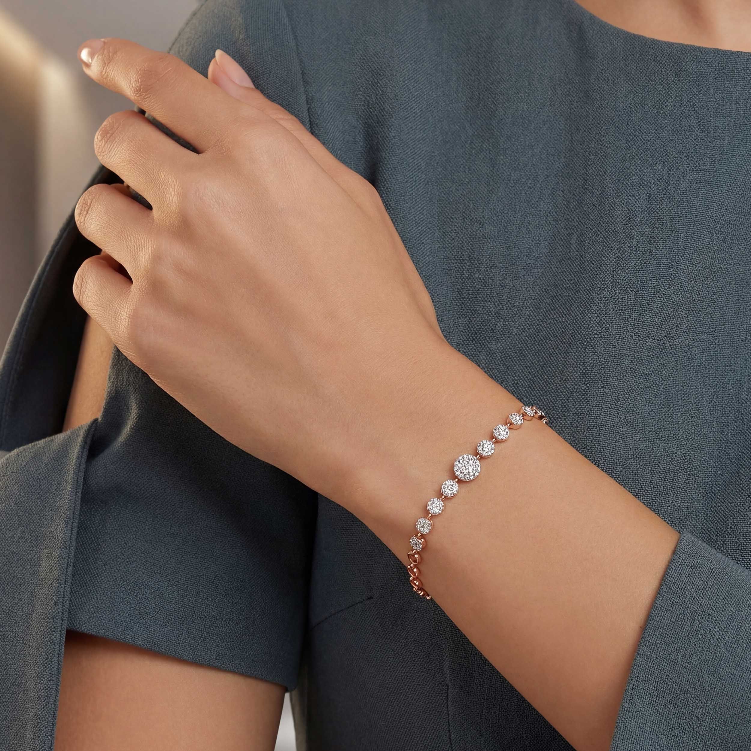A refined take on everyday sparkle, this bracelet features a sequence of graduating diamond discs set along a fine chain. Light, fluid, and quietly luminous, it sits effortlessly on the wrist, offering a clean, modern finish that transitions seamlessly from day to evening.