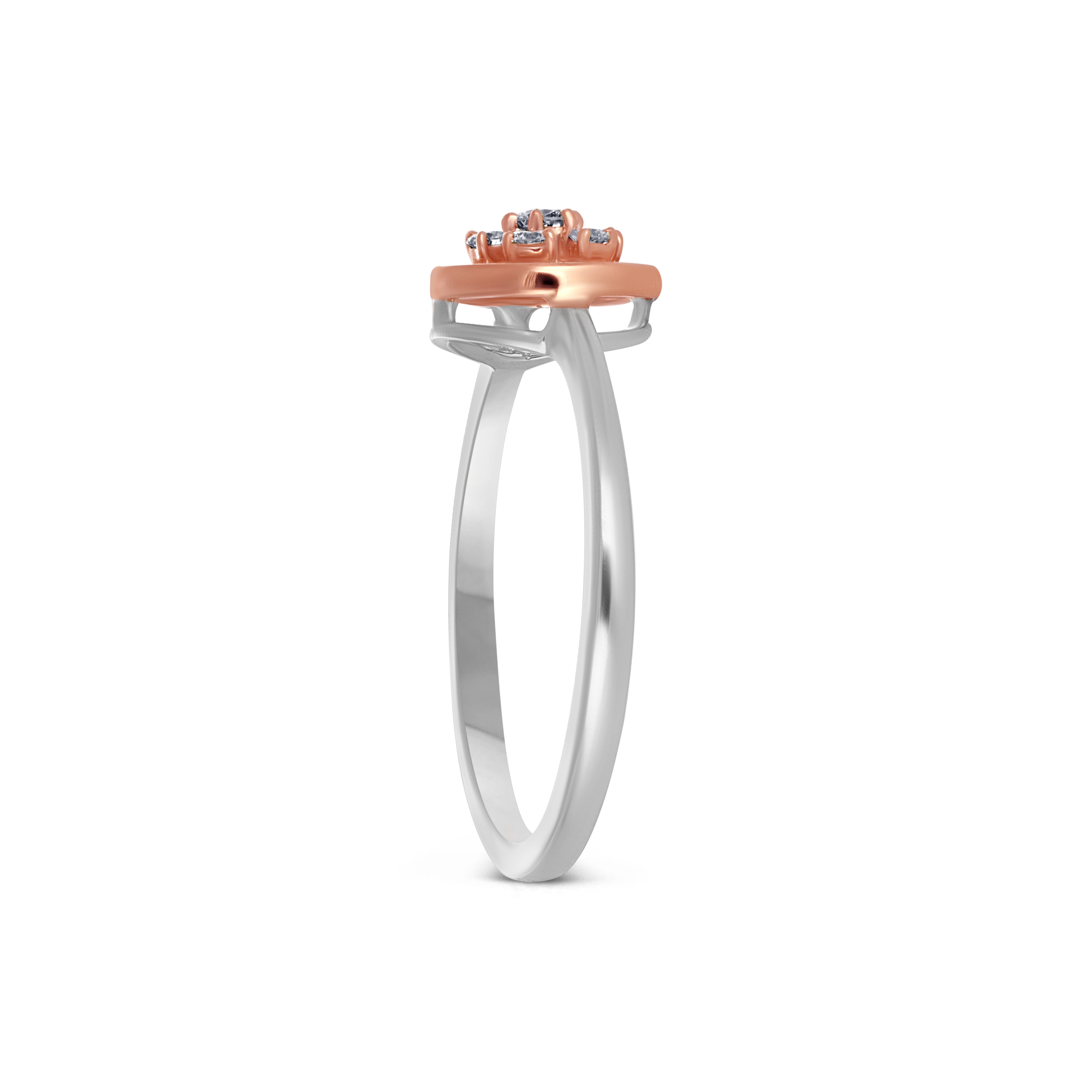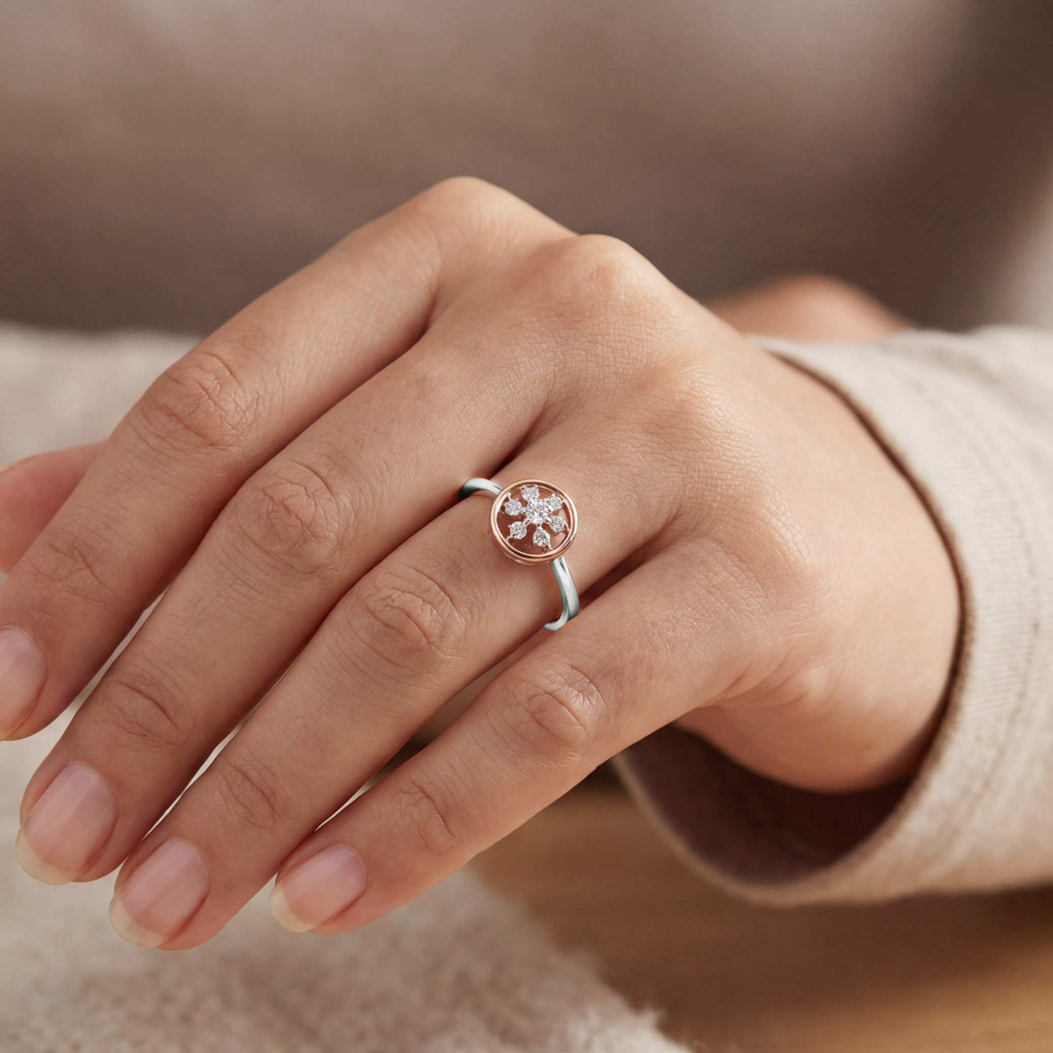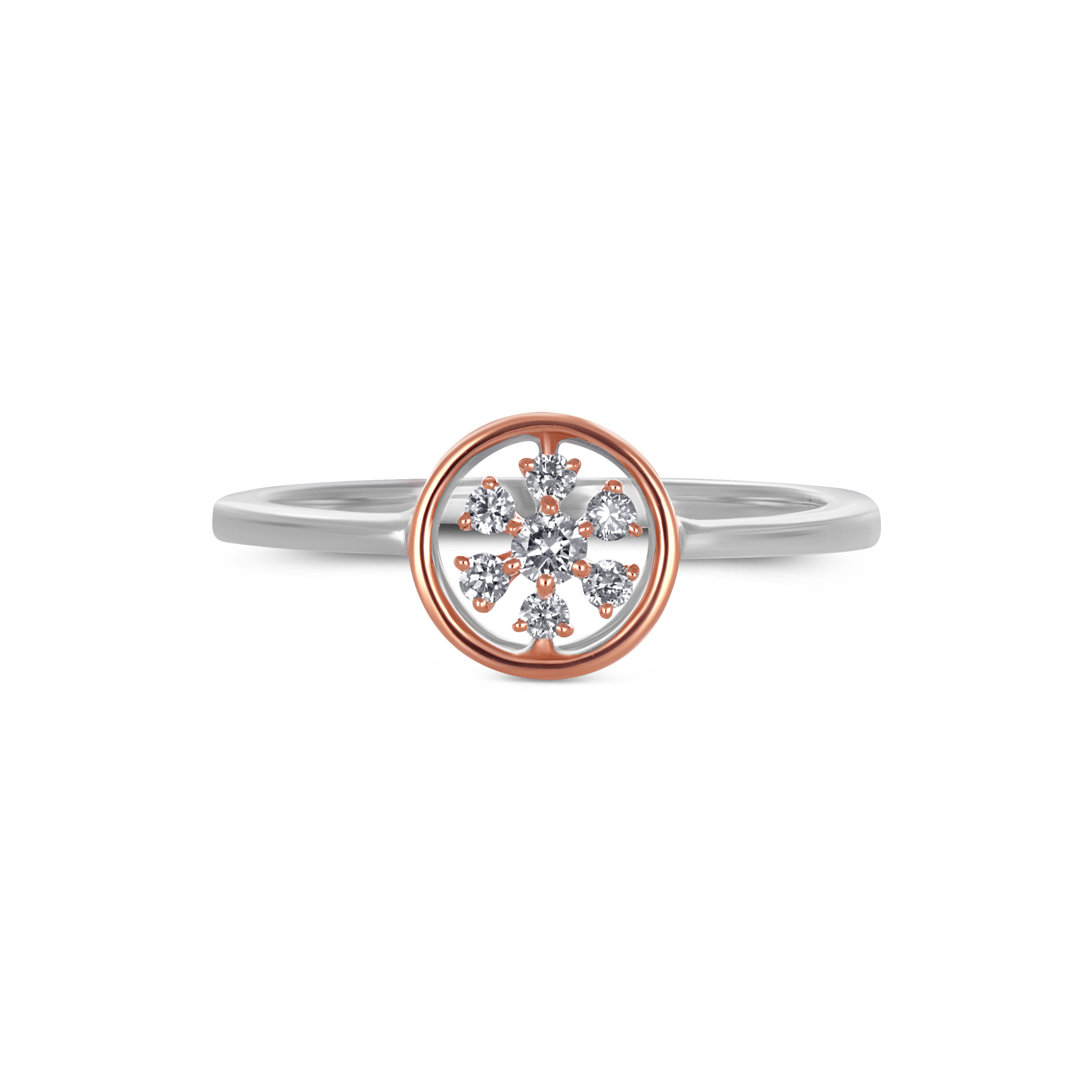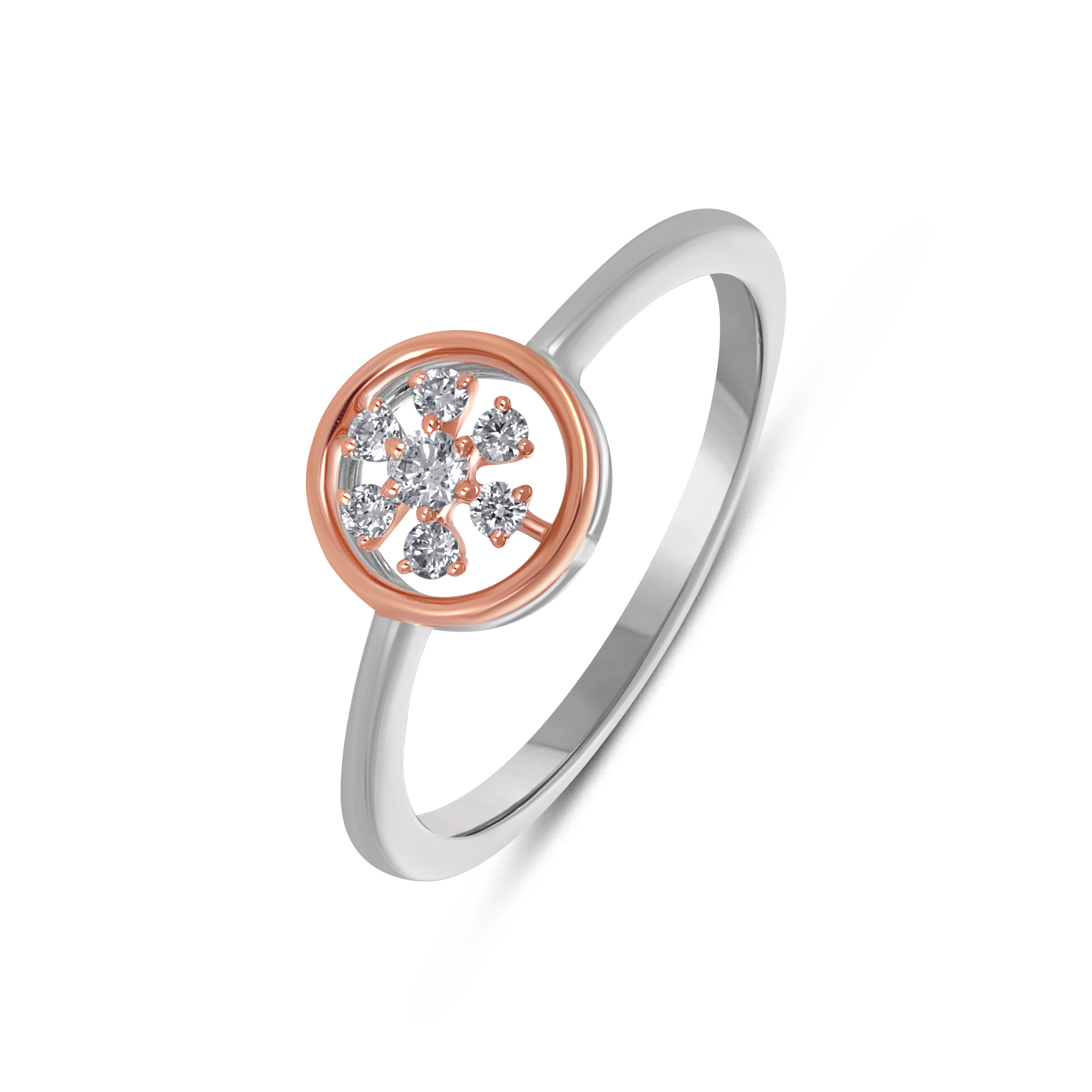 Minimal yet luminous, this platinum diamond ring showcases a circular motif framed in platinum, with a centred floral cluster of brilliant diamonds accented by warm gold detailing. Endlessly versatile, it pairs beautifully with pastel-toned ethnic wear as well as clean Western silhouettes.