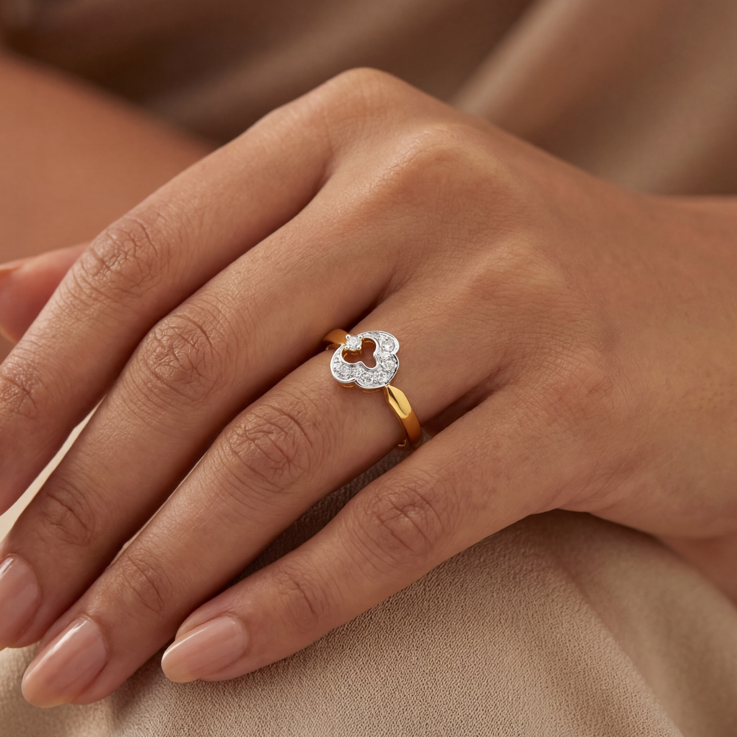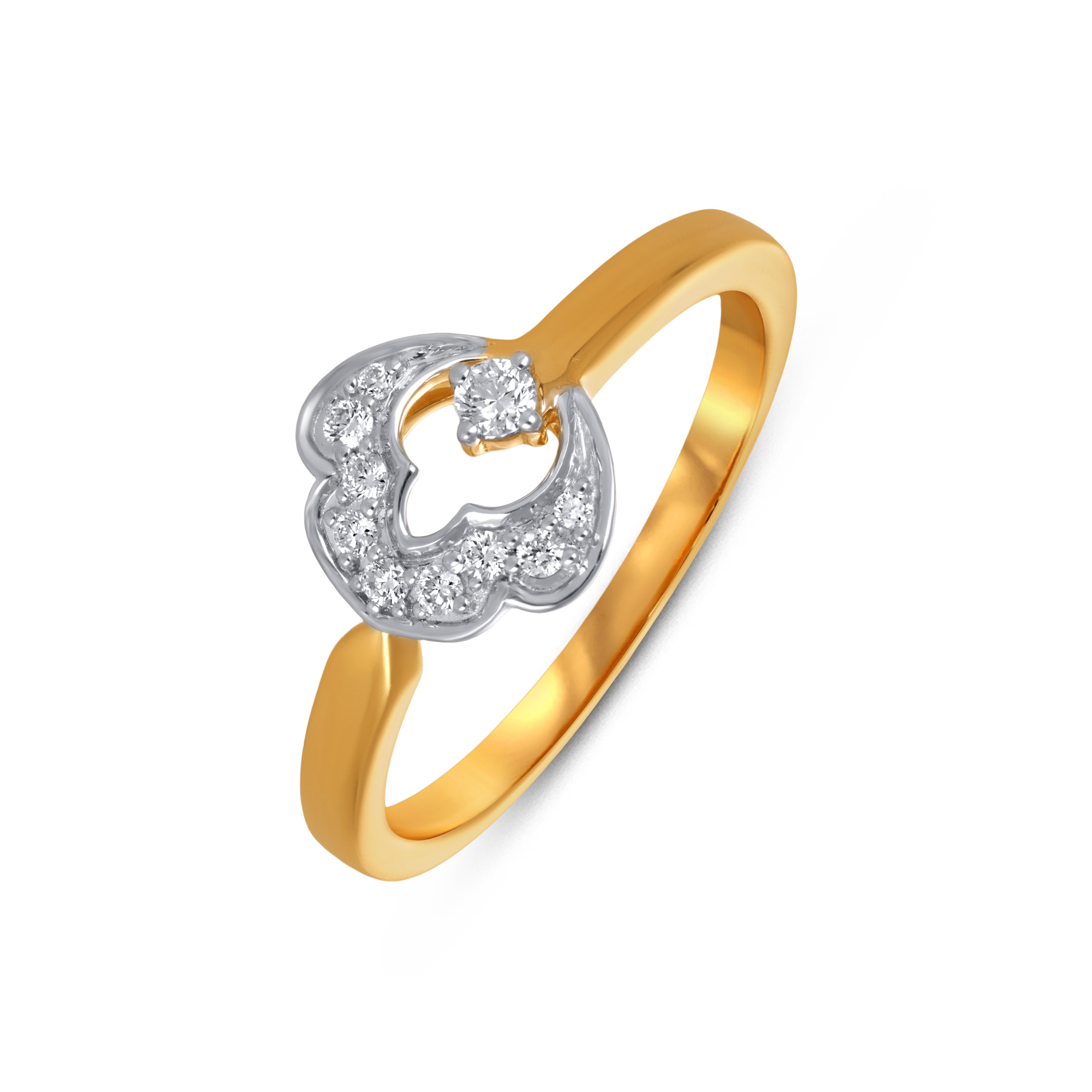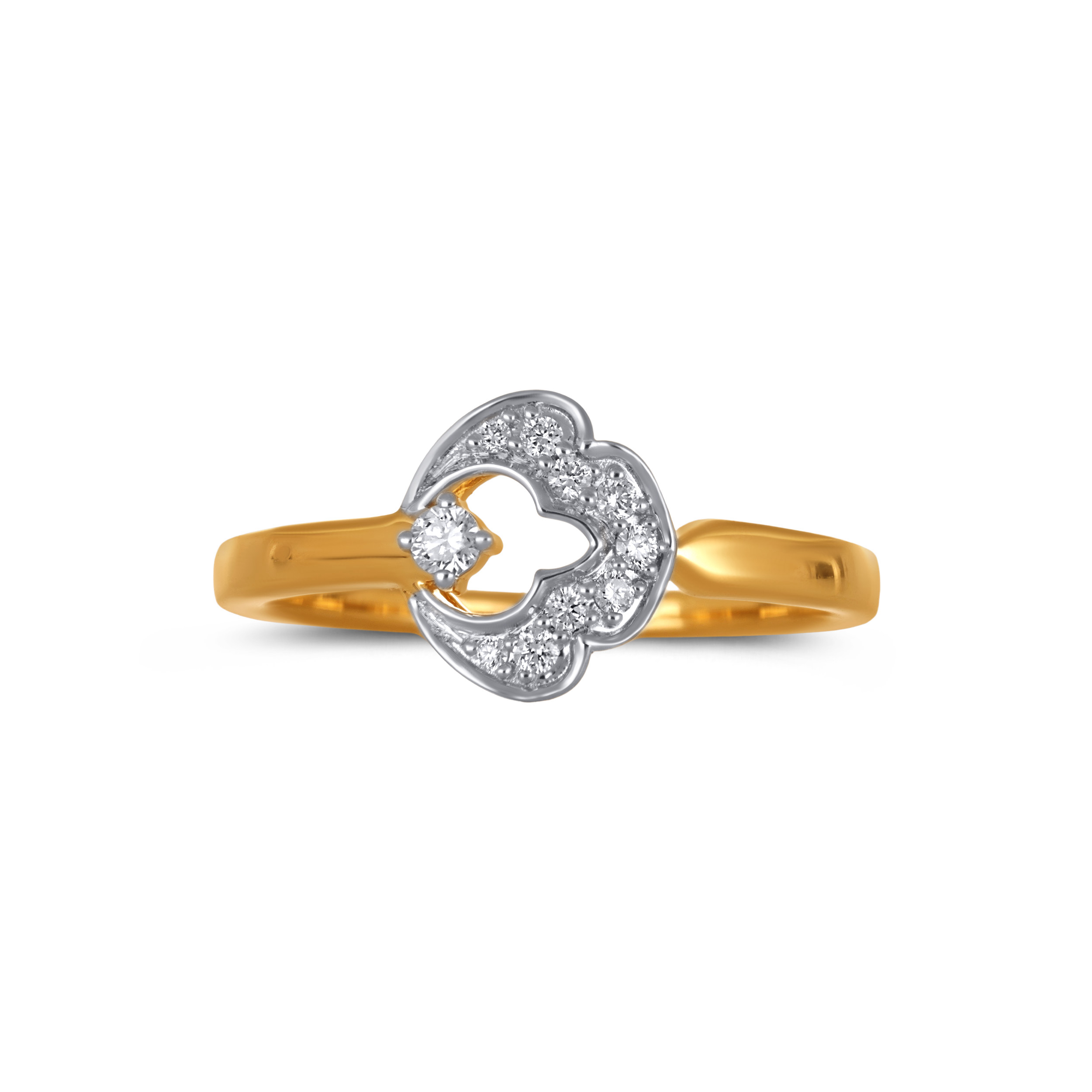 Shaped with elegant curves and an open silhouette, this two-tone diamond ring reflects classic design sensibilities in warm gold. Delicate sparkling accents lend a quiet glow, making it ideal to slip into your everyday wear effortlessly.