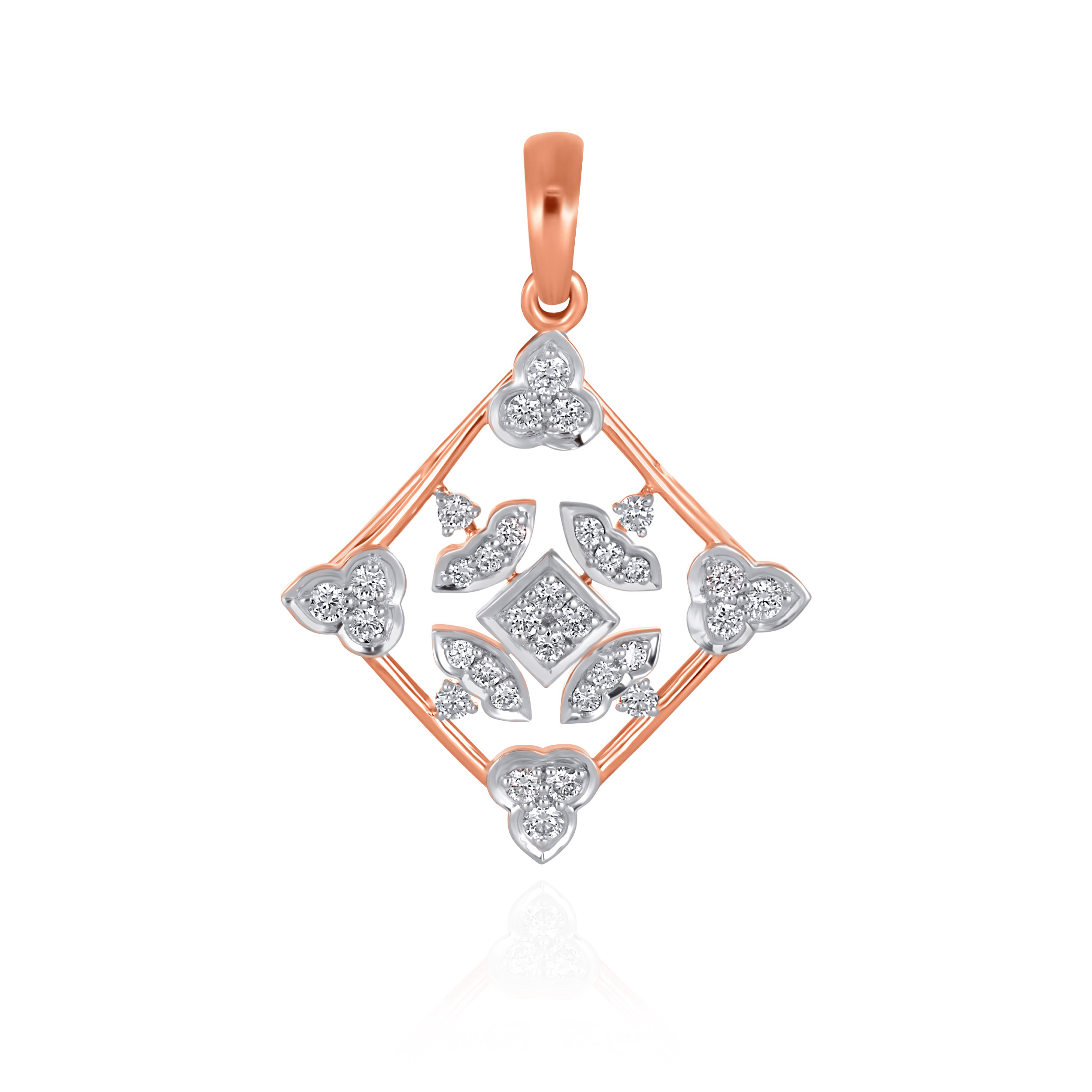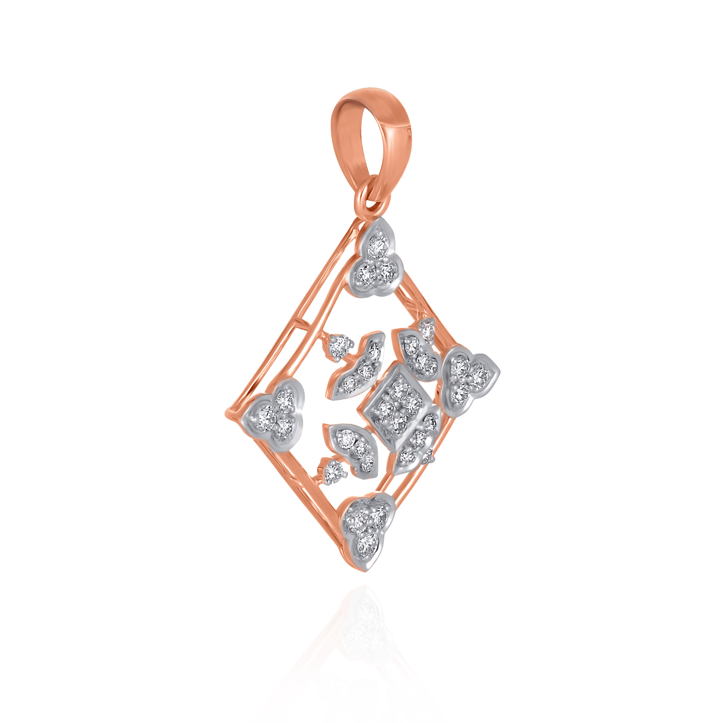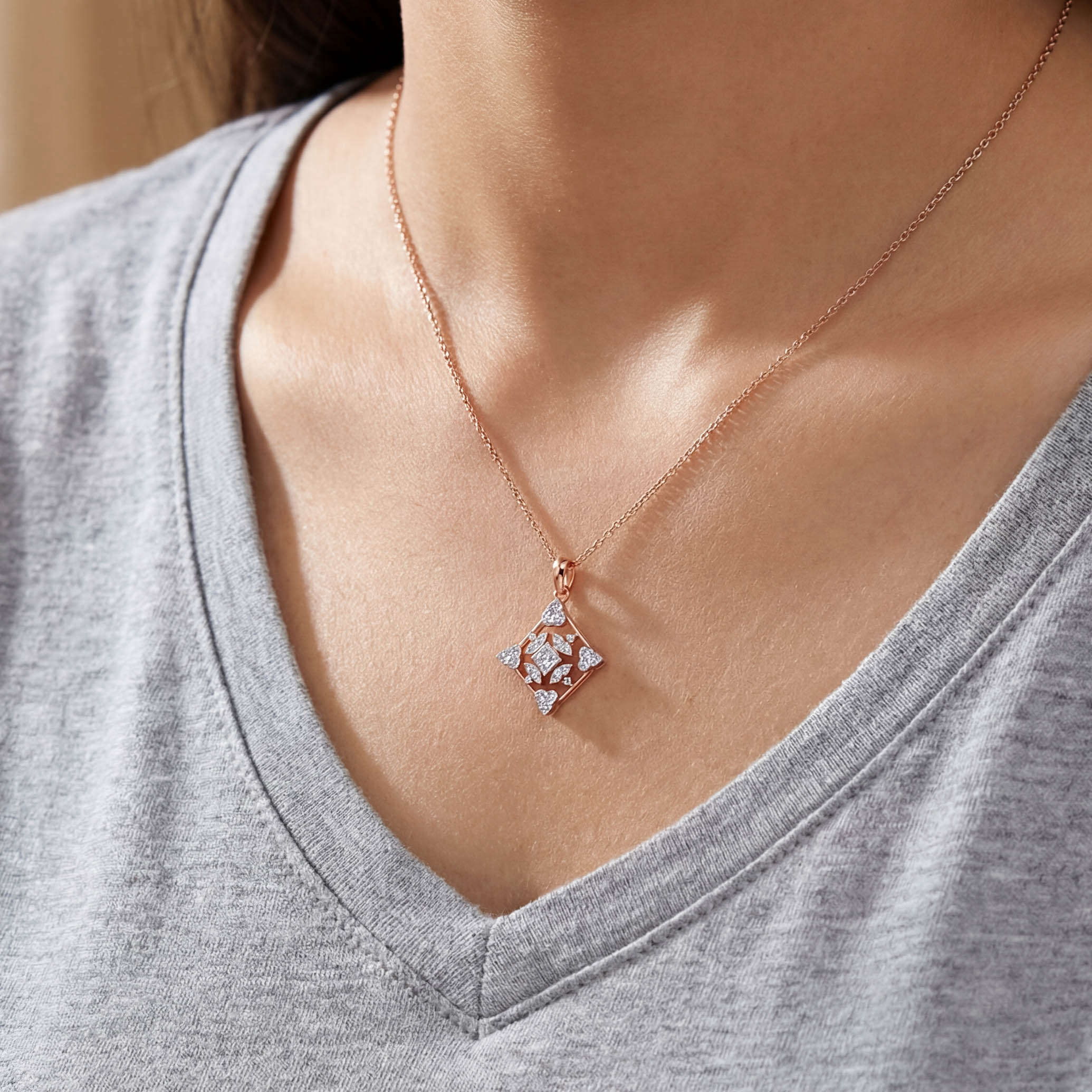 Inspired by vintage romance, this diamond pendant blends graceful symmetry with delicate, lace-like detailing in a refined rhombus form. Diamond accents add a soft sparkle, evoking the elegance of mid-century heirlooms with a timeless appeal. Style it with silk saris, fluid drapes, or a classic blouse in soft neutrals or jewel tones for understated, old-world charm.