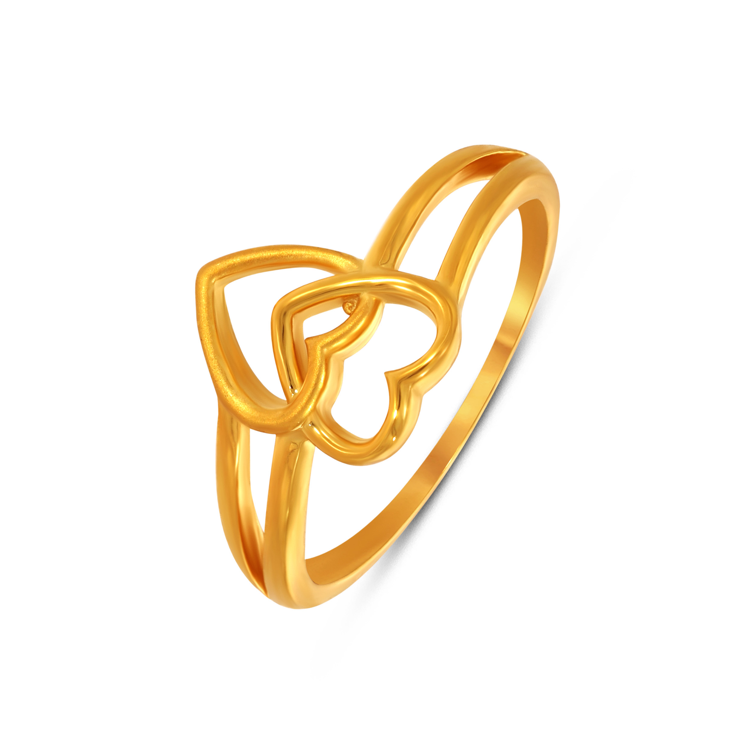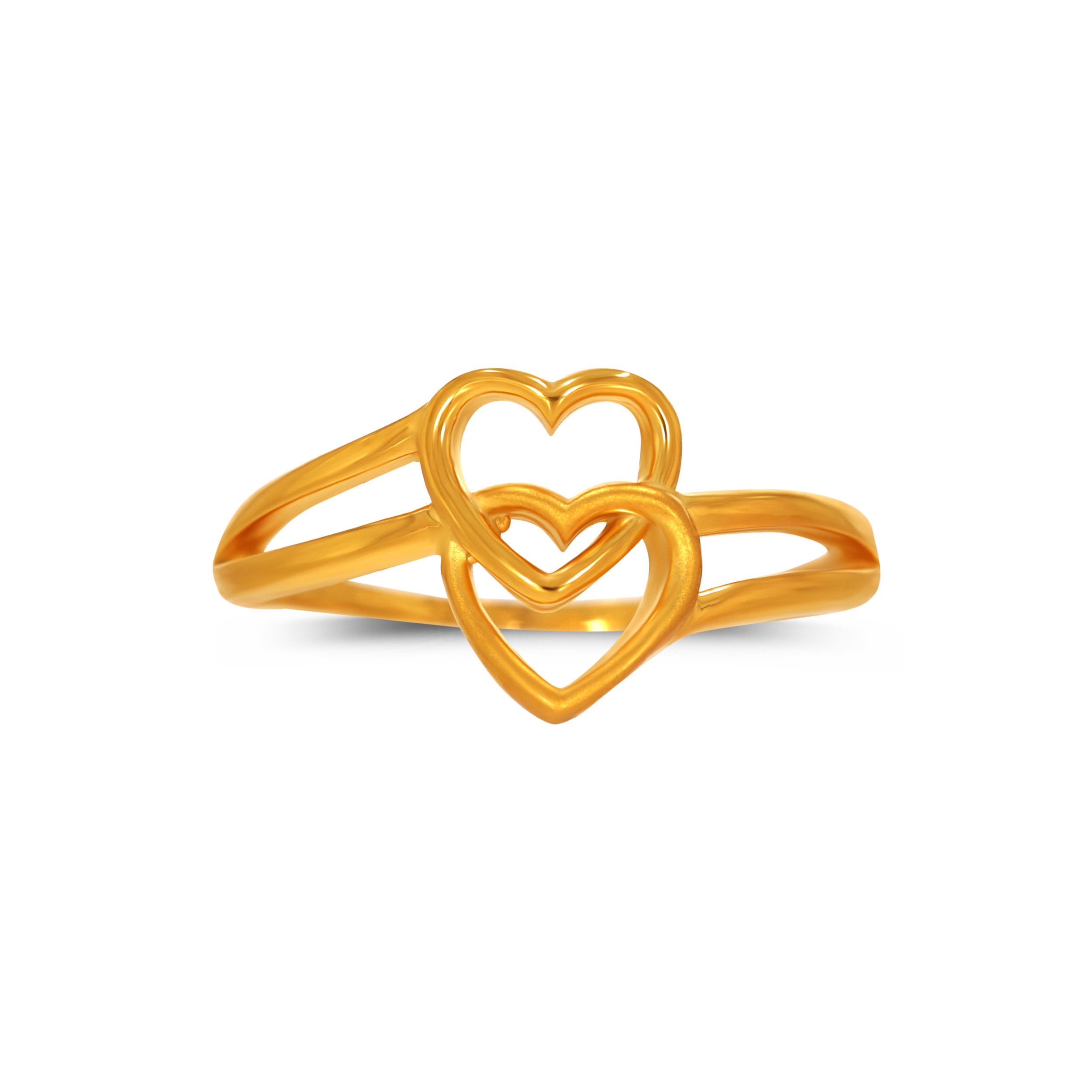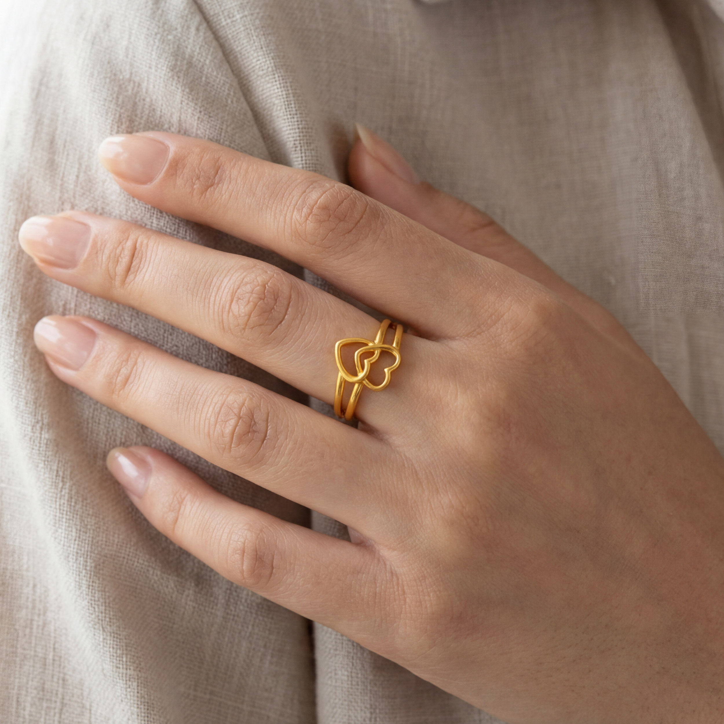 Two open hearts connect in a fluid embrace, giving this gold ring a modern yet sentimental appeal. Lightweight and easy to stack, it complements both workwear and weekend fits. Wear it with tailored separates or a chic jumpsuit.