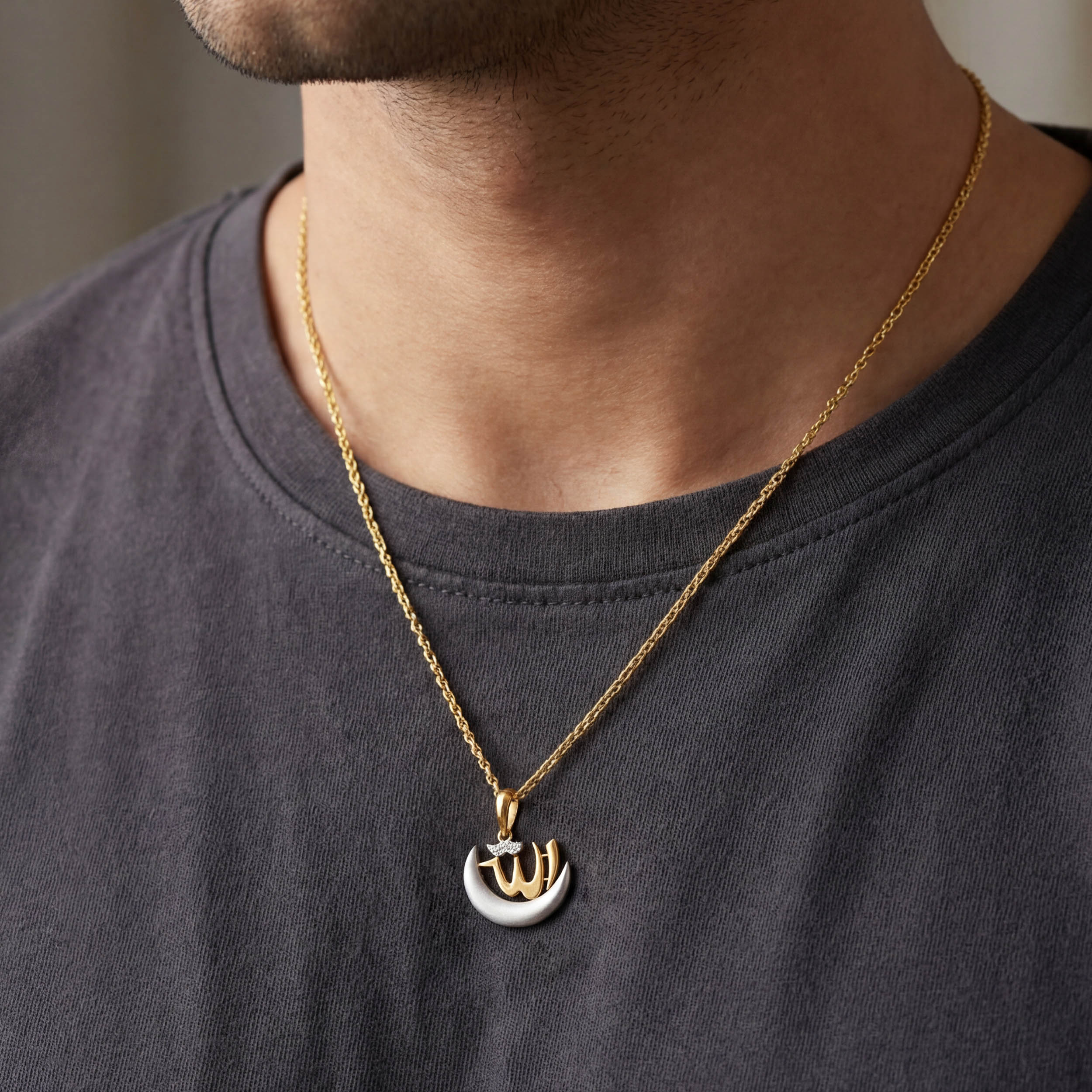 Crafted for men who lead with quiet authority, this pendant combines sculpted titanium with a commanding crescent form. A gold insignia highlighted with diamonds adds focus without excess, creating a strong visual contrast against the raw titanium finish. Balanced, deliberate, and unmistakably masculine. Style it with a black shirt, tailored trousers, or a dark blazer for a refined evening presence.