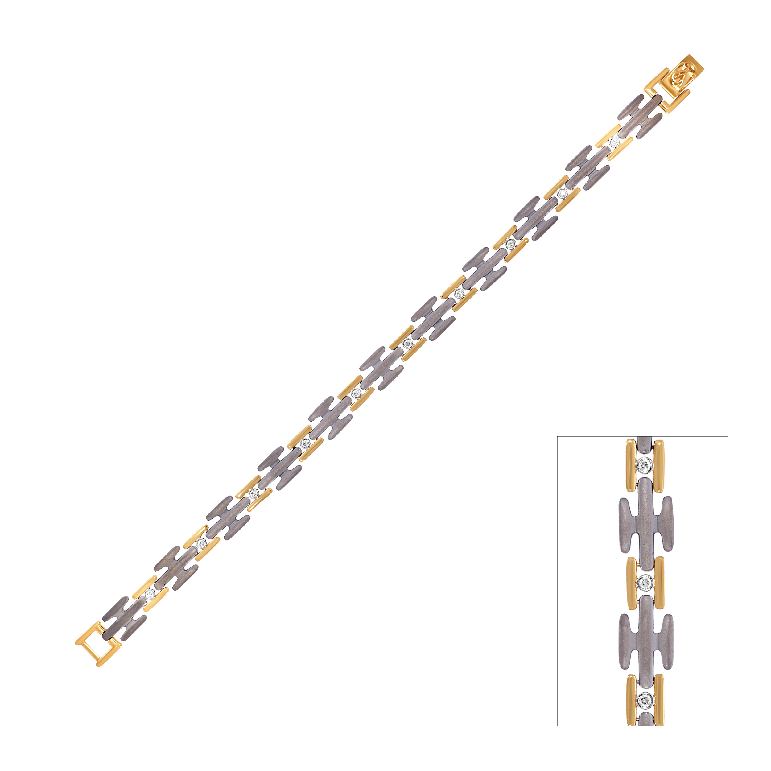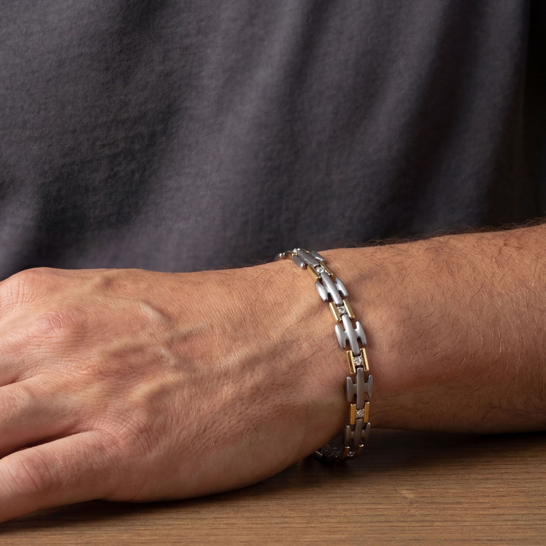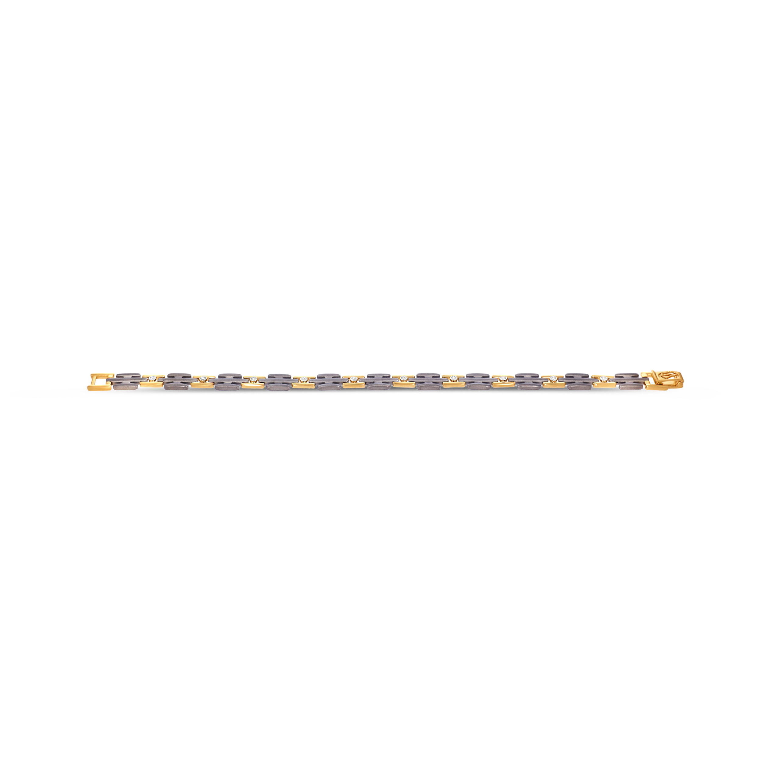 Built on clean lines and quiet contrast, this titanium wristlet combines matte links, gold accents, and bezel-set diamonds for a controlled, modern edge. Structured yet understated, it moves easily from work to weekend without trying too hard. Style it with a crisp white shirt and a steel watch for a sharp, effortless finish.