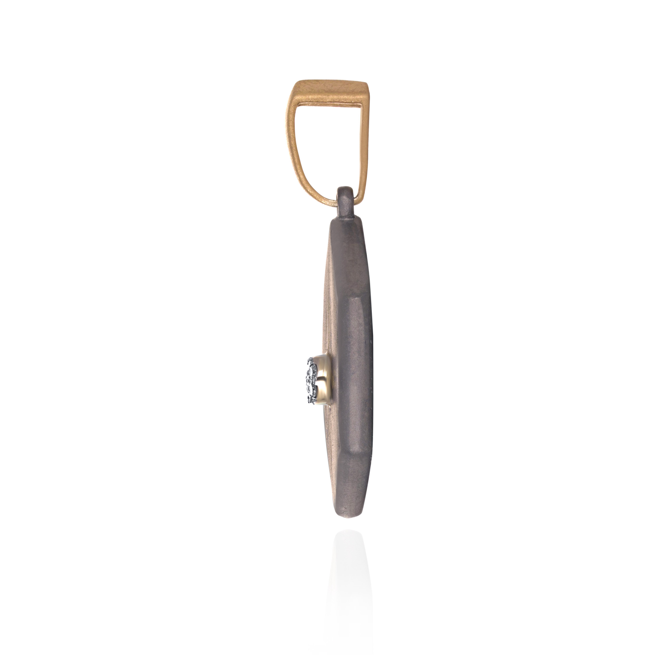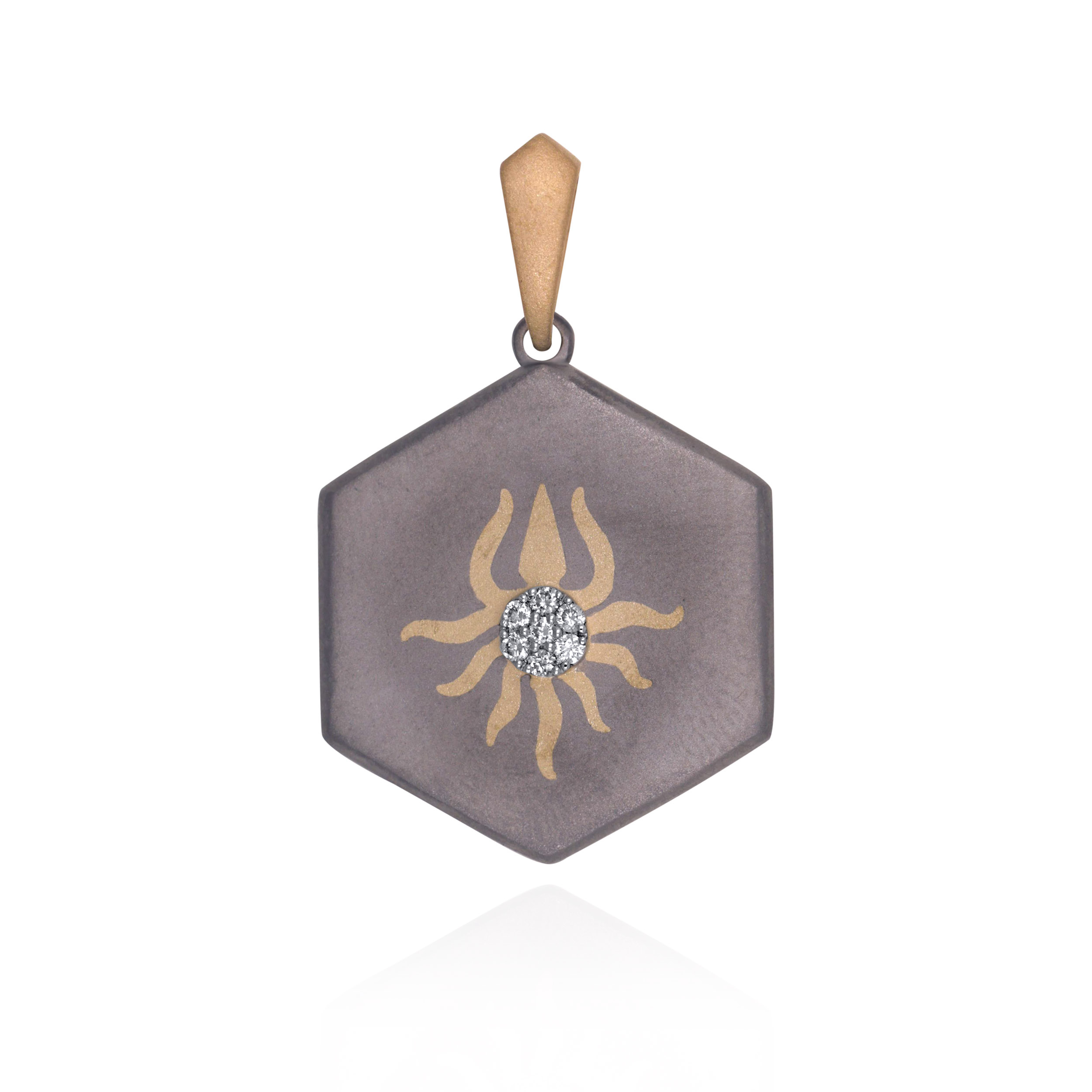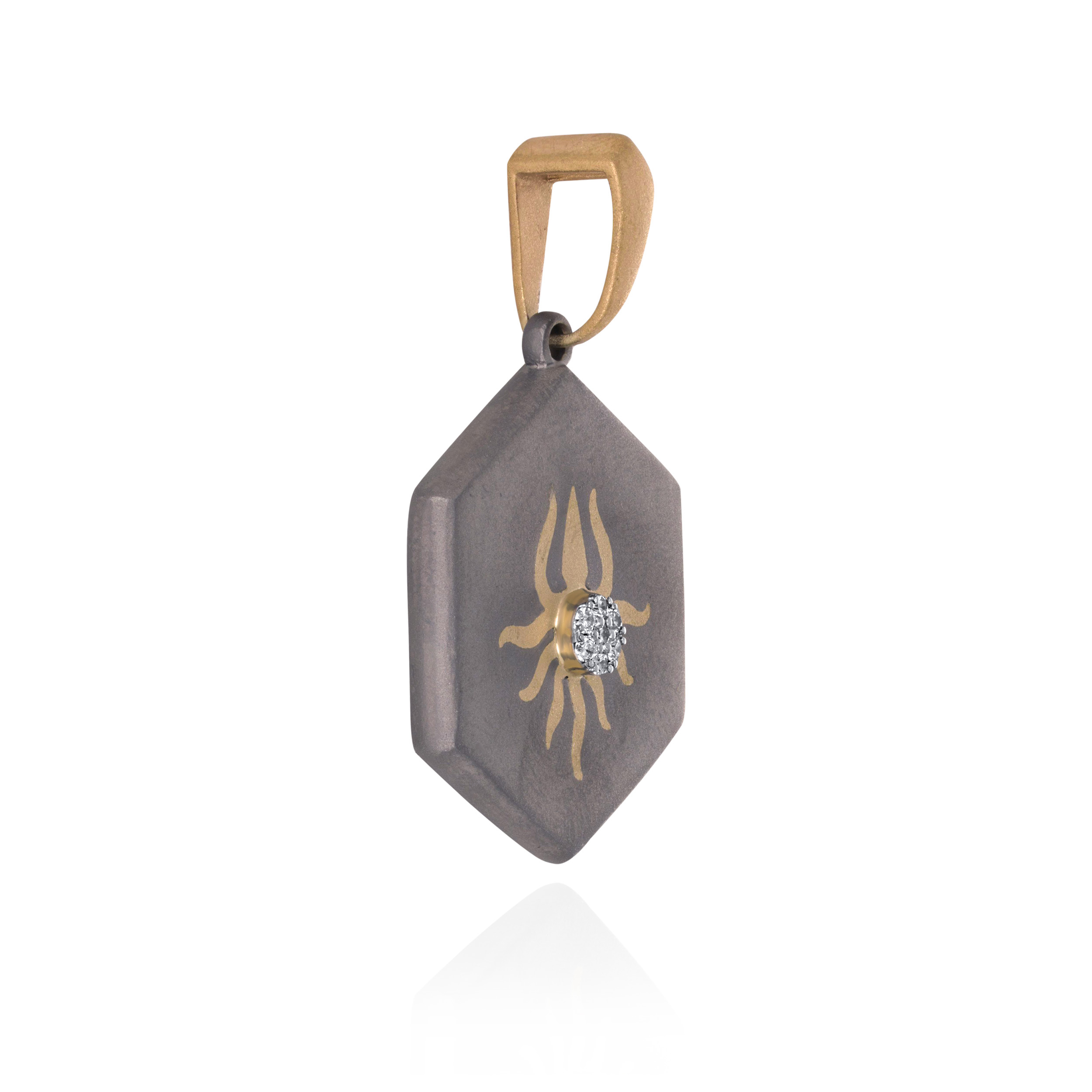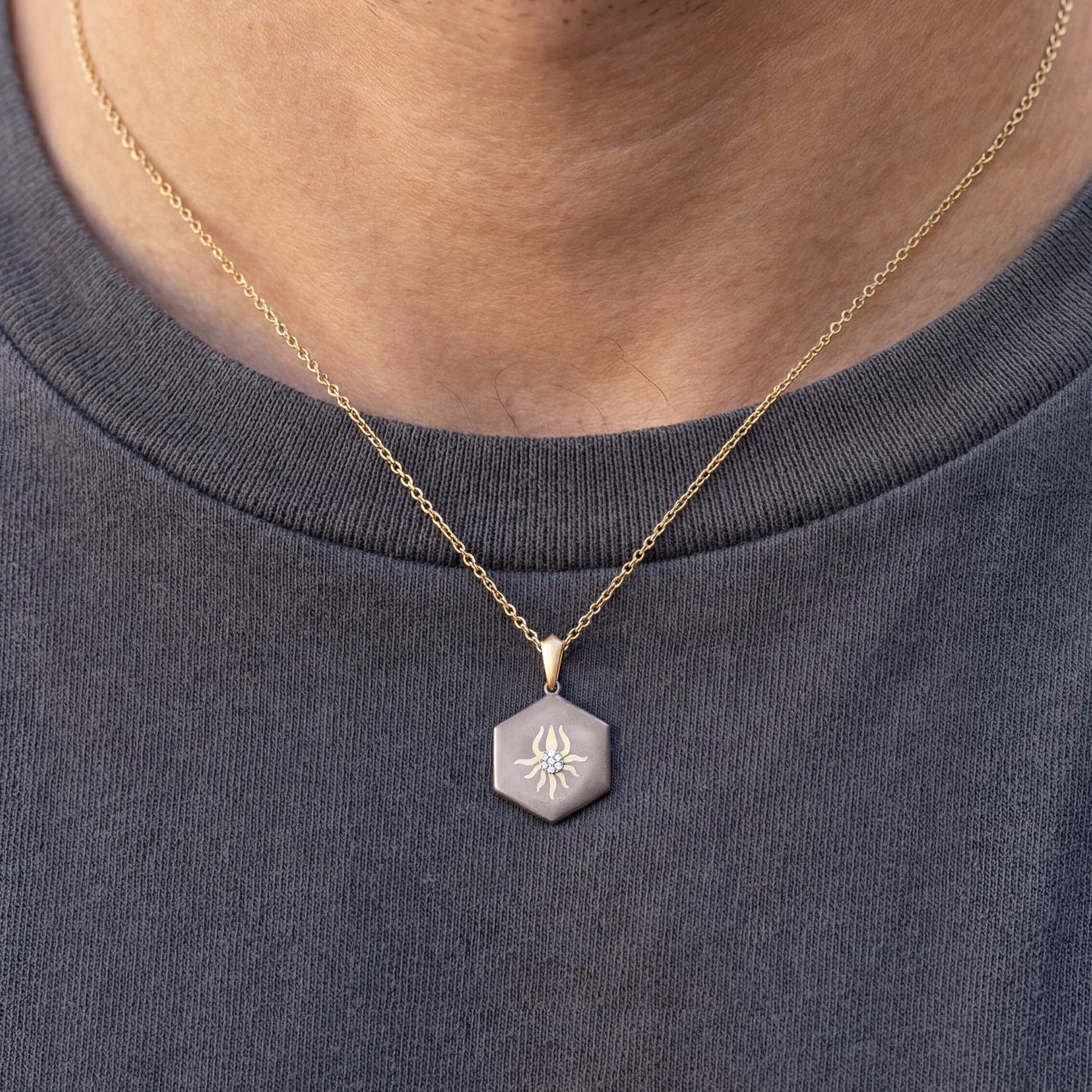 Inspired by elemental power, this hexagonal titanium pendant is centred with a radiant diamond core surrounded by a gold motif. The design balances industrial resilience with ancient symbolism, offering a bold geometric silhouette for the modern man. It is a sophisticated statement piece that reflects clarity, discipline, and an unbreakable spirit. Wear it over a simple tee with sharp tailoring for an understated, everyday statement.