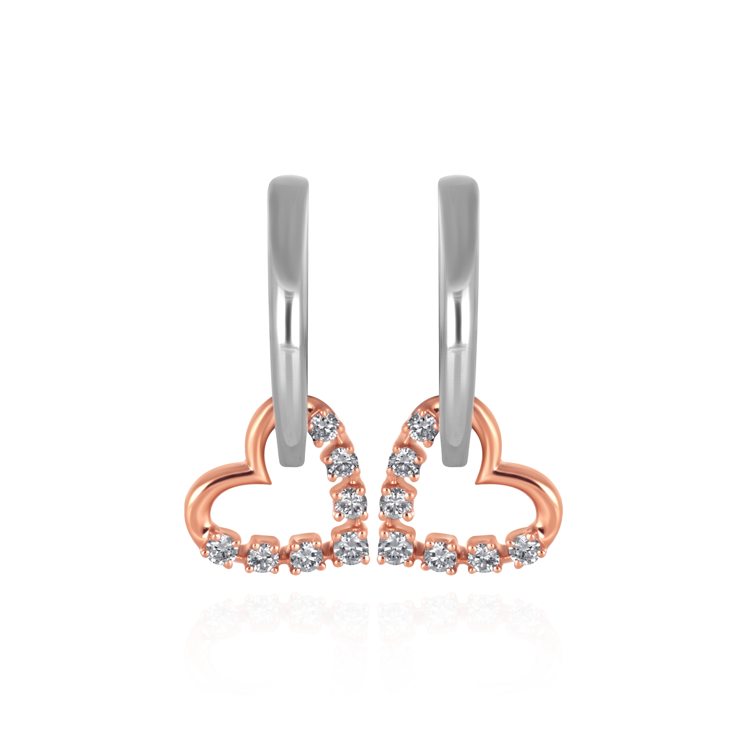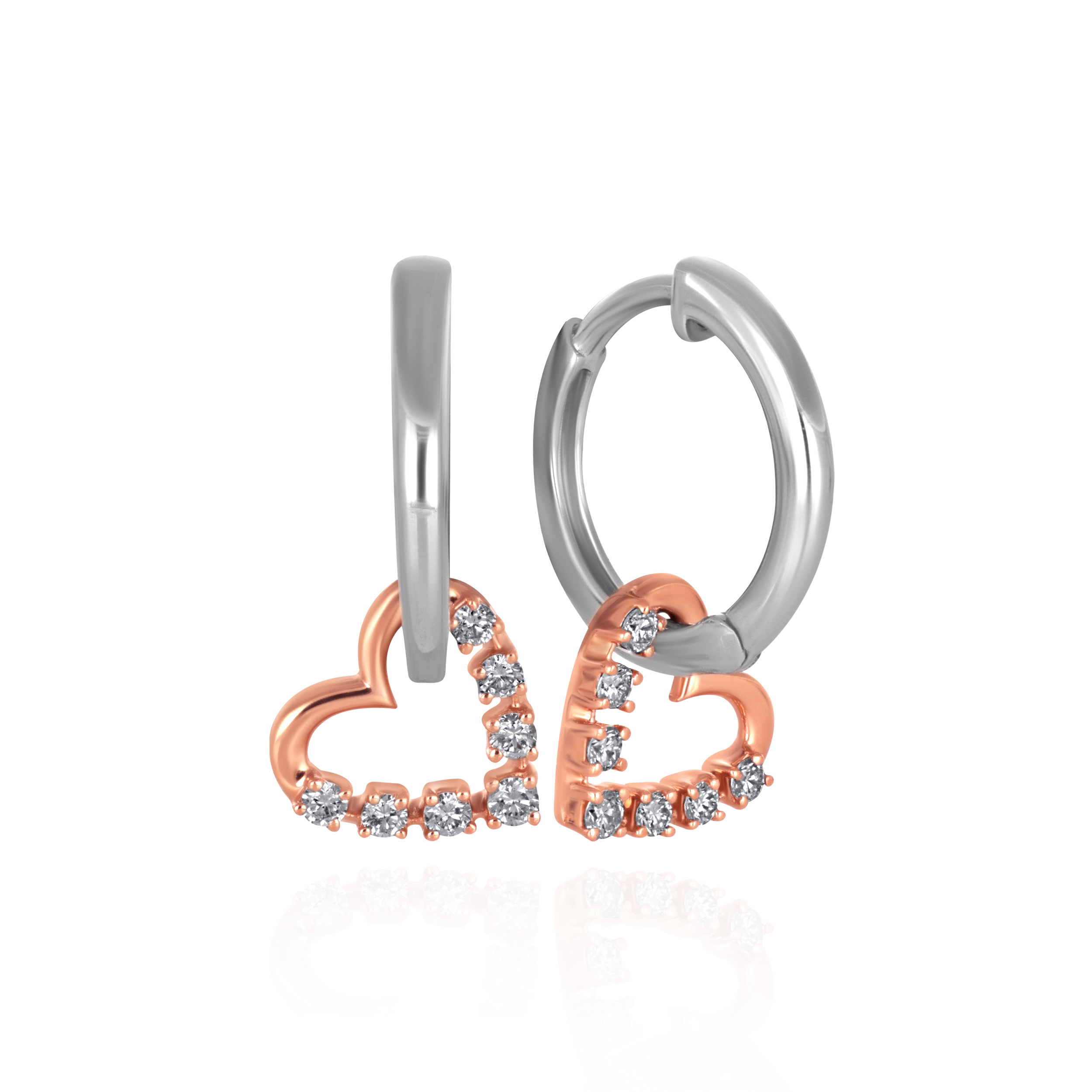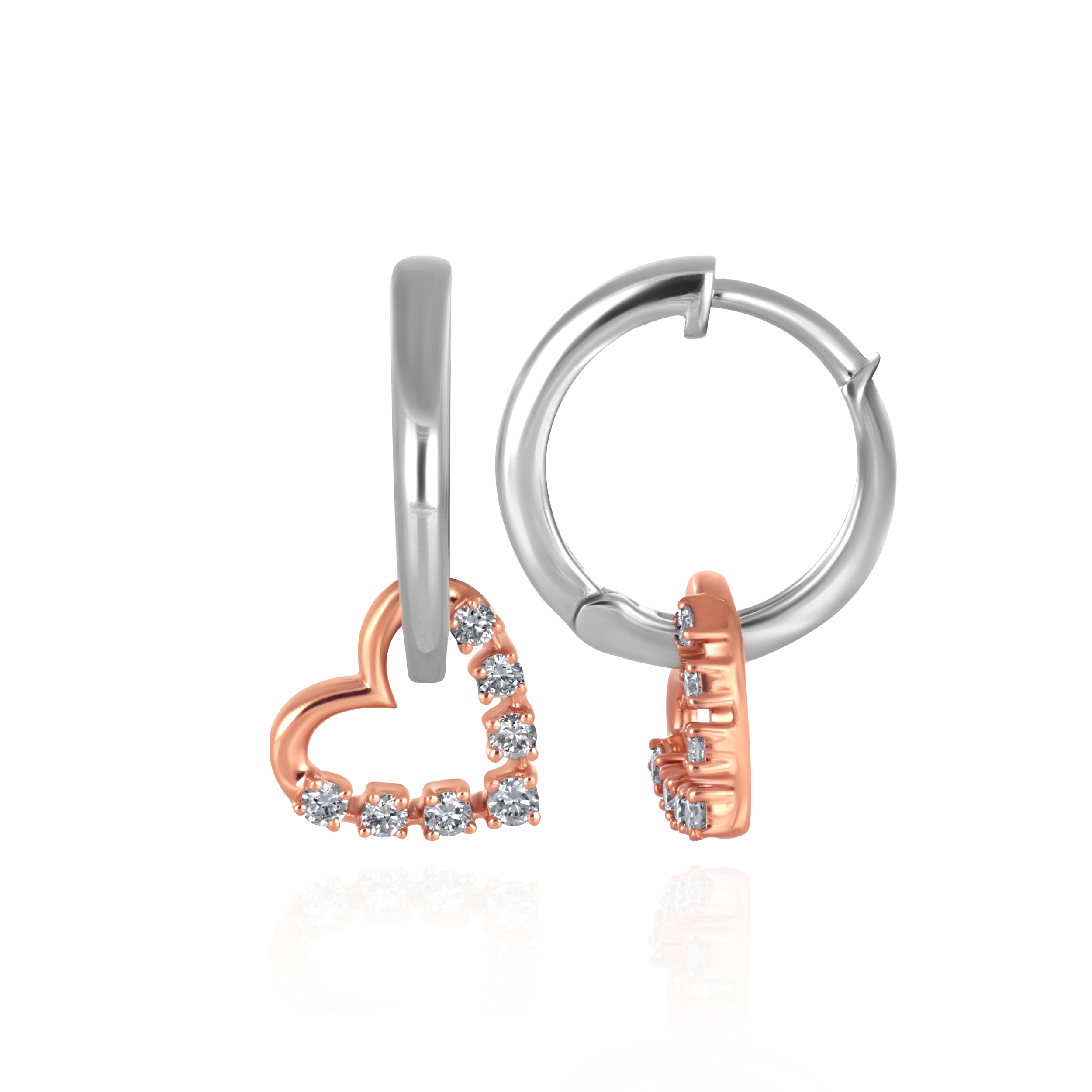 Modern elegance meets playful symbolism in these dual-tone hoops. Sleek platinum hoops frame heart charms, each set with diamonds for a soft, refined sparkle that transitions effortlessly from day to night. Whether styled with relaxed daytime looks or worn as a polished accent for a romantic evening, these earrings add a touch of charm and contemporary sophistication to your daily moments.