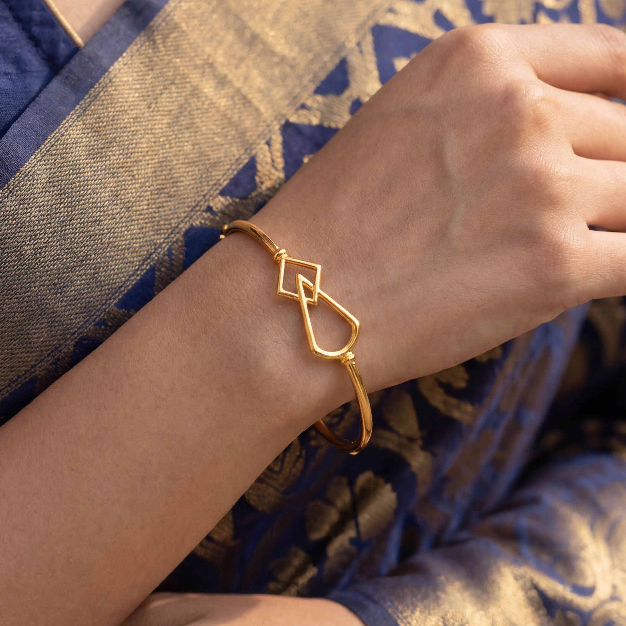 Make a statement of simplicity with this minimalist geometric gold chur, designed for everyday refinement. Defined by a sleek form and a distinctive clasp detail, it feels clean and quietly striking. Pair it with a satin slip dress for a soft, evening-ready look.