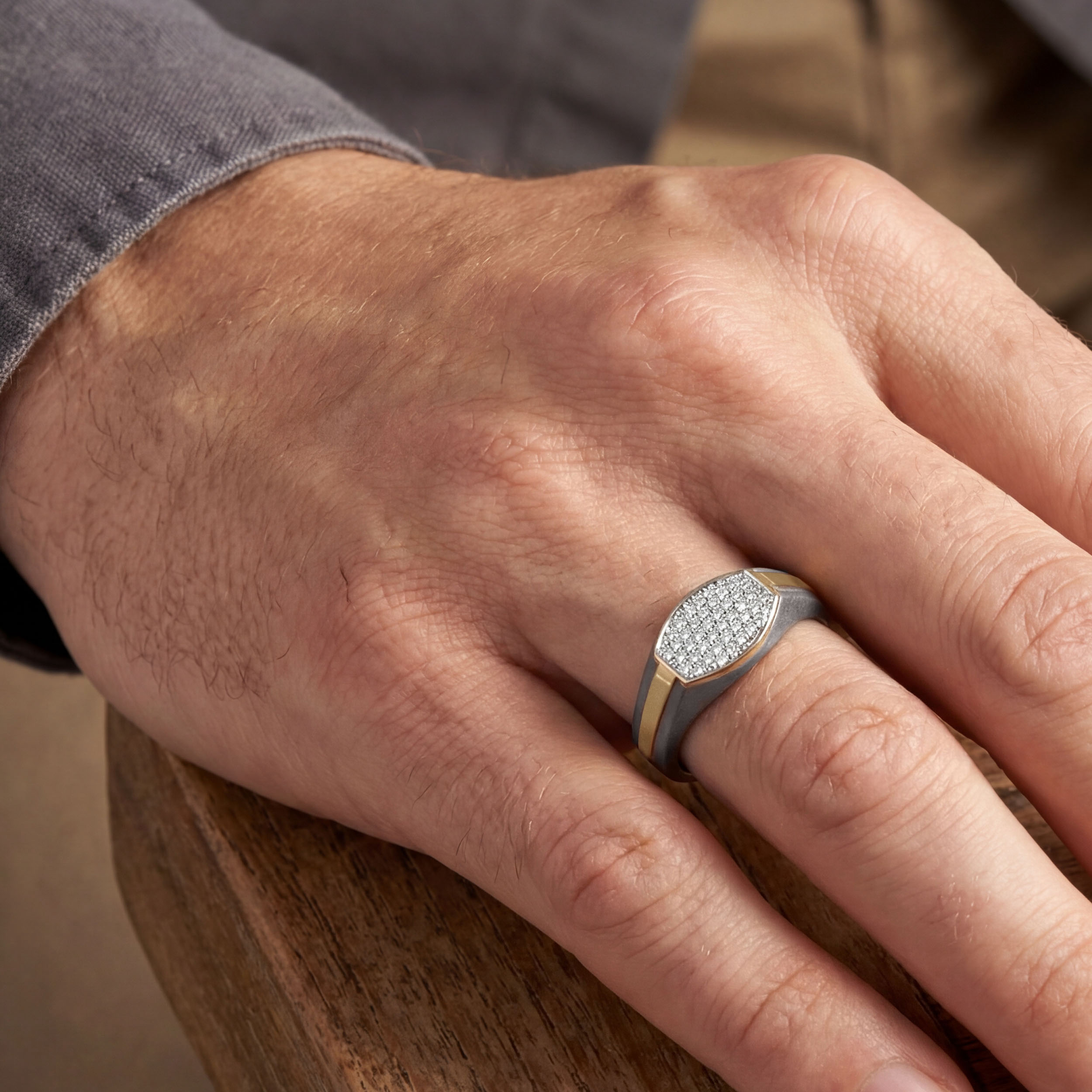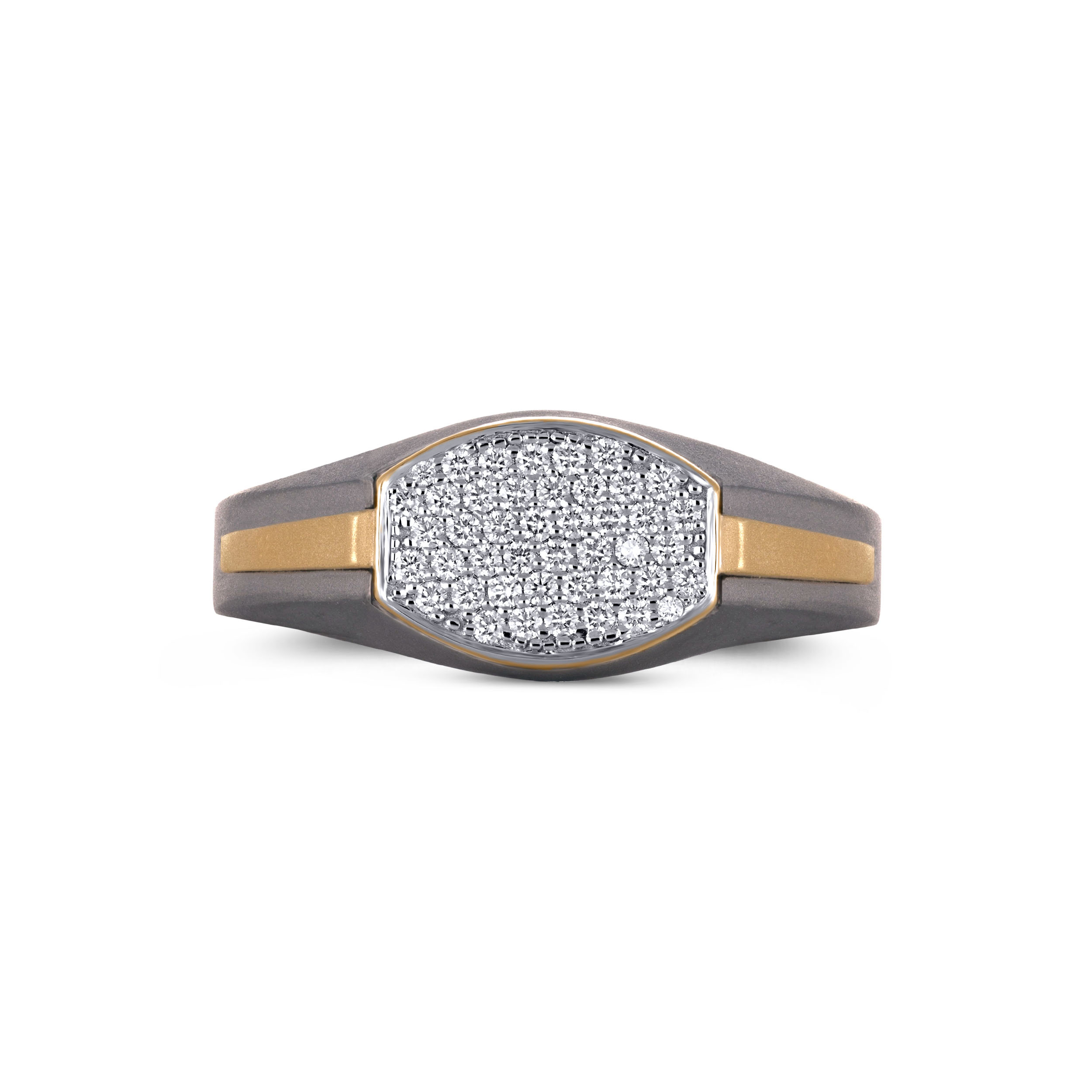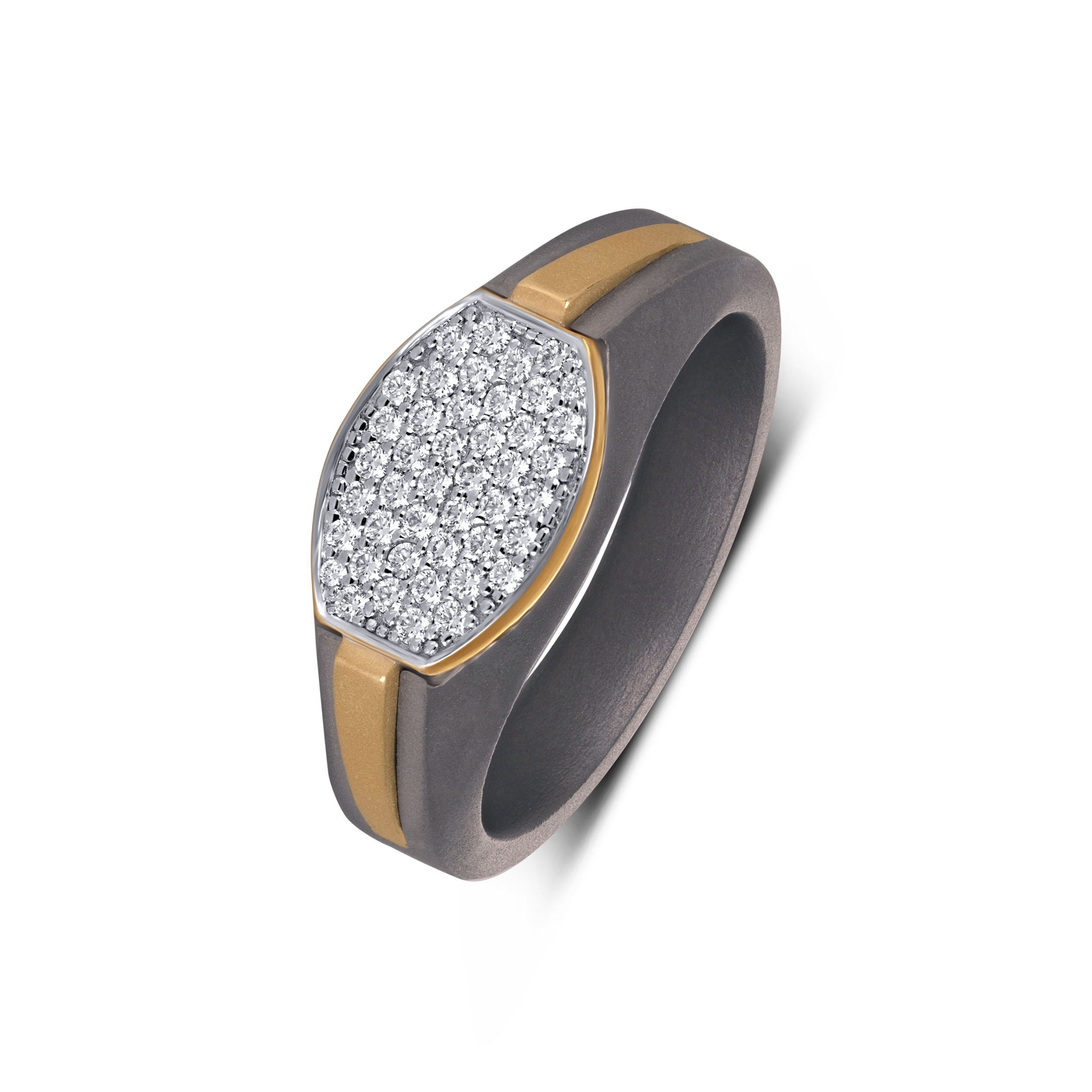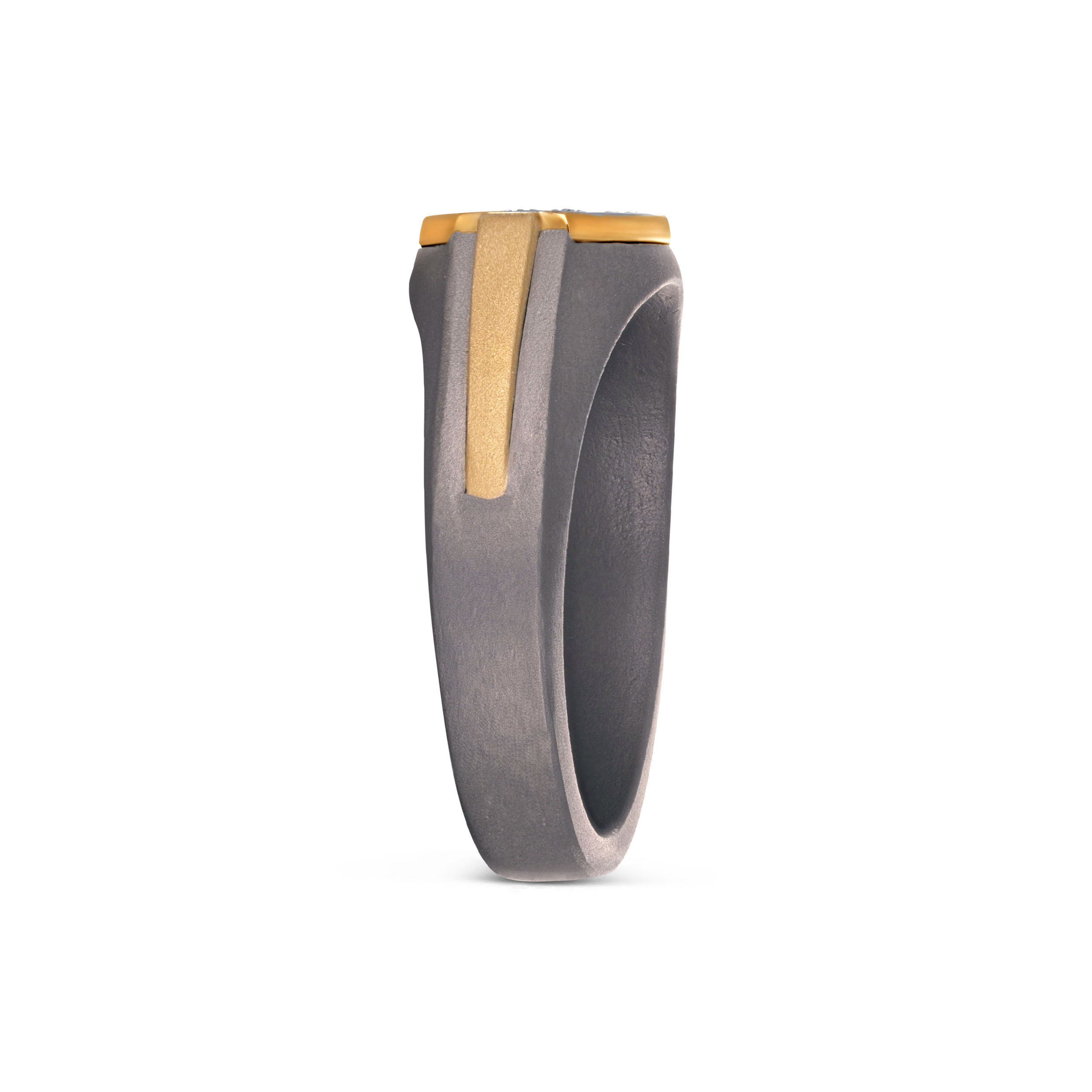Precision takes centre stage in this titanium diamond ring defined by a sleek, faceted diamond panel. The dense diamond setting is framed by smooth gold accents, set against a matte charcoal titanium band that grounds the design with strength. Clean lines and balanced proportions give it a confident, architectural presence without excess.