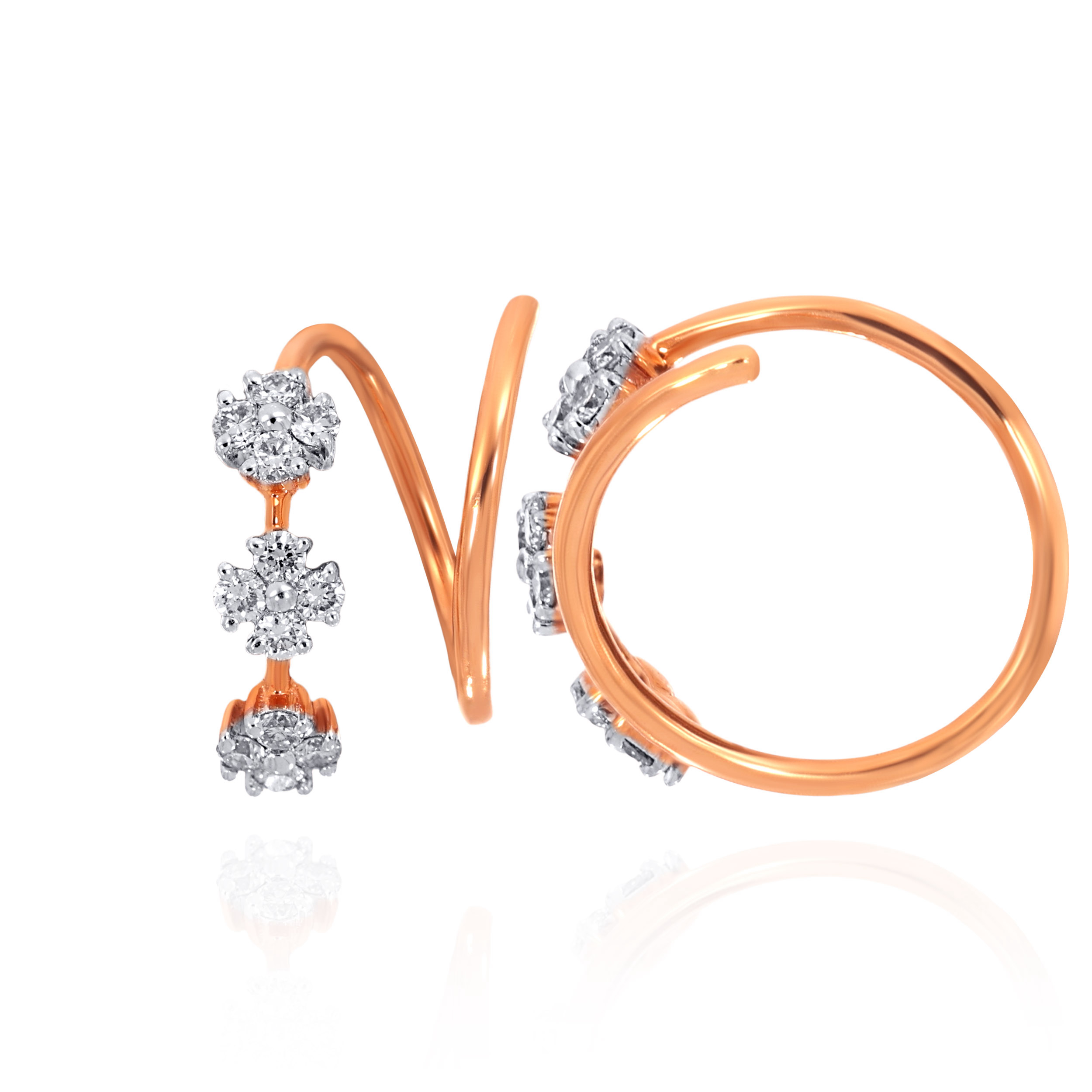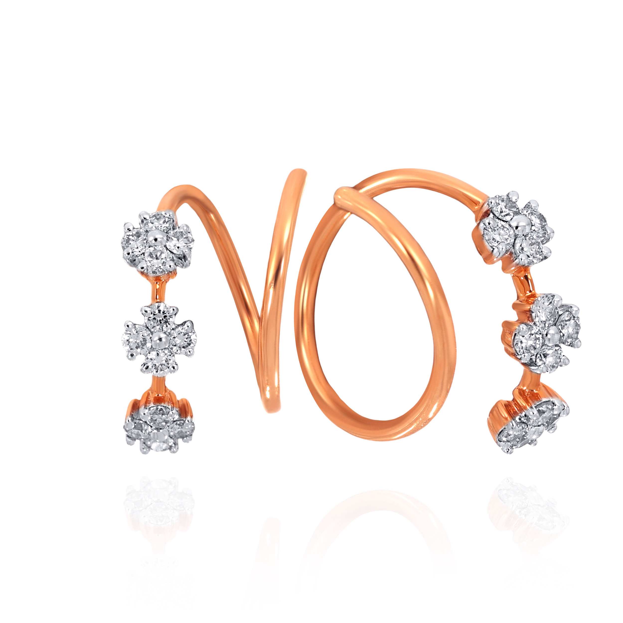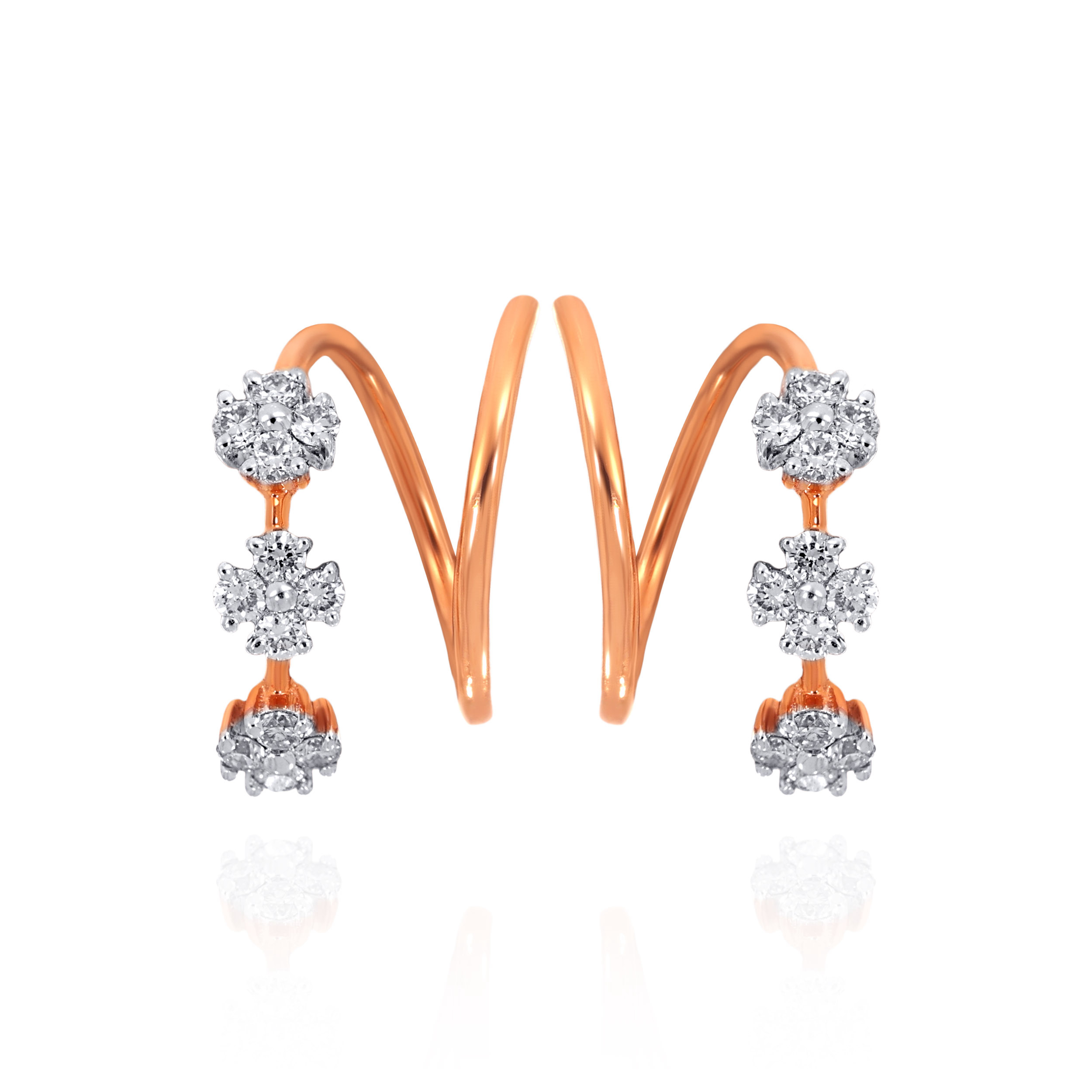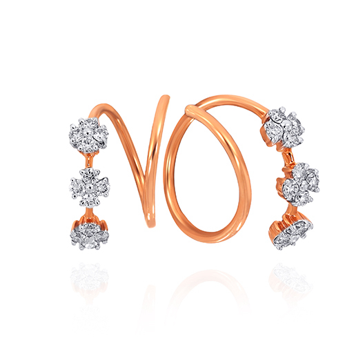 Designed in a fluid spiral silhouette, these diamond hoops feature floral clusters that shimmer with every turn. A modern statement that adds refined sparkle to evening looks and elevated daywear alike, style them with sleek gowns, structured sarees, or a tailored blazer for a polished finish.