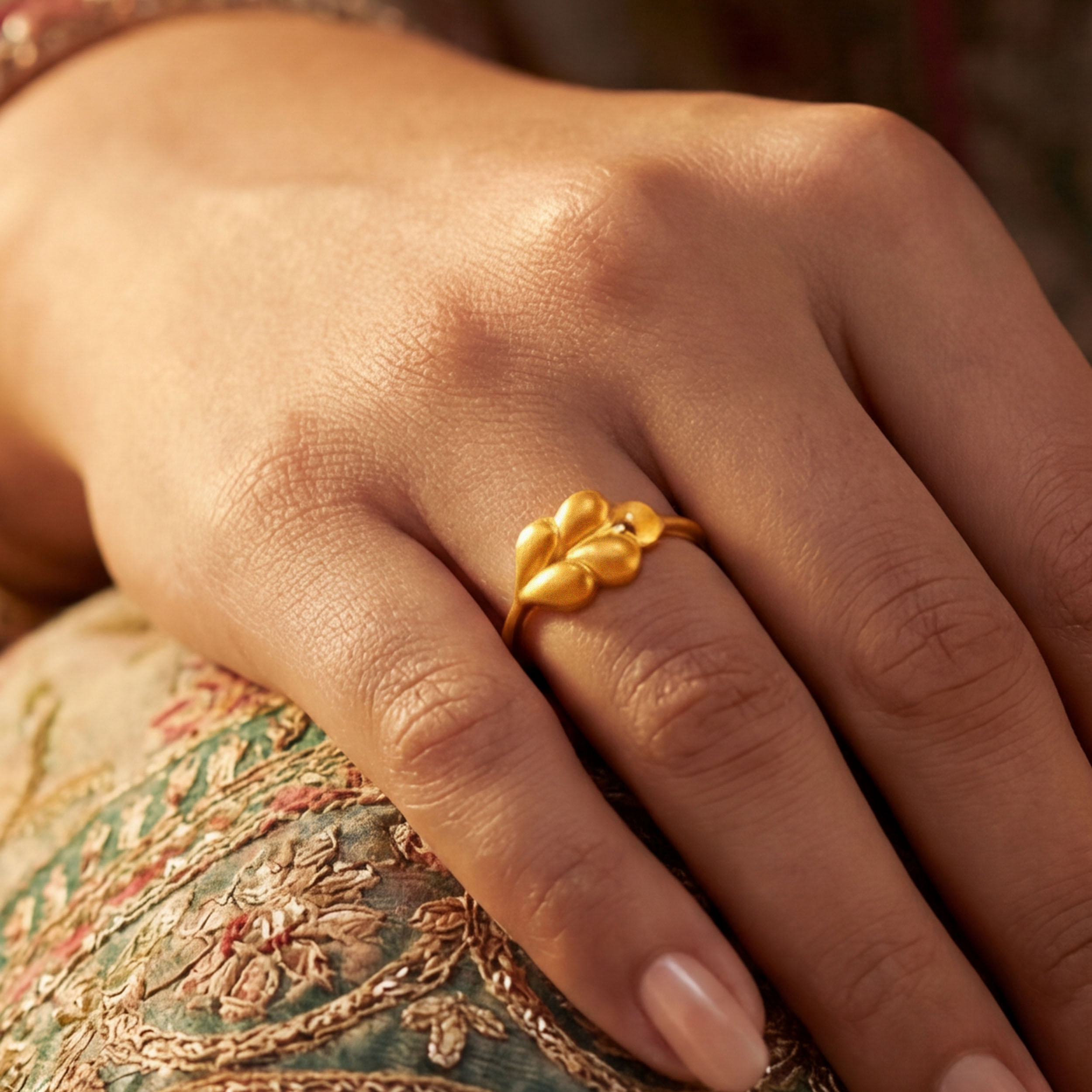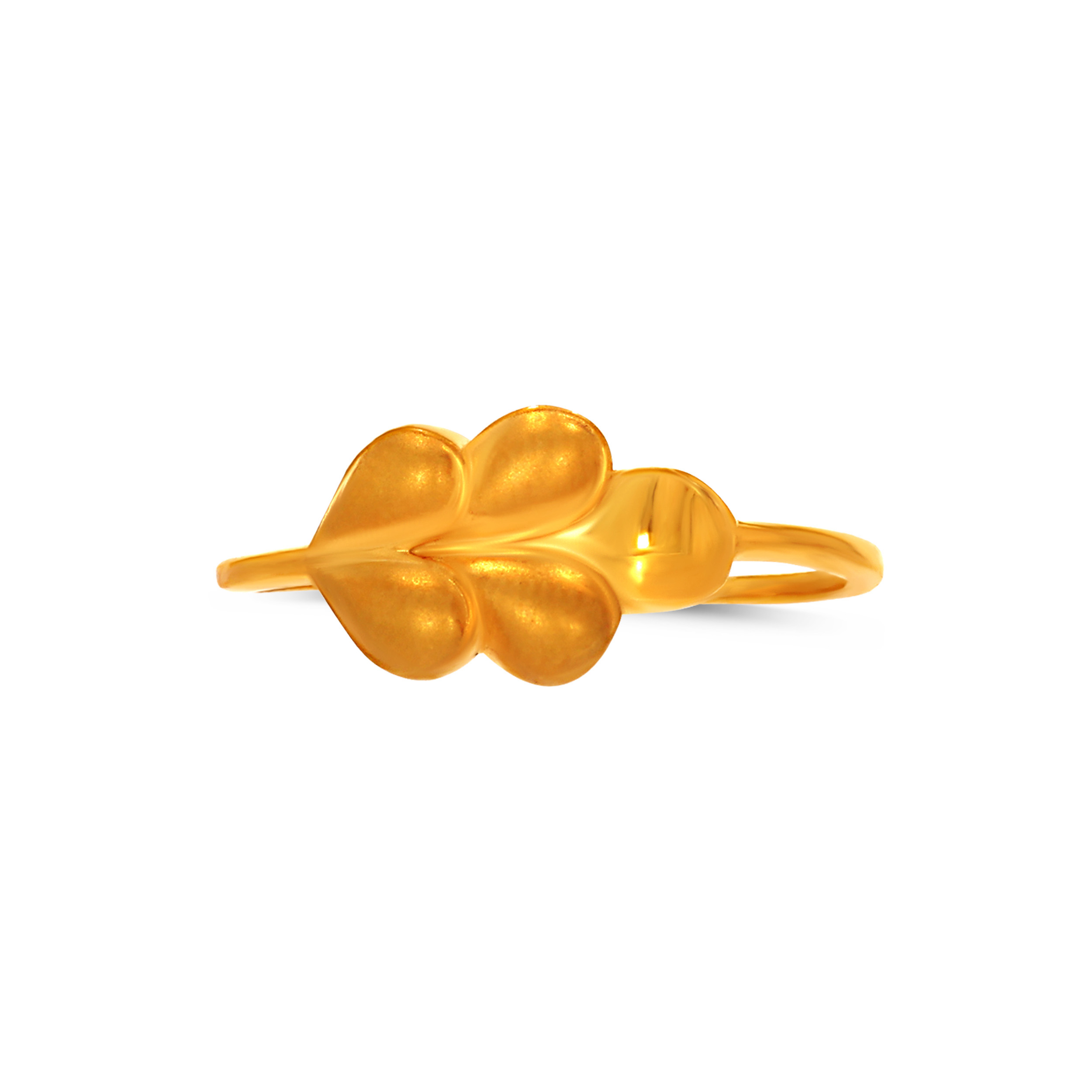 This gold ring features a petite clover inspired motif, where softly rounded petals create a charming yet refined accent. Delicate and understated, it adds a playful touch to minimalist styling and pairs effortlessly with versatile everyday outfits.