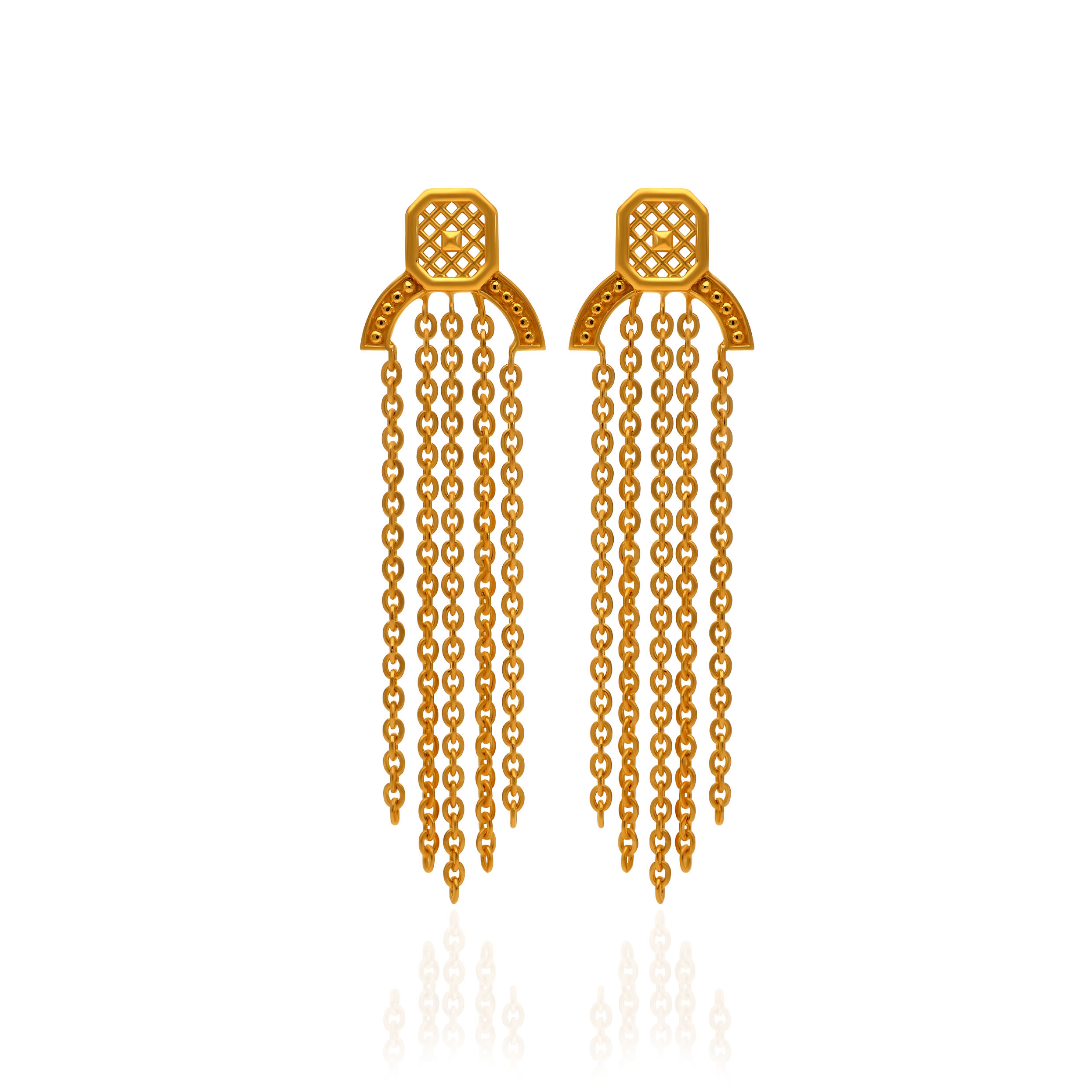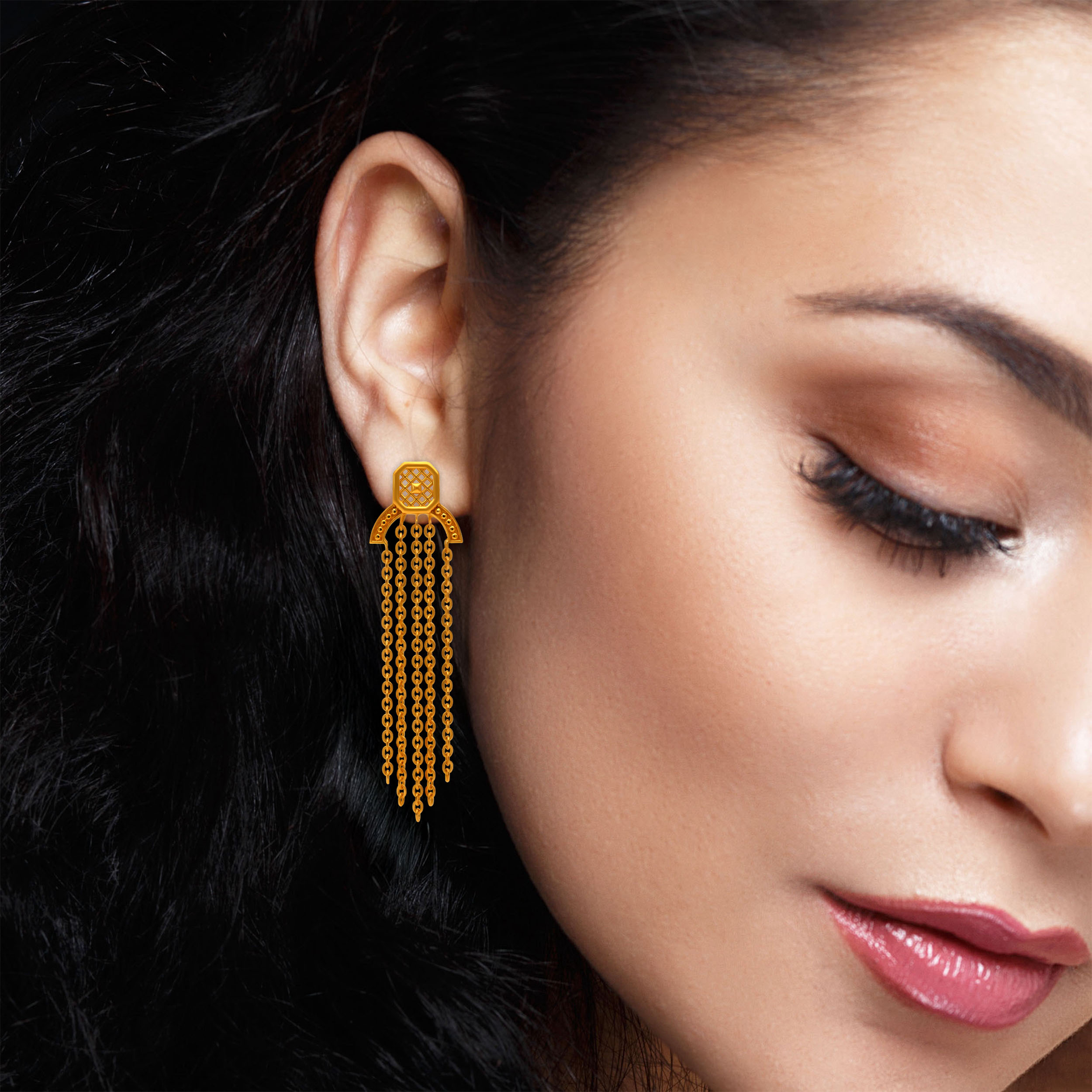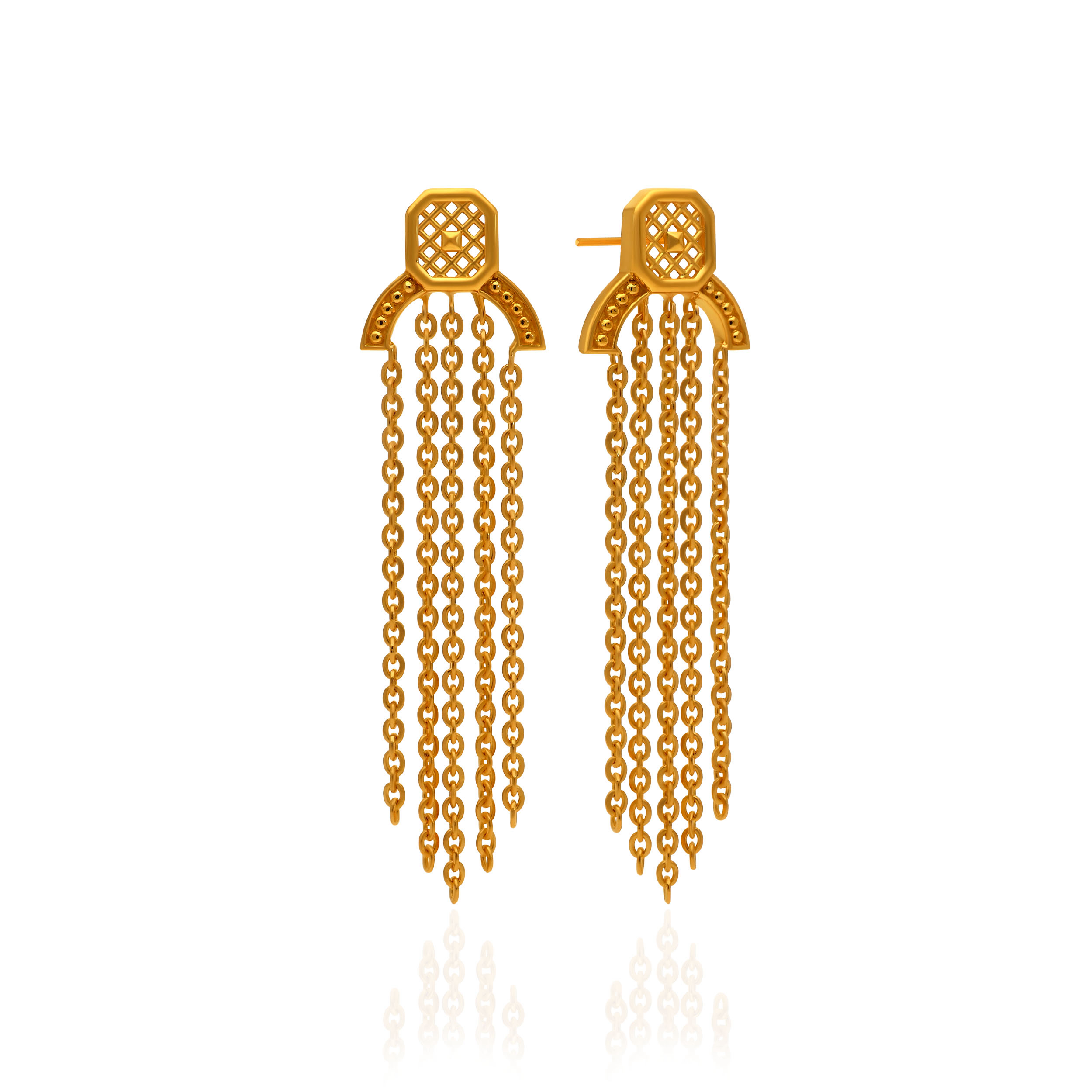 Elevate your elegance with cascading gold chains that move effortlessly with you. Designed to elongate the silhouette, these earrings bring fluid sophistication to evening and festive looks. An effortless match for cocktail looks, festive evenings, and formal gatherings.