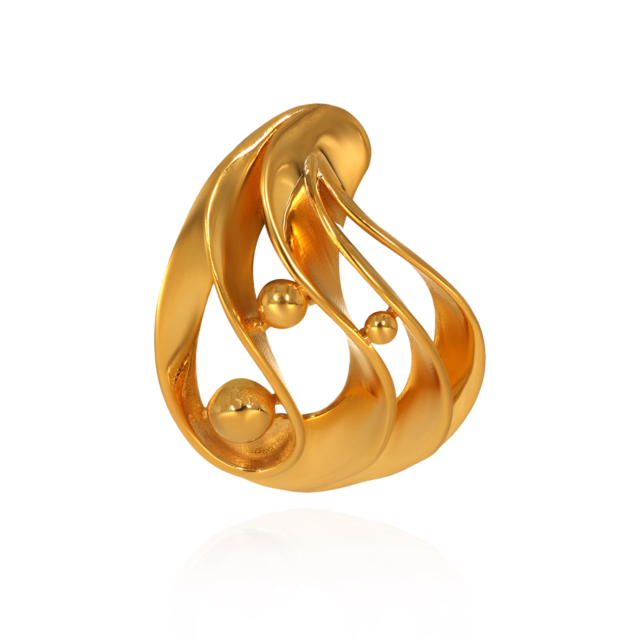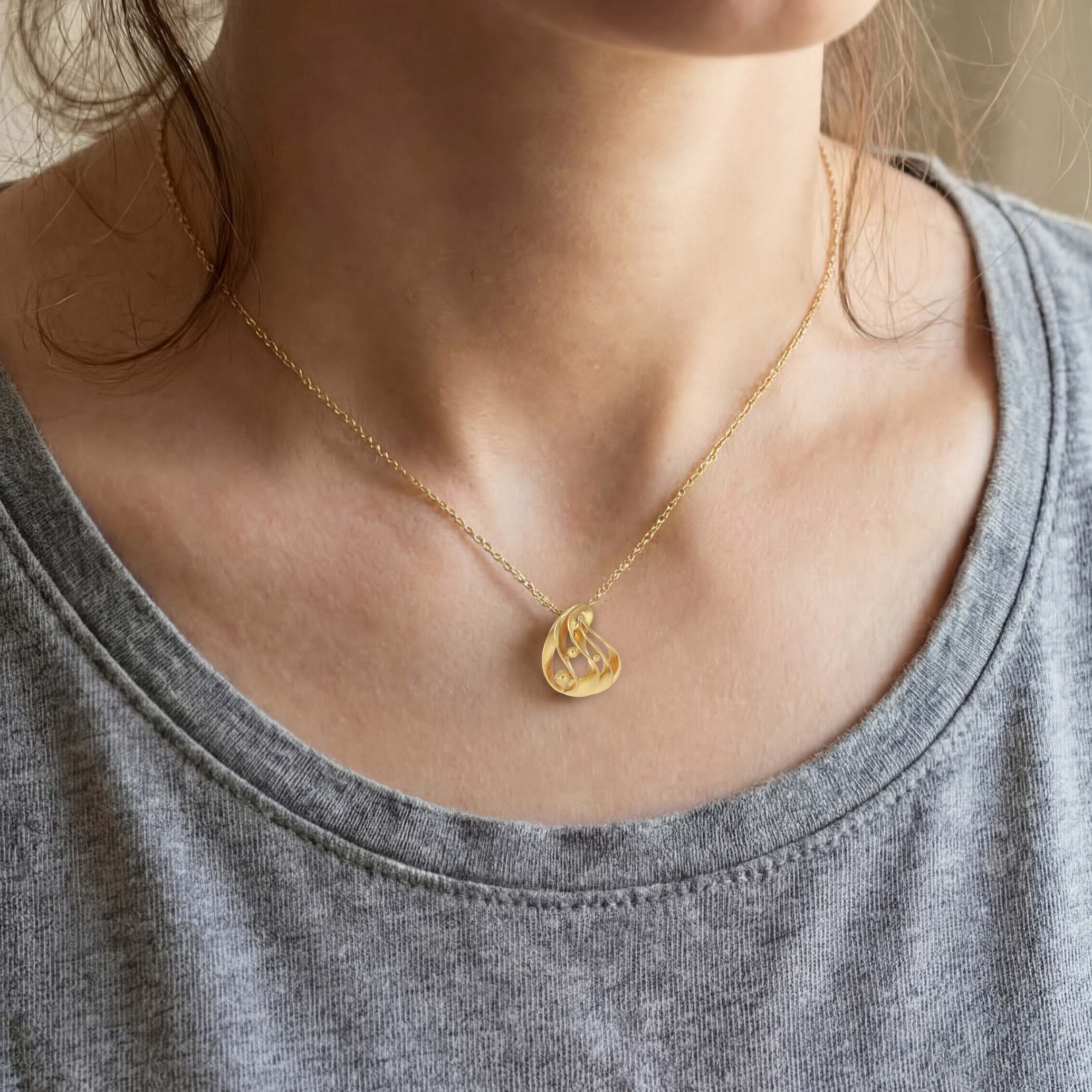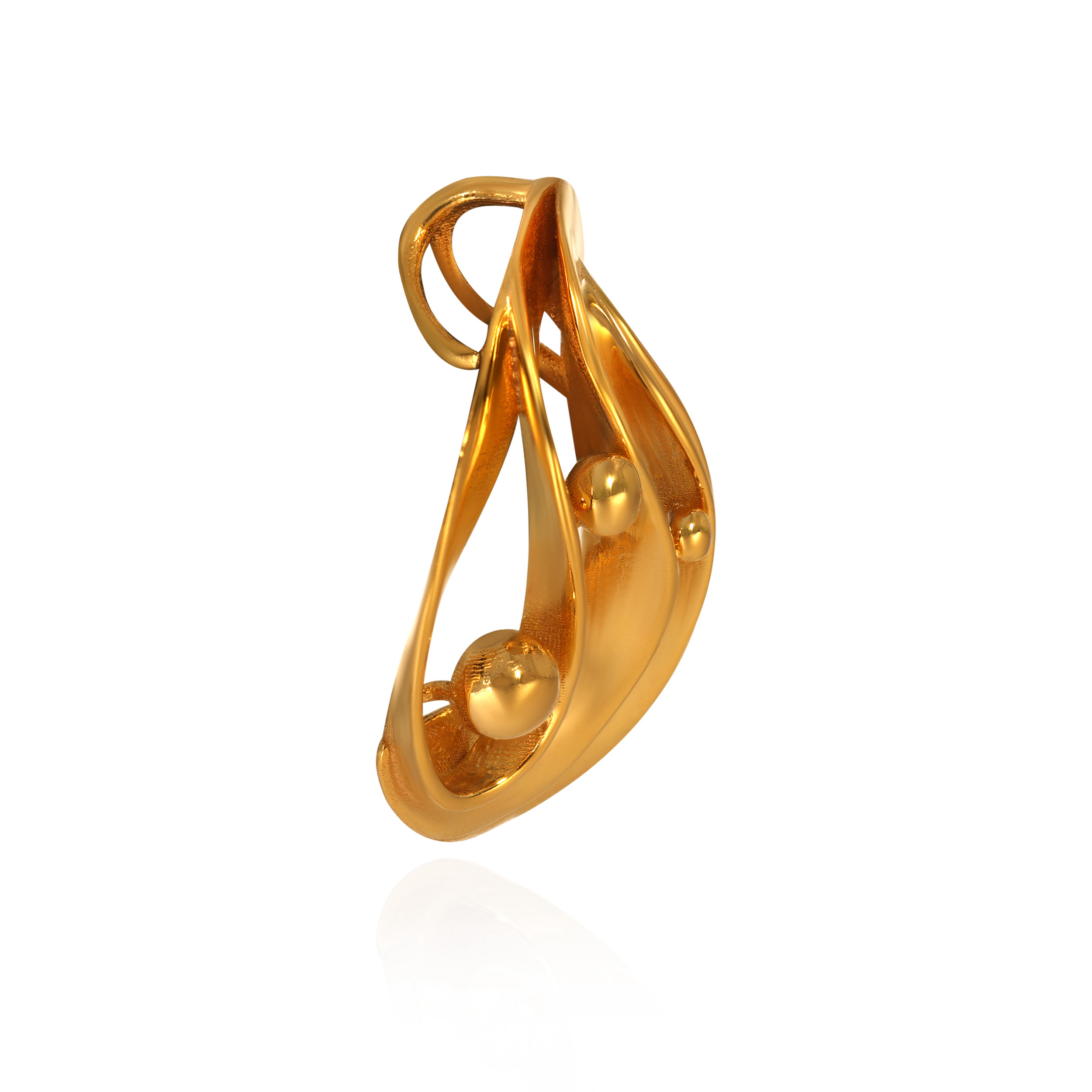 With its flowing, dimensional form, this gold pendant feels both artistic and intentional. Soft spherical accents add depth and movement, creating a bold yet balanced statement perfectly suited to elevated modern styling.