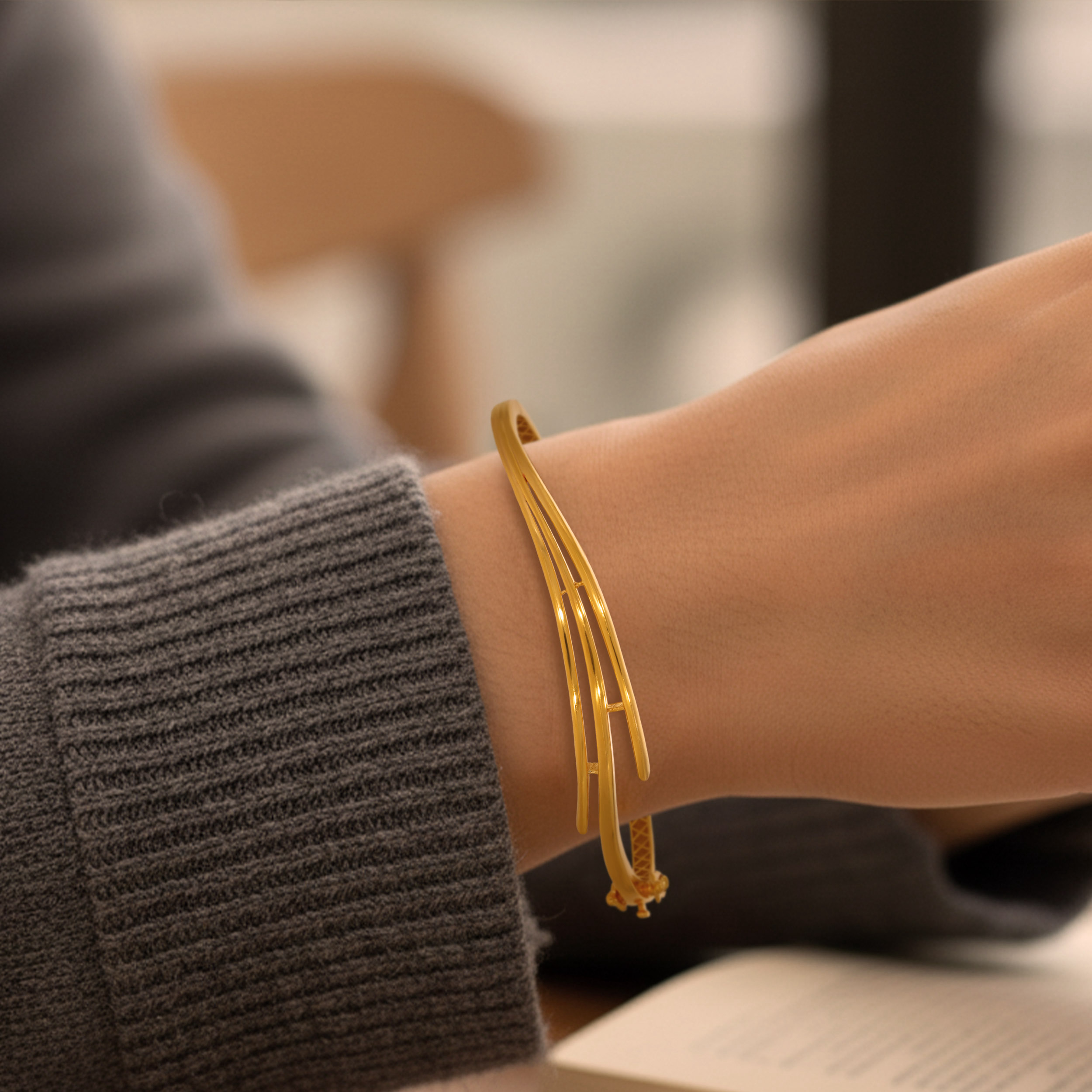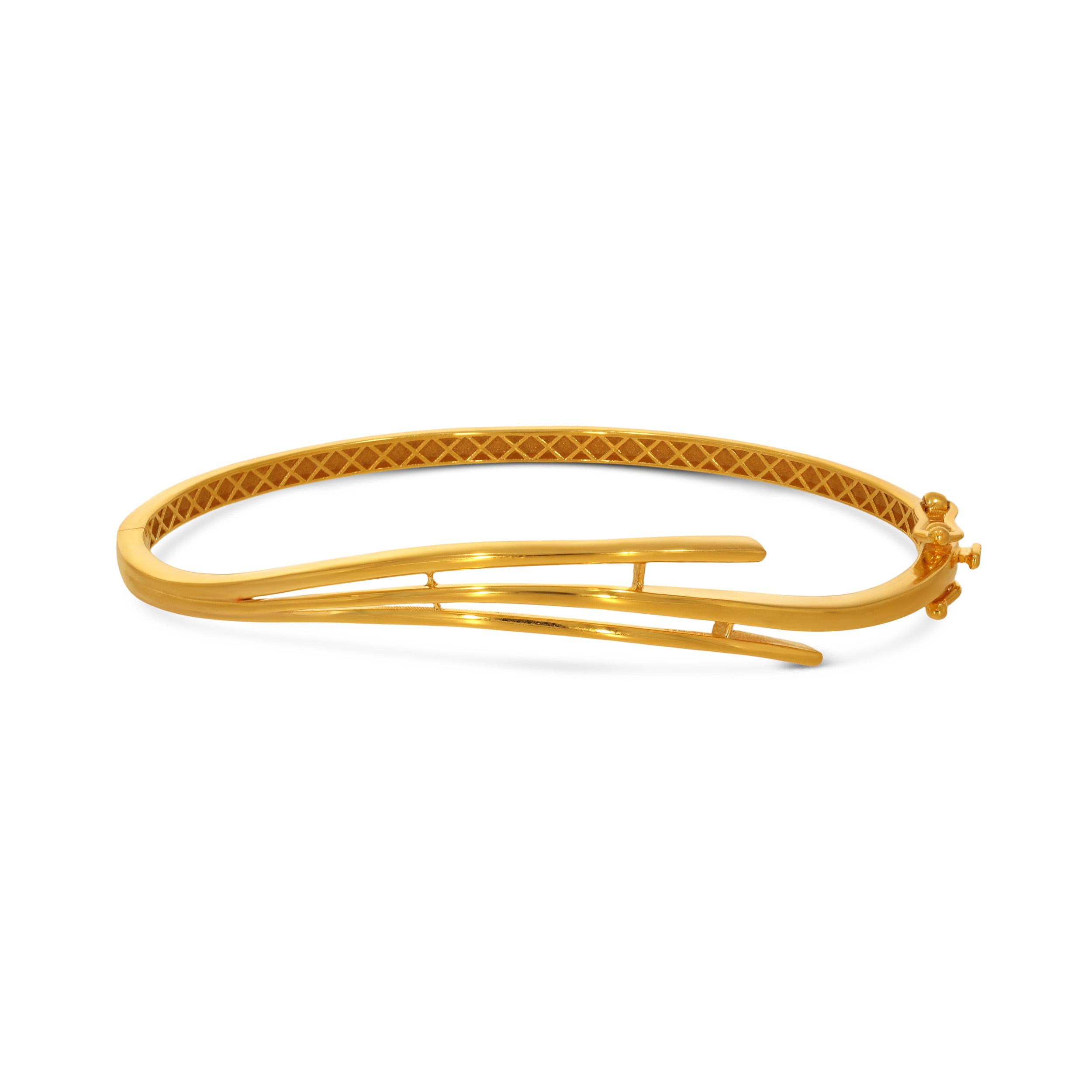 Elevate your everyday style with this sleek gold chur shaped by flowing linear forms and subtle geometric detailing. Lightweight and refined, its fluid silhouette transitions effortlessly from day to evening.