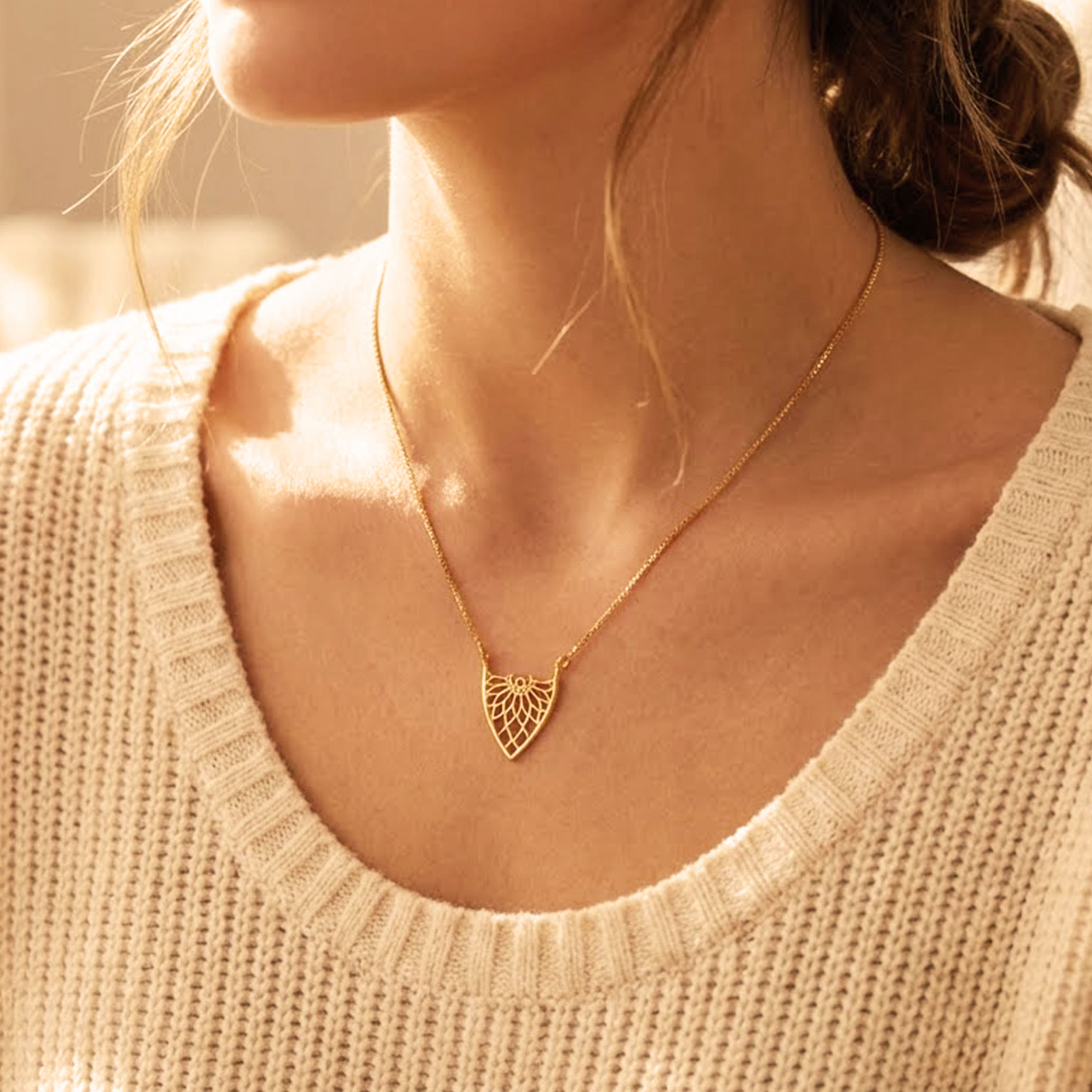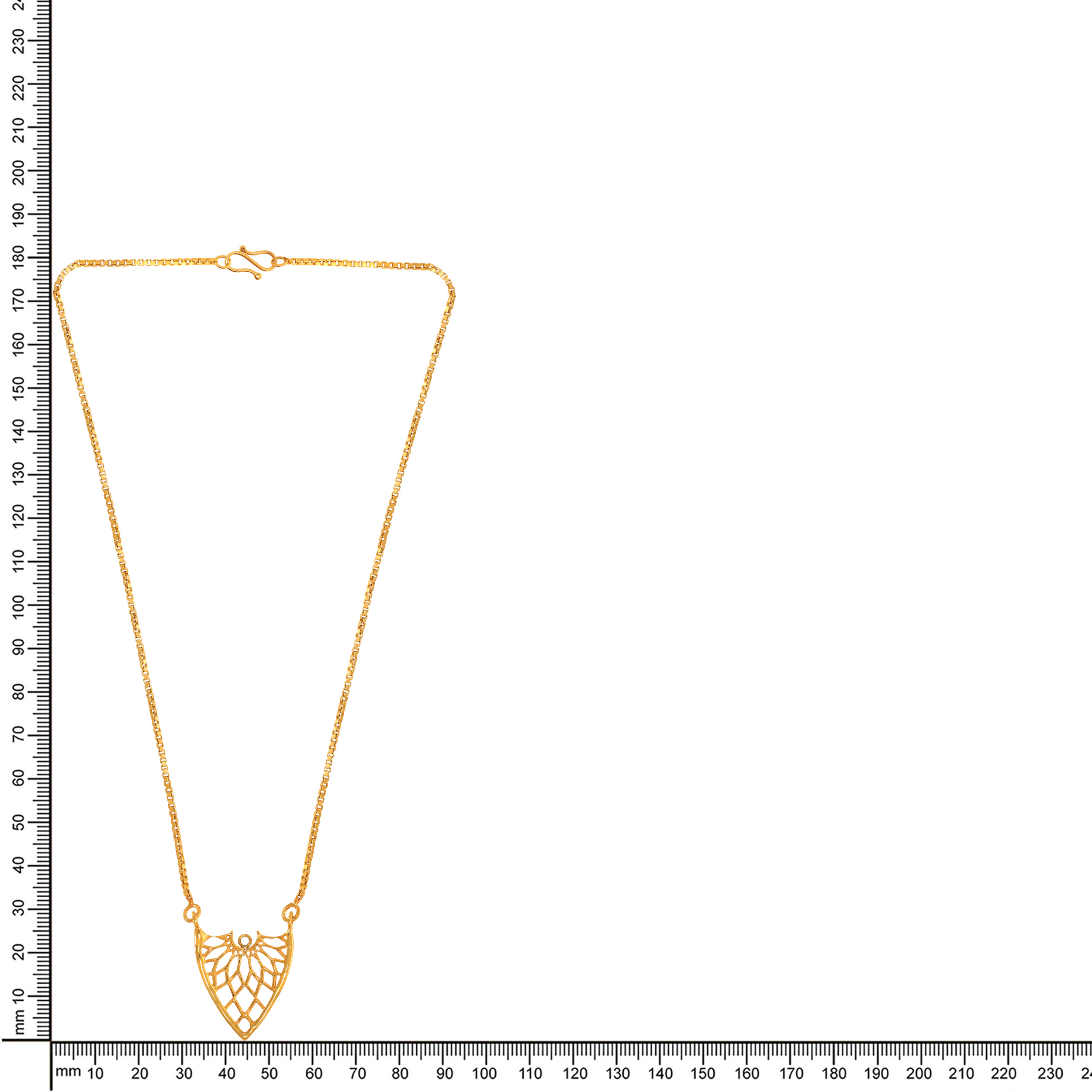 Add a touch of refined elegance to your neckline with this gold chain pendant, designed with a graceful fan-inspired lattice motif. The airy silhouette catches the light beautifully, perfect over clean necklines, V-cut dresses, or layered festive looks for a subtle statement.