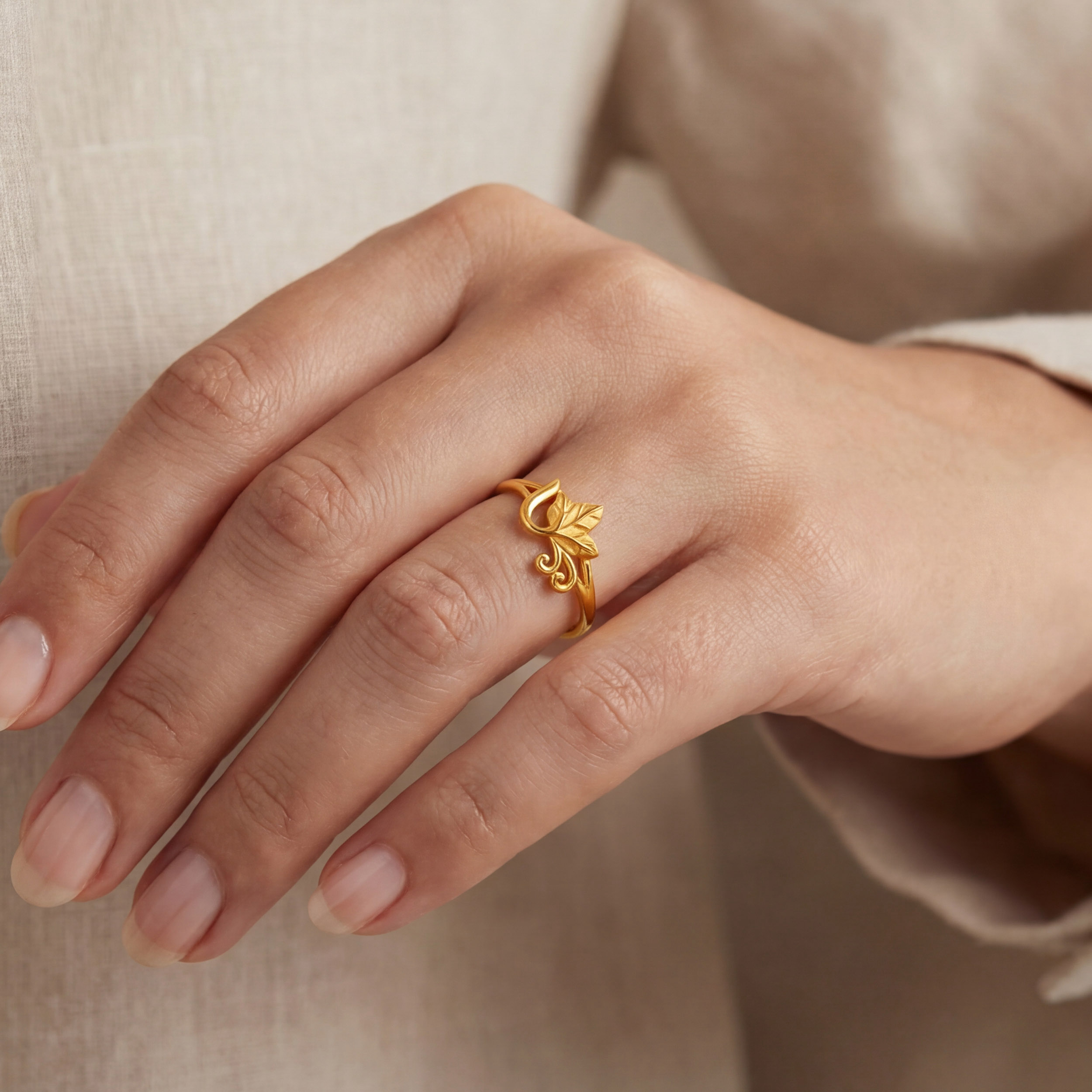 Let your love for nature take centre stage with this delicately sculpted gold ring, designed with a flowing vine-like band, textured leaves, and graceful swirling tendrils. Lightweight yet expressive, it captures organic beauty in a refined, contemporary silhouette.