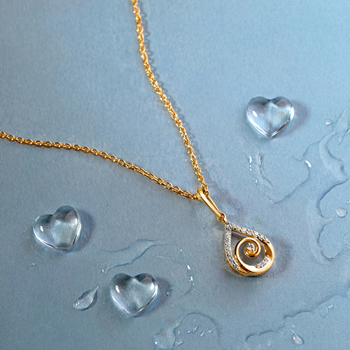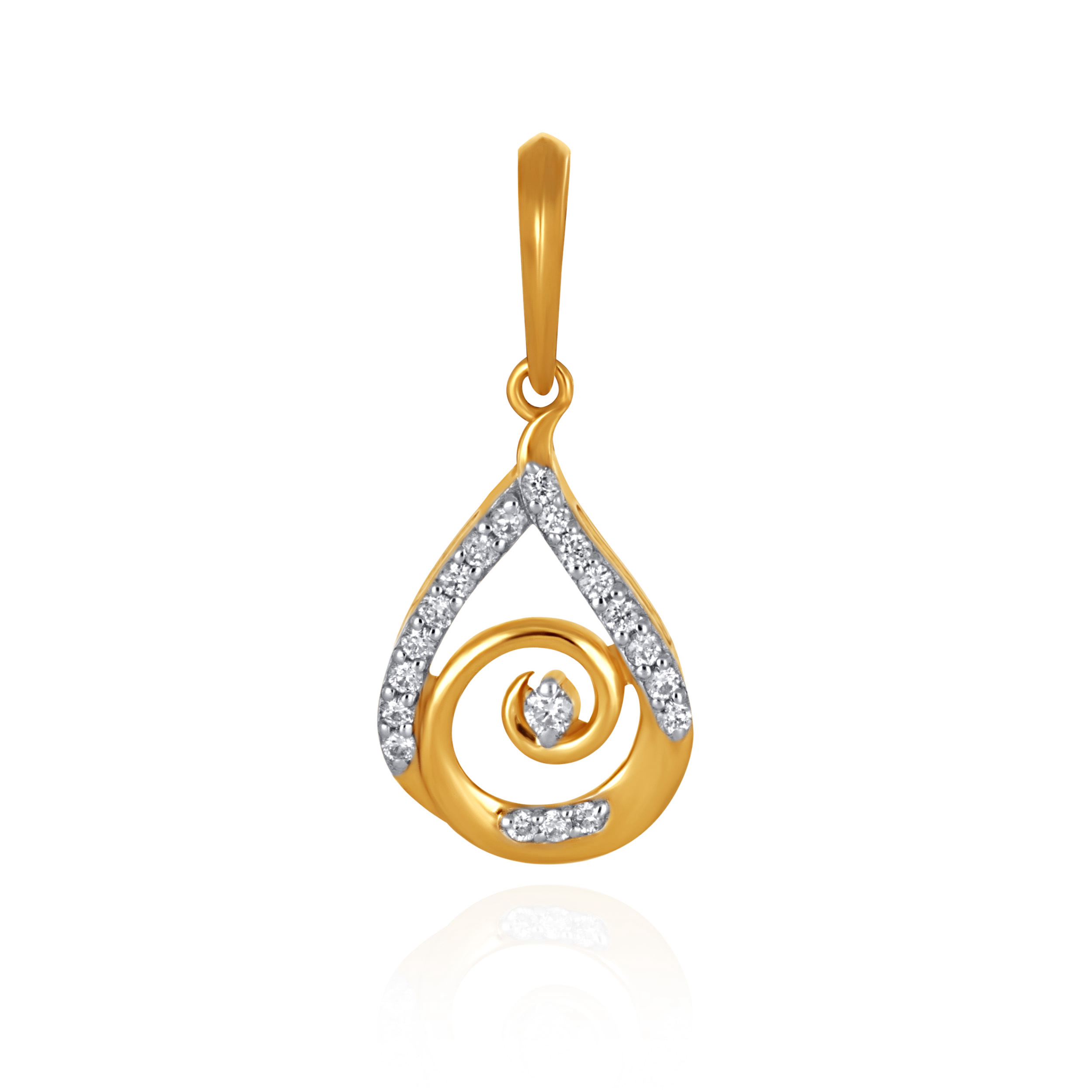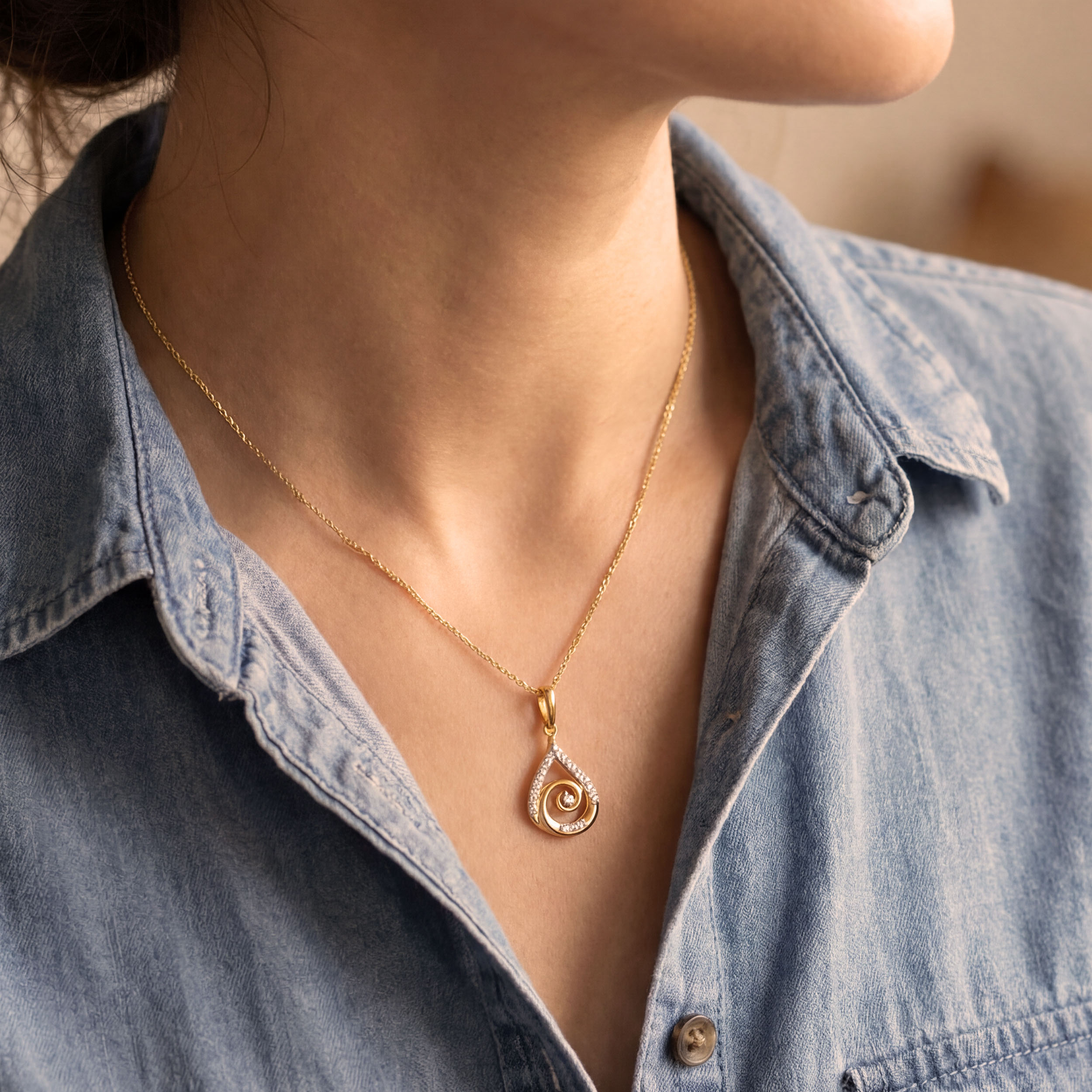 Redefine modern elegance with the perfect harmony of fluid geometry and classic luxury. This pendant features a graceful teardrop frame outlined in shimmering diamonds, enclosing a meticulously crafted golden spiral. Perfectly poised for sarees, kurtas, dresses, and everyday modern styling.