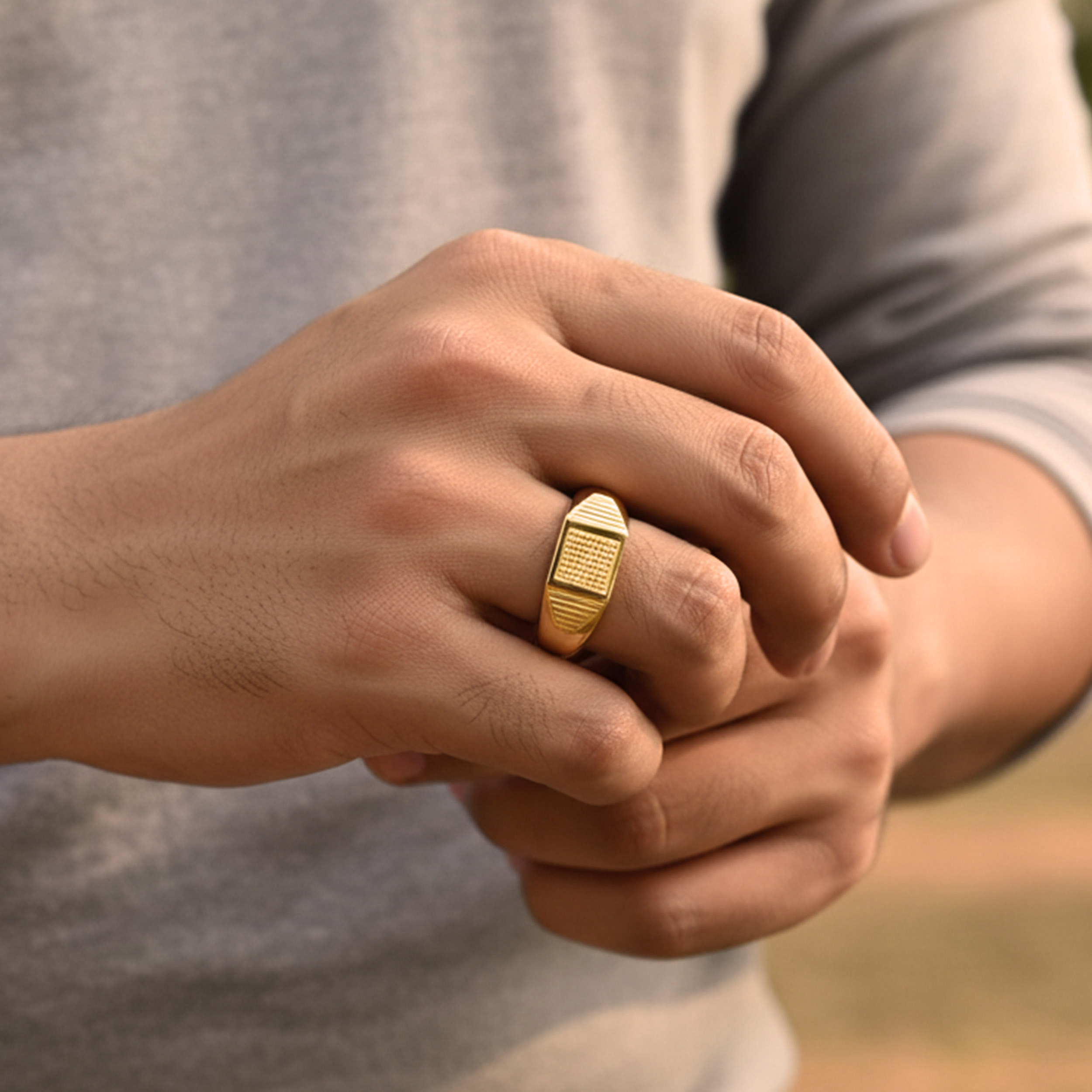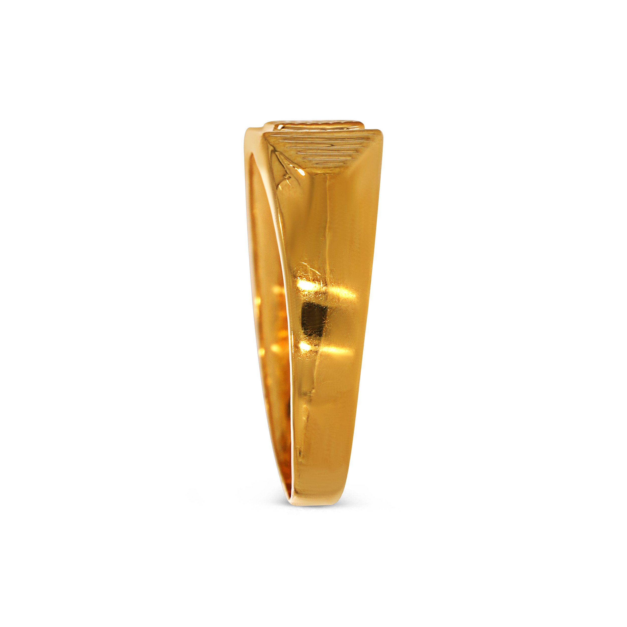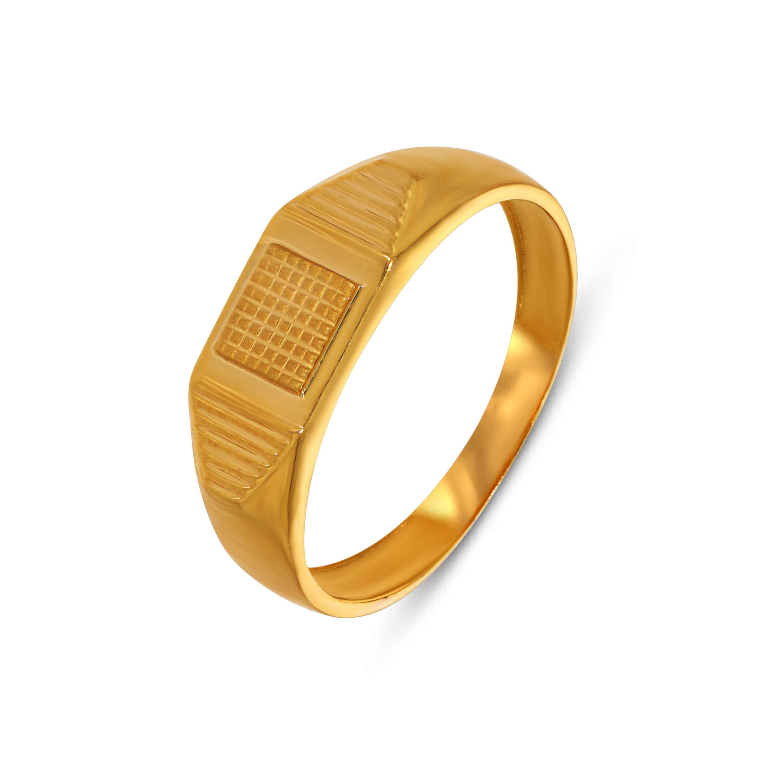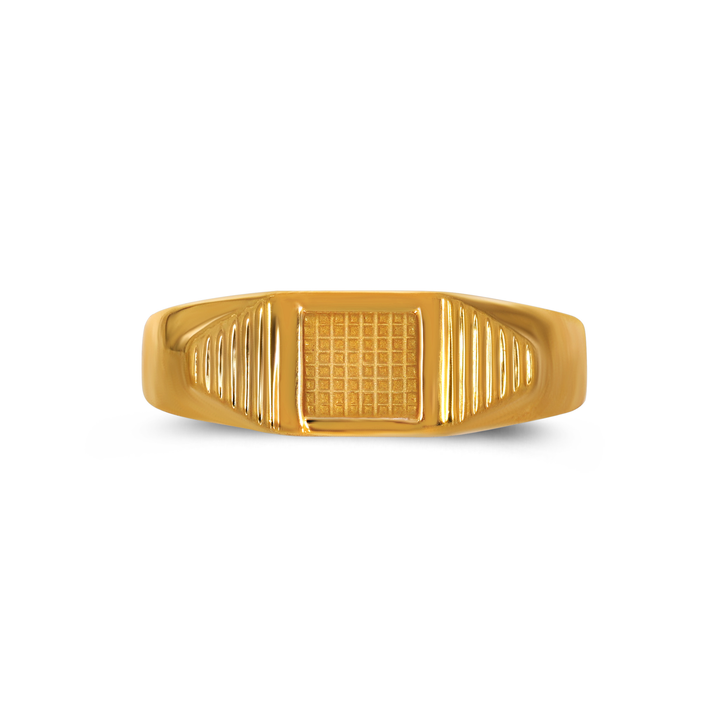 Project confidence with a ring designed for the modern man. A textured panel and smooth gold finish balance modern structure with understated refinement, perfectly balanced against casual pieces with a refined finish.