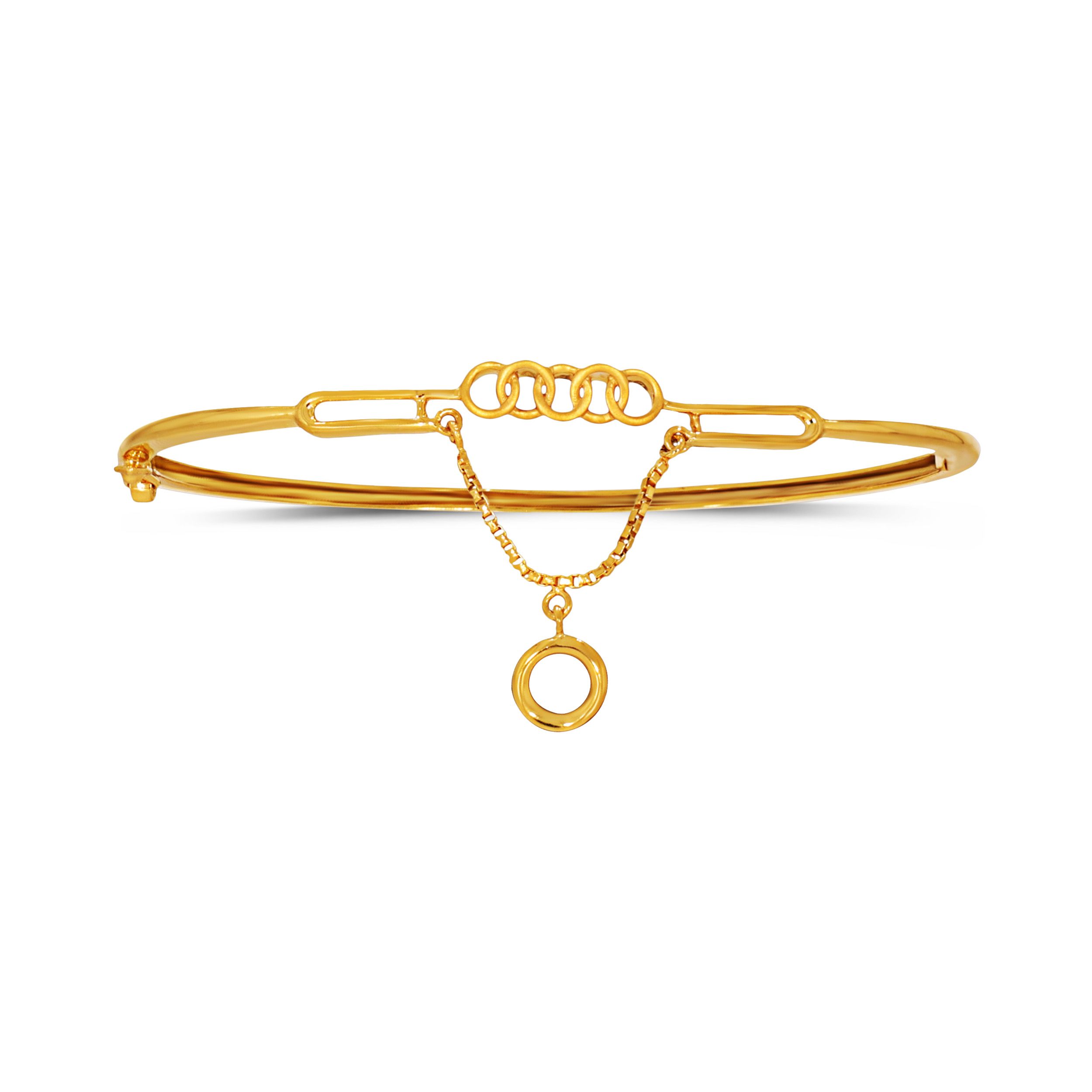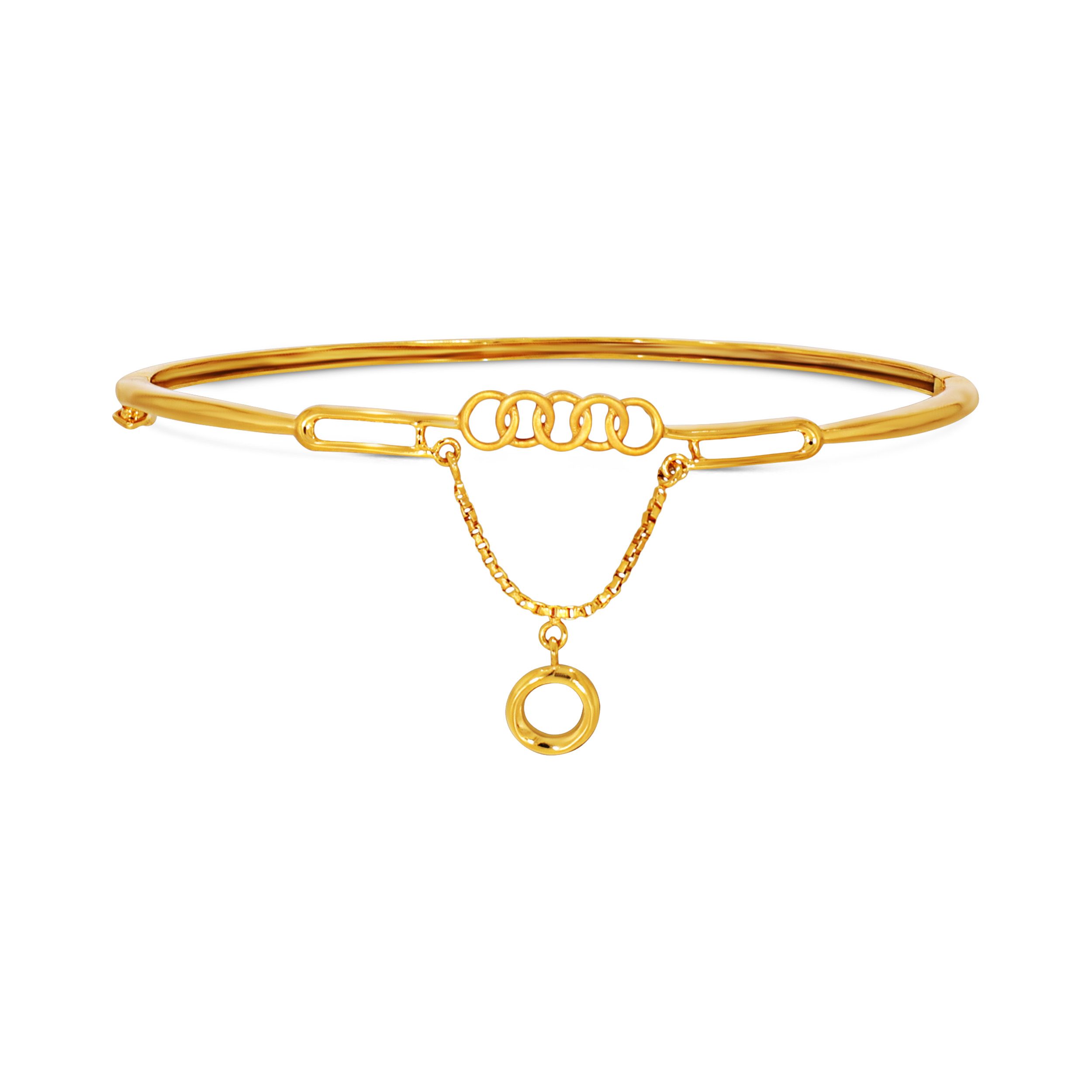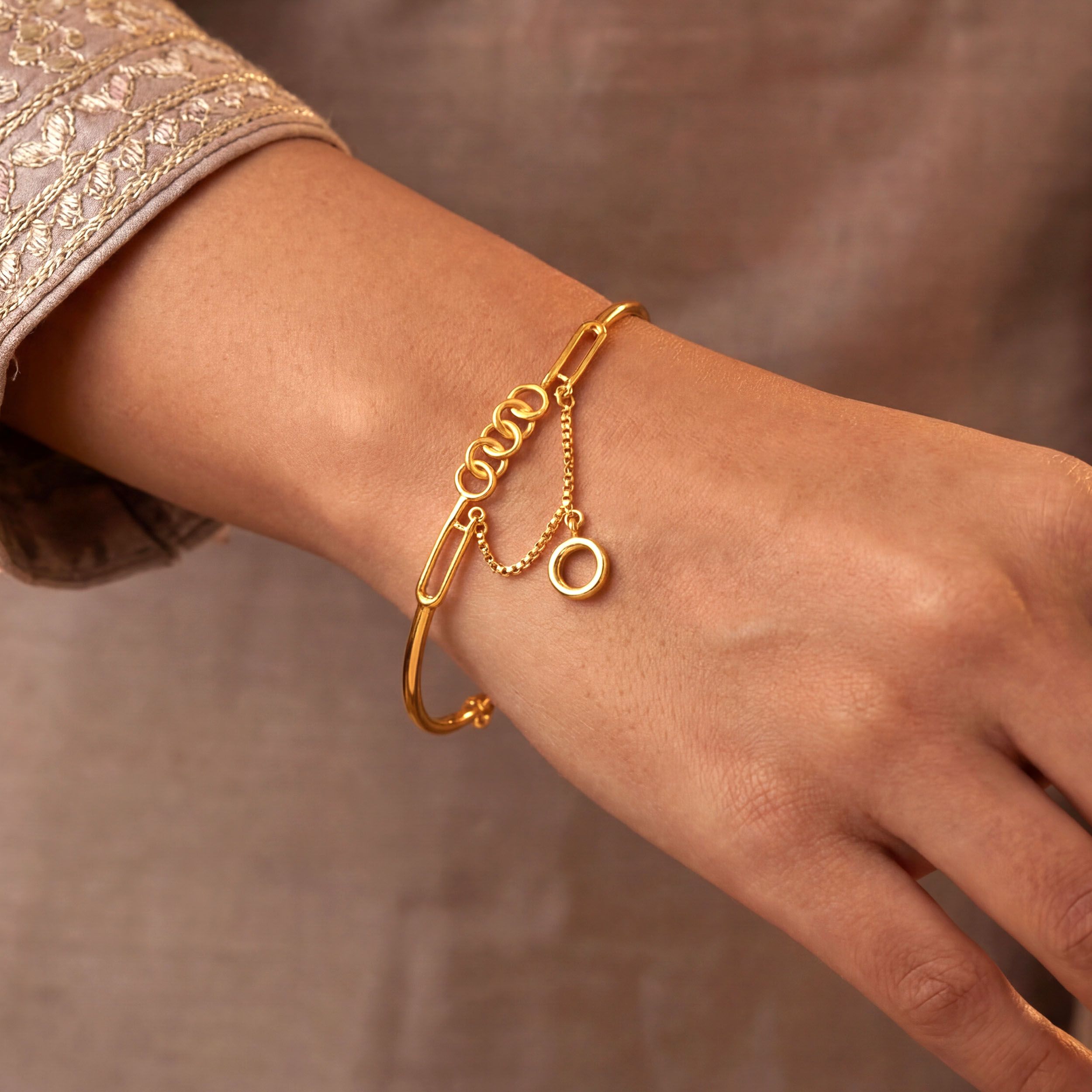 This gold chur is all about finesse and movement. It features four interlocking rings at its centre, symbolising connection in its most fluid expression. A delicate chain suspends a circular charm below, adding a soft, rhythmic layer to the silhouette. Style it with a sleek black dress, a satin co-ord set, or a kurta for a look that feels fluid, modern, and refined.