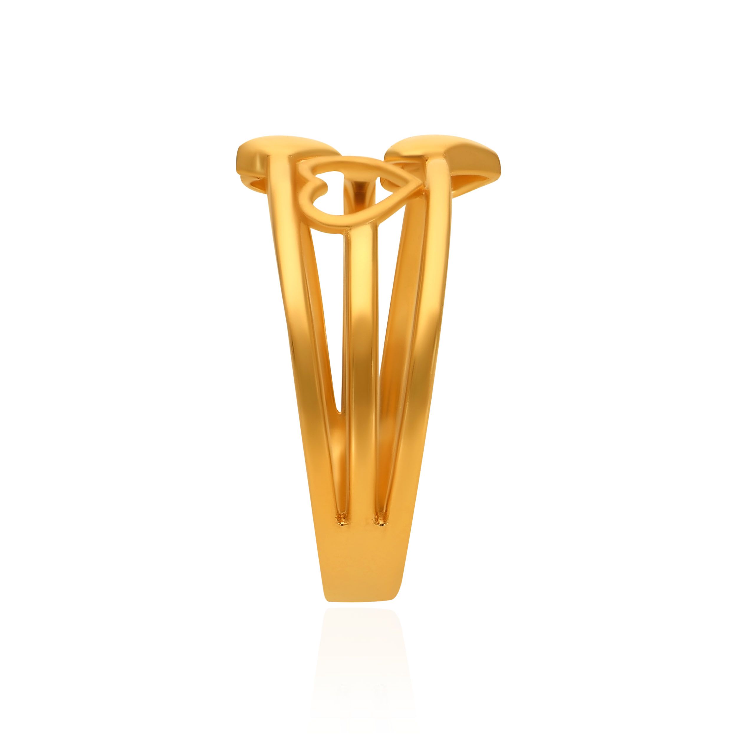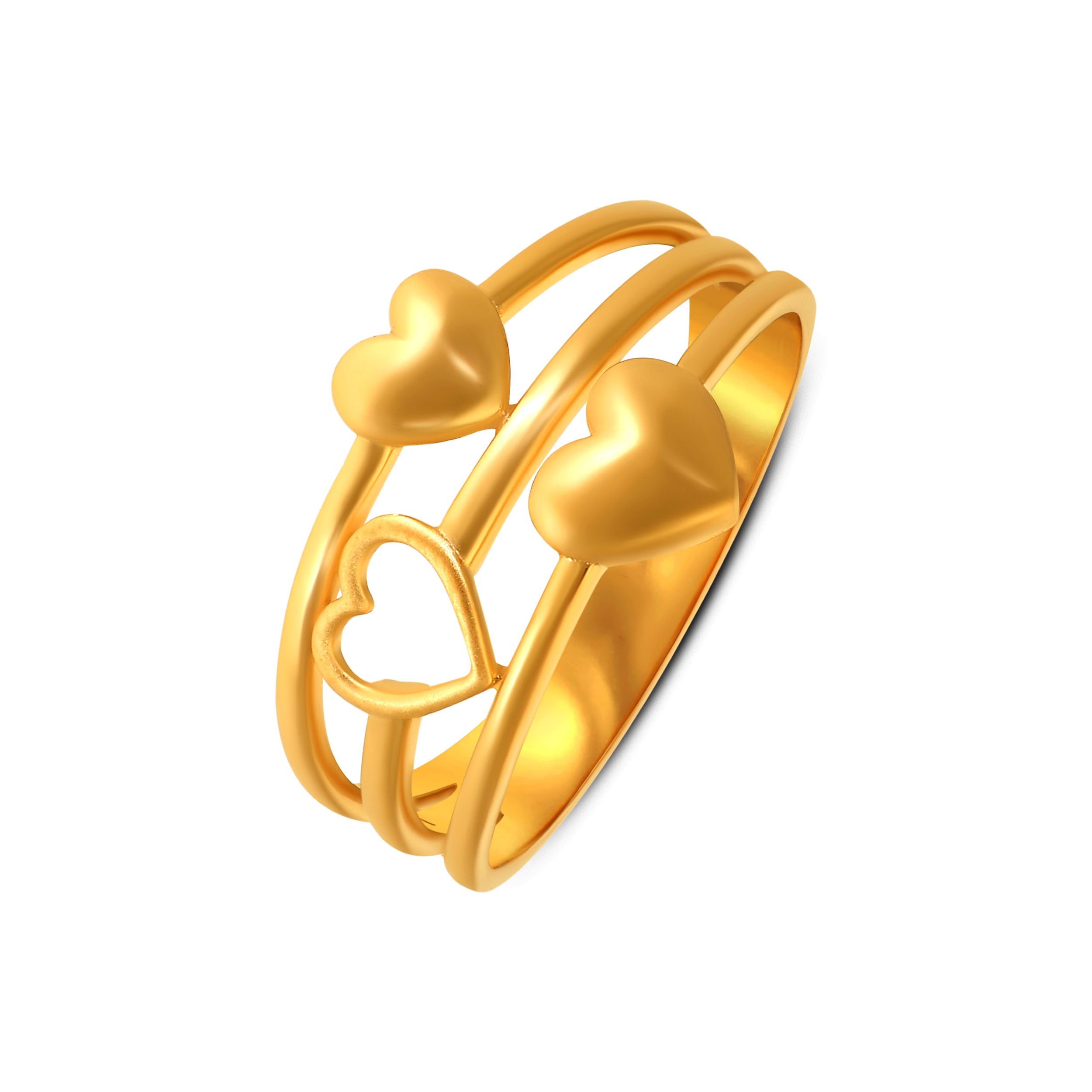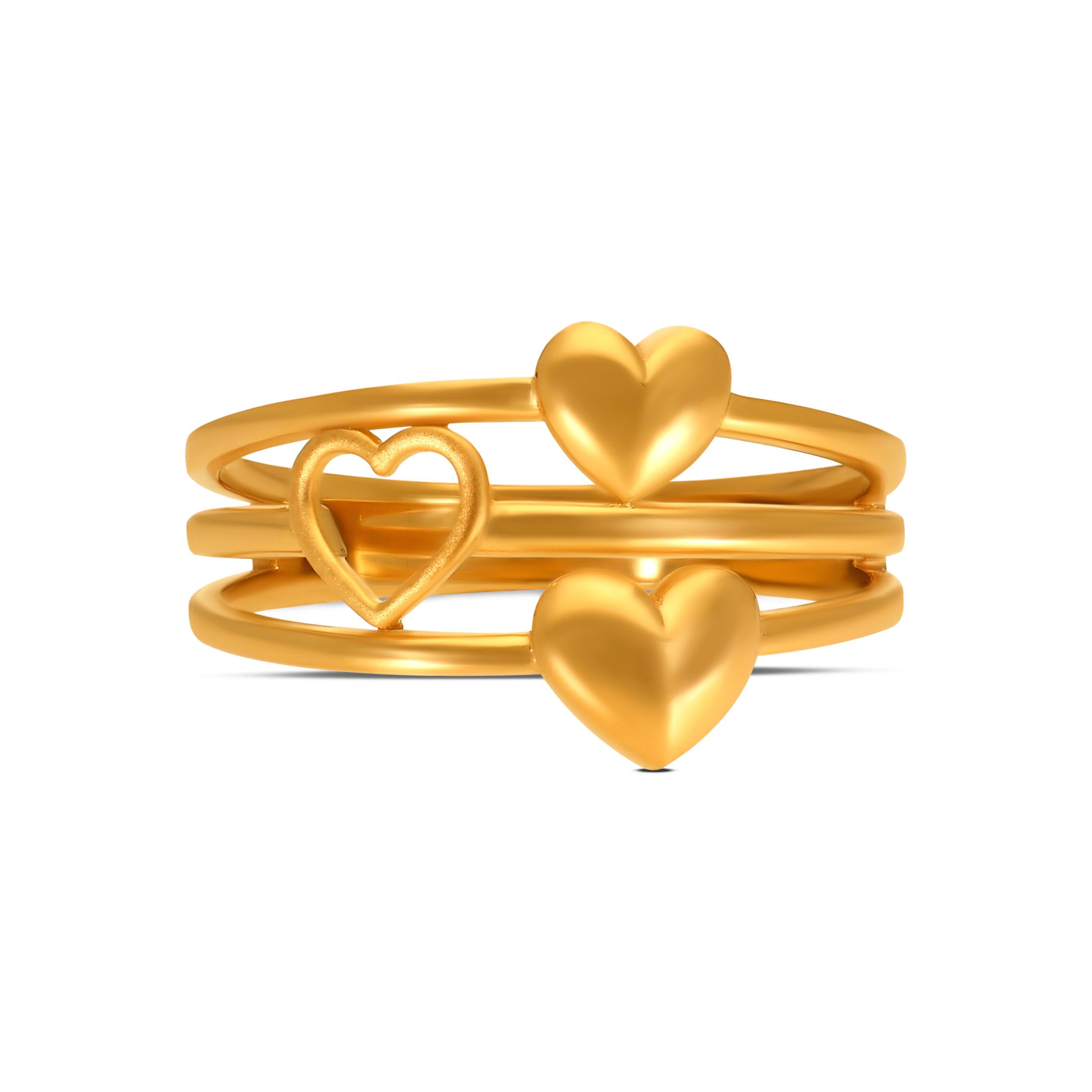This multi-layered gold band creates an instant stacked look, featuring a trio of floating hearts in varied finishes. A playful yet sophisticated take on symmetry, it’s designed for the woman who finds beauty in the details. Pair it with a sleek black slip dress or a crisp white shirt and tailored trousers for a chic, modern look.