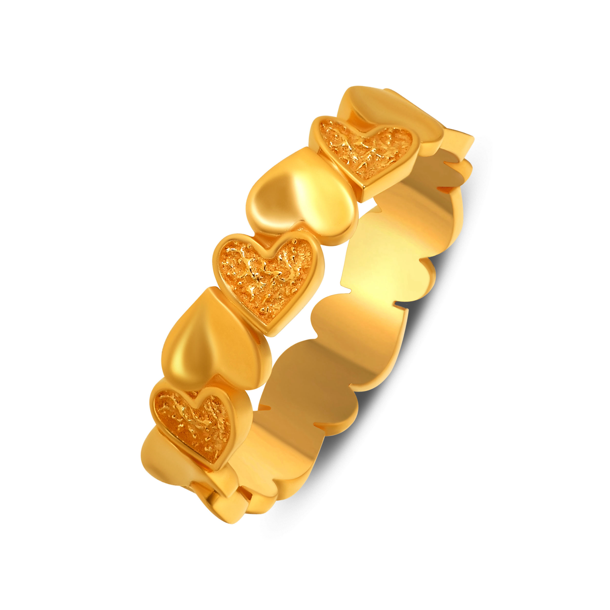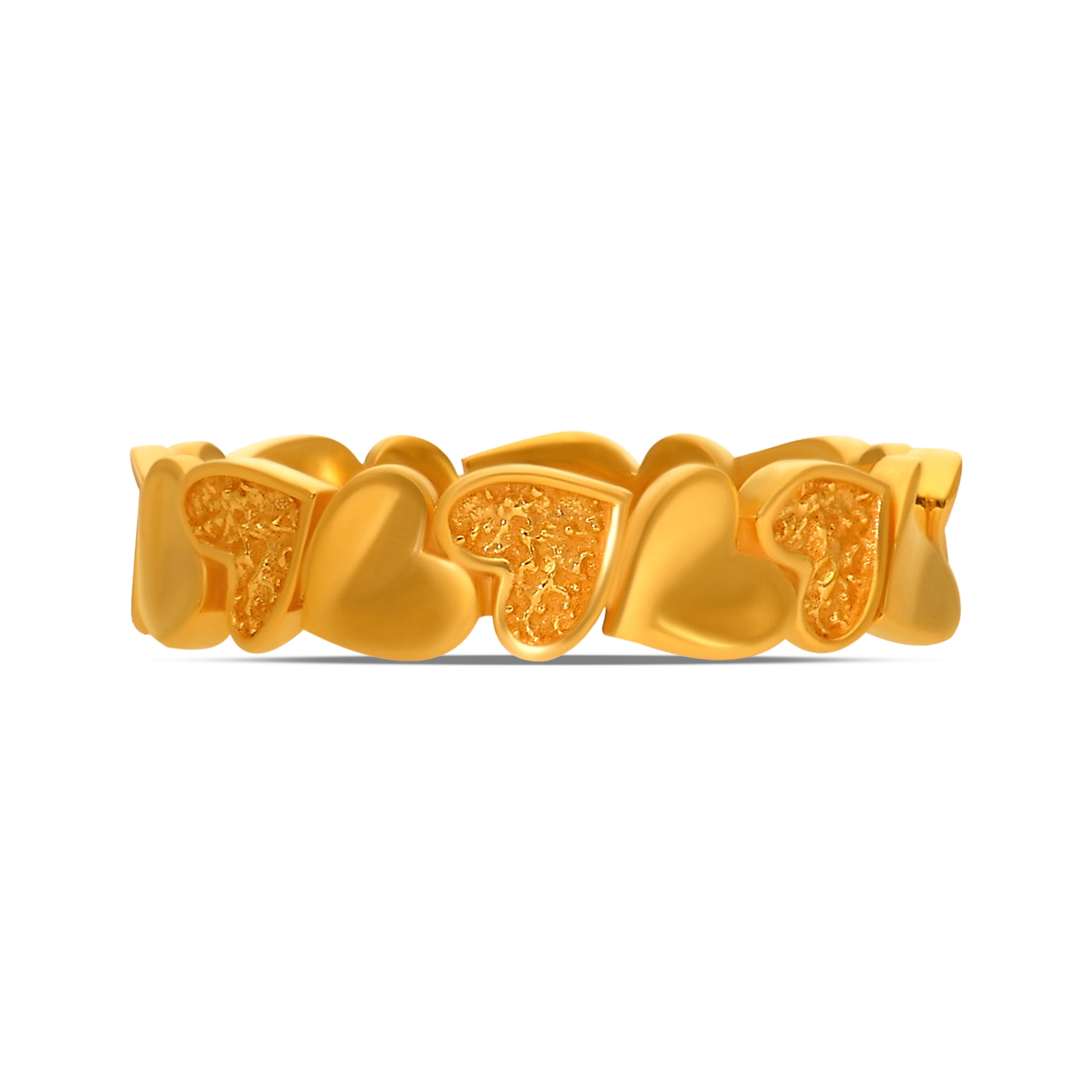 Alternating polished and textured heart forms give this gold ring a tactile richness and visual contrast. The design feels intentional and expressive, offering romance with a distinctly modern sensibility. Style with tonal gold jewellery for a cohesive, elevated look.