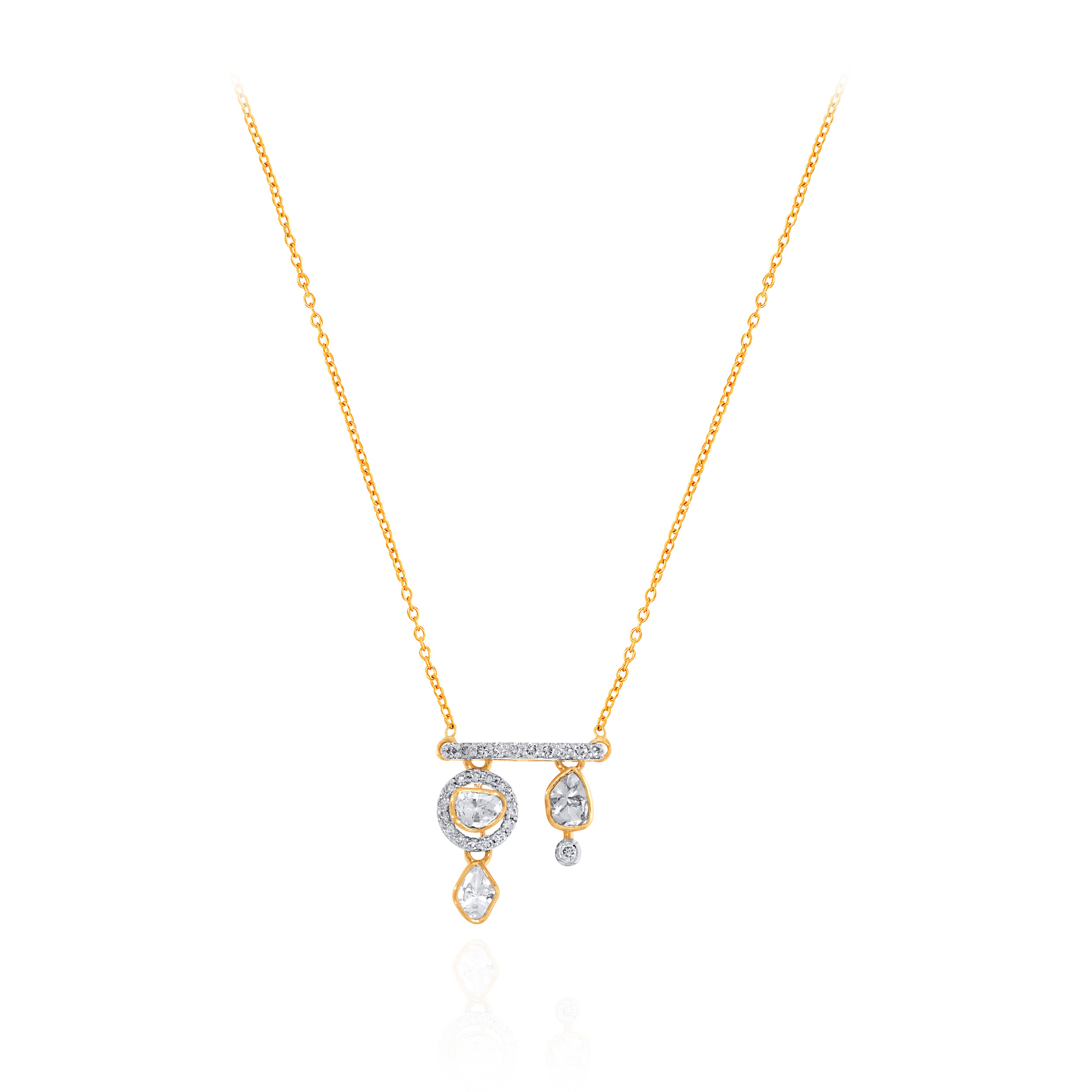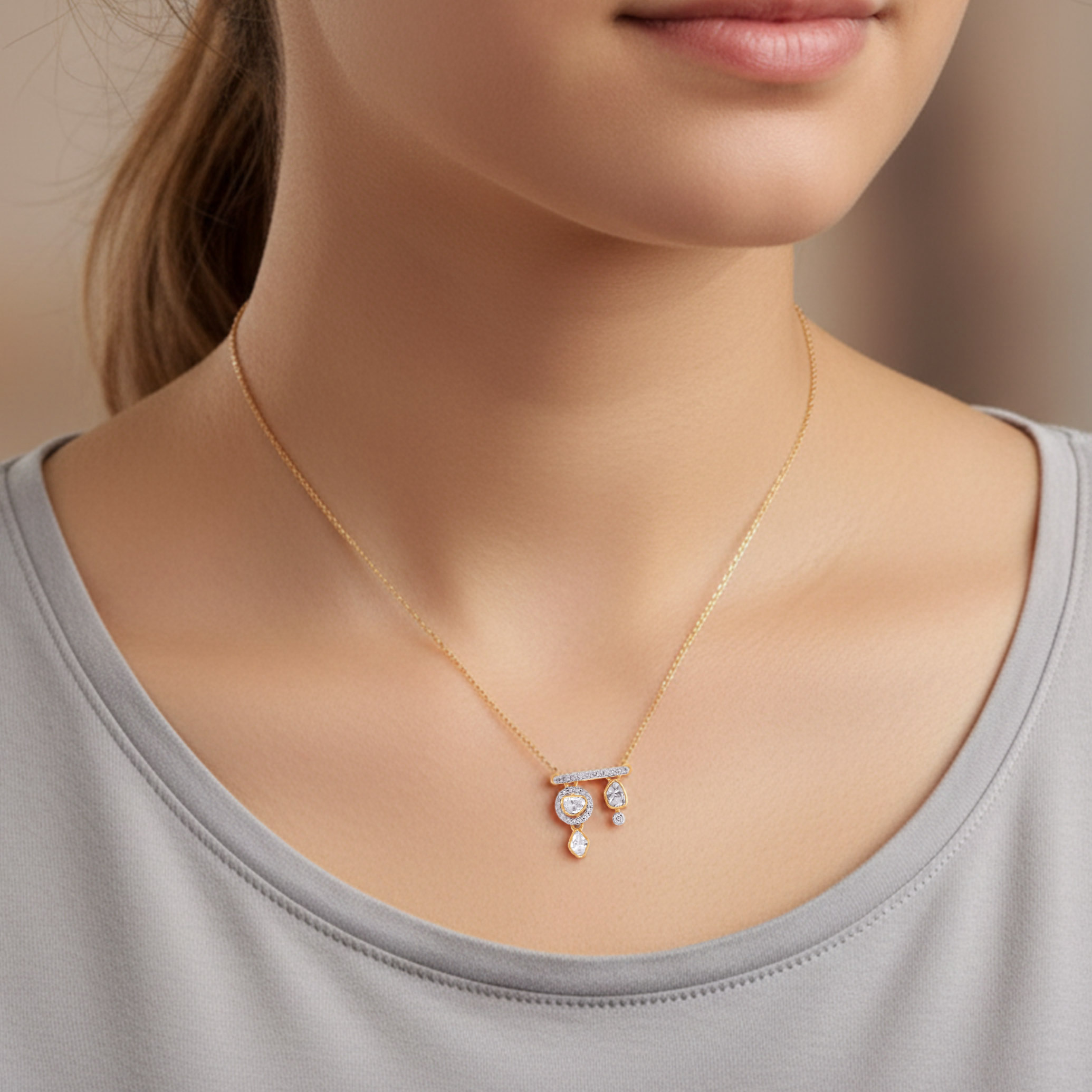 Inspired by royal forms, this pendant draws its character from uncut Polki stones. Delicately placed diamonds lend structure and balance, creating a design that is rooted in tradition yet refreshingly restrained. Style it with handwoven silk sarees, ivory lehengas, or an elegant anarkali in muted jewel tones to let its regal character shine.
