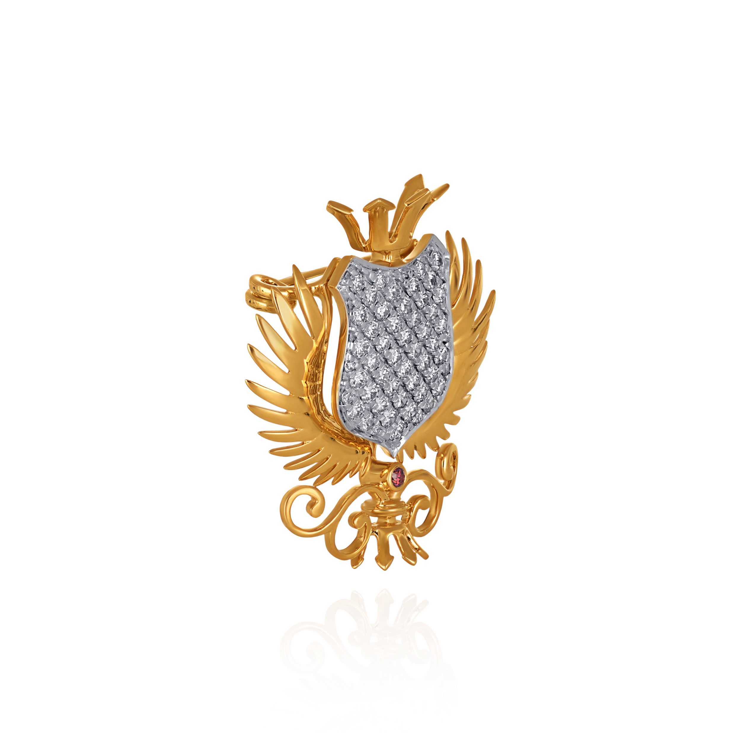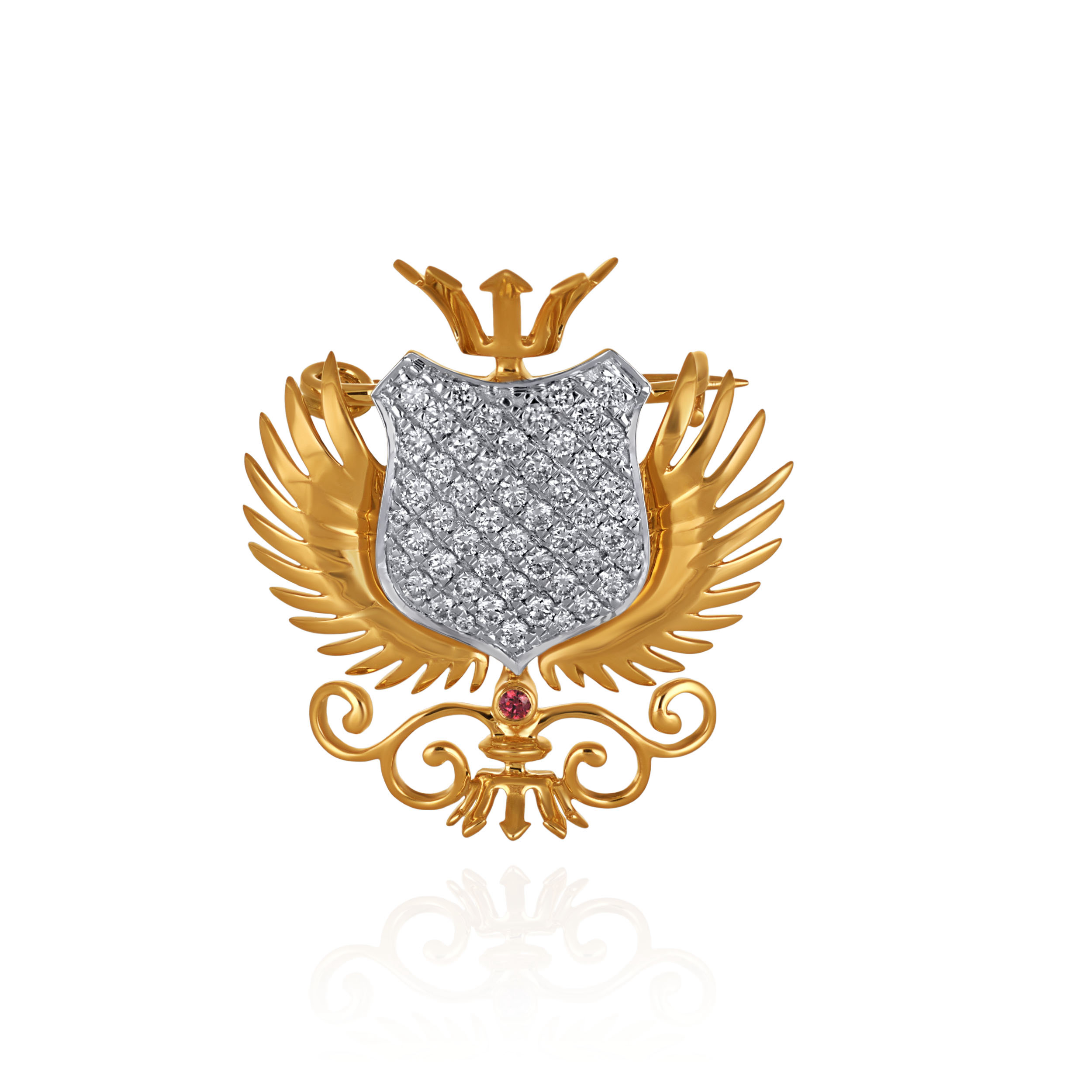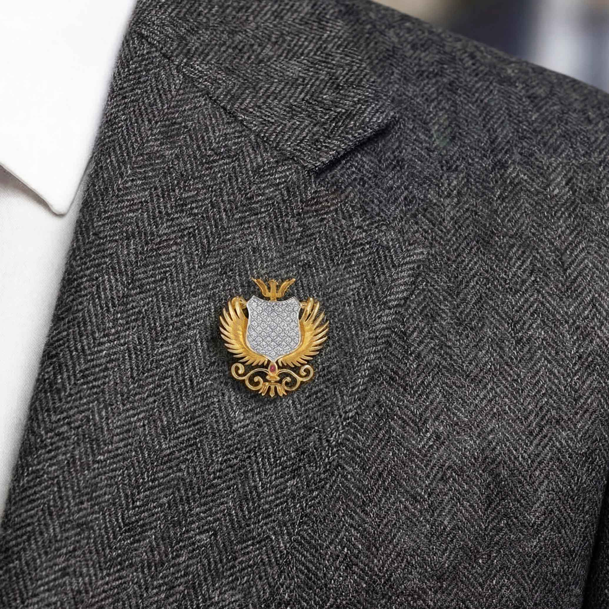 Make a statement that commands attention. This brooch, a striking fusion of regal heraldry and modern luxury, features a bold eagle-wing motif paired with a diamond-encrusted shield, crafted for the man whose accessories speak as loudly as he does. Elevate any formal silhouette and own the room.