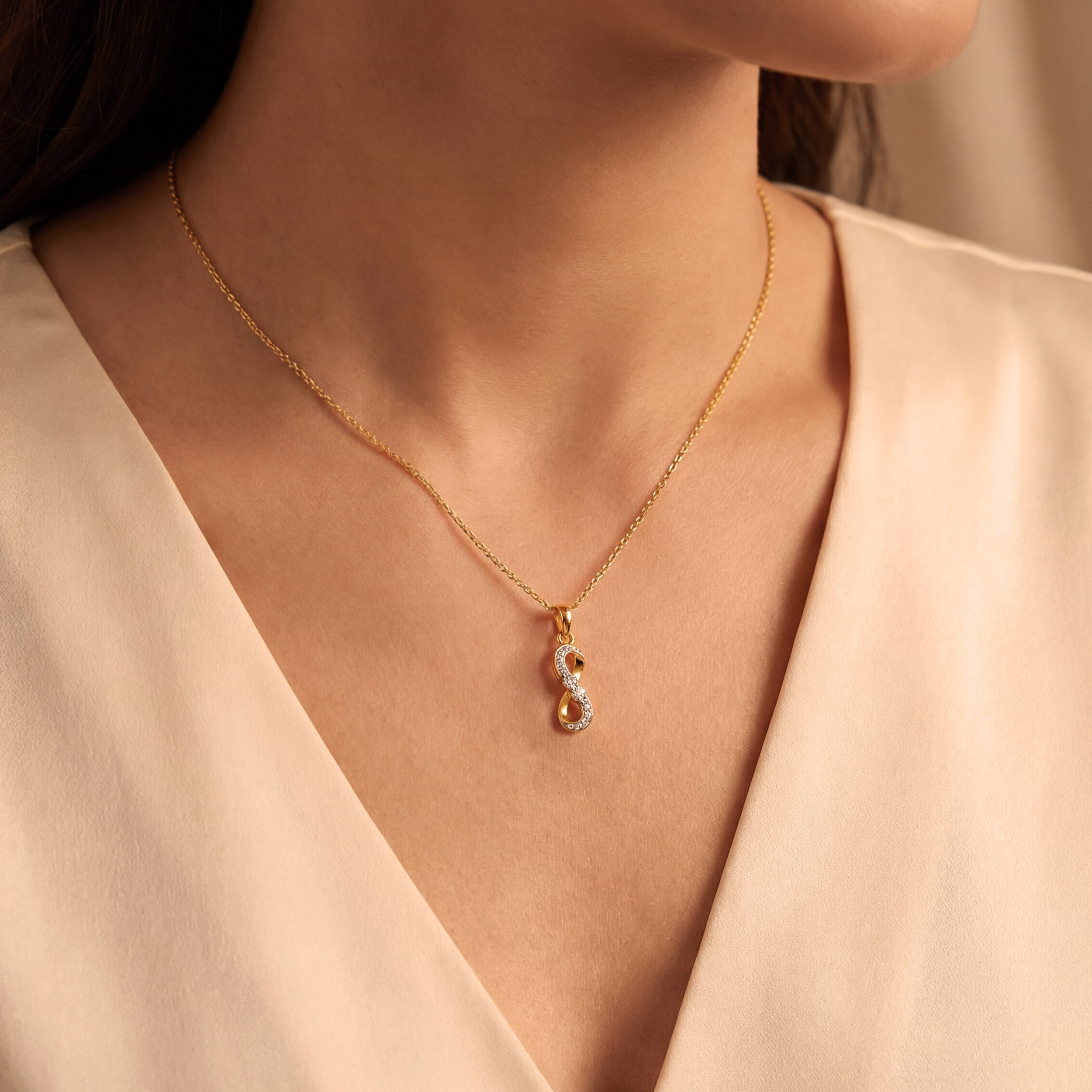 Add refinement to your daily attire with this diamond pendant featuring a classic infinity silhouette traced with radiant diamonds. Lightweight and slender, it offers subtle sparkle, perfect as a meaningful gift or a special piece to mark a milestone.