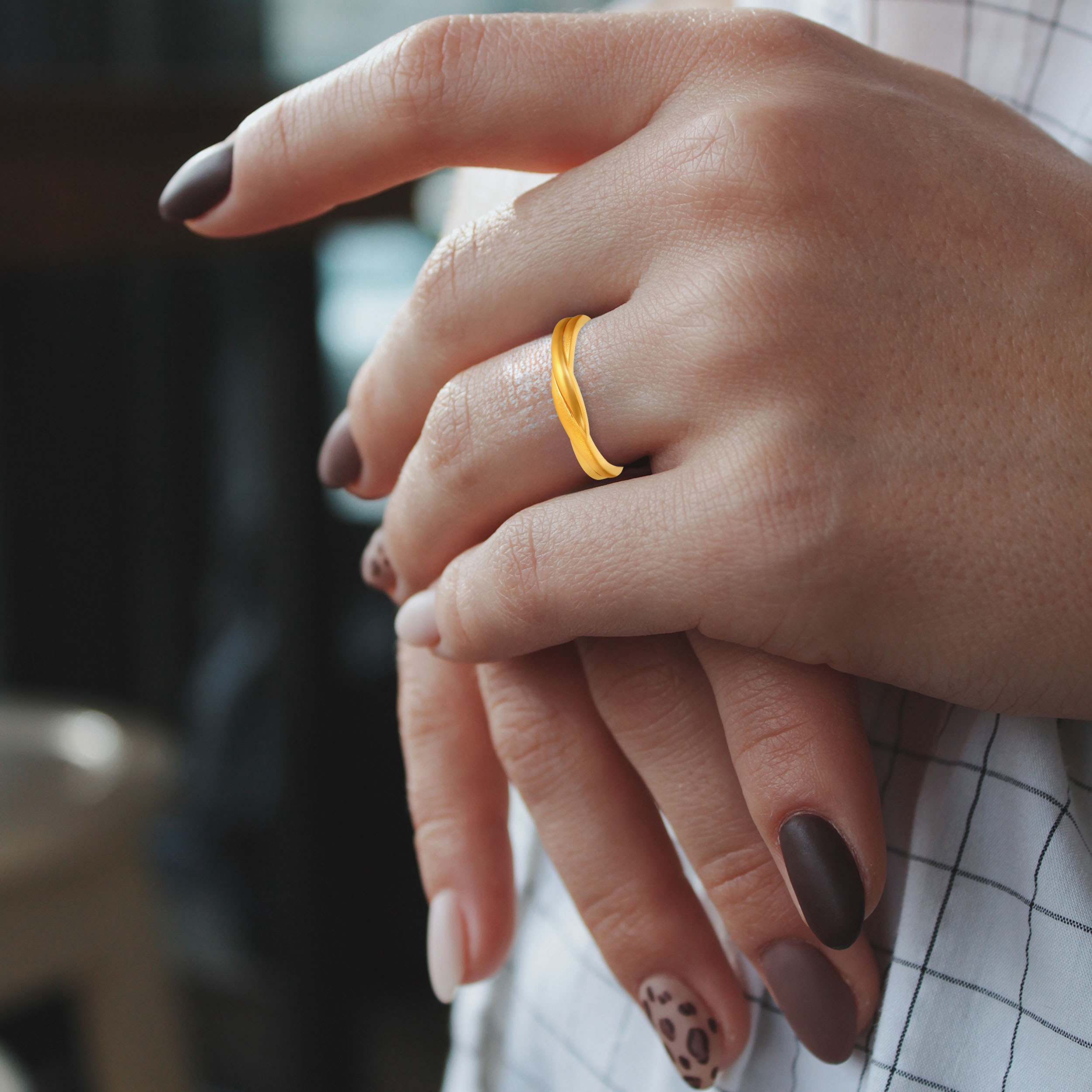 Embrace the beauty of fluid design with this infinity-inspired band ring. Its seamless, sculptural two-toned silhouette features one strand glowing with a mirror-like polish, while the other is finished with a subtle, shimmering frost. A chic everyday statement that effortlessly uplifts your fits.