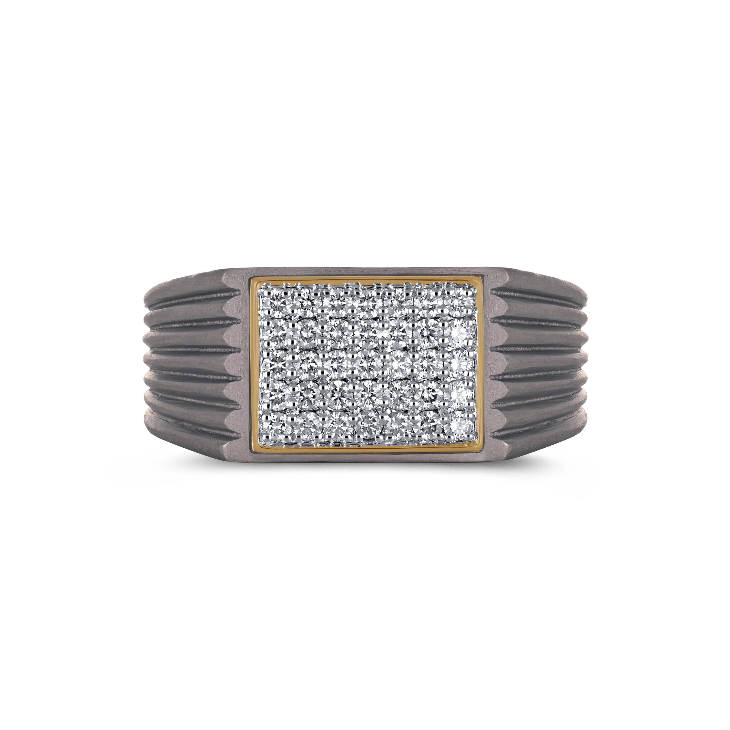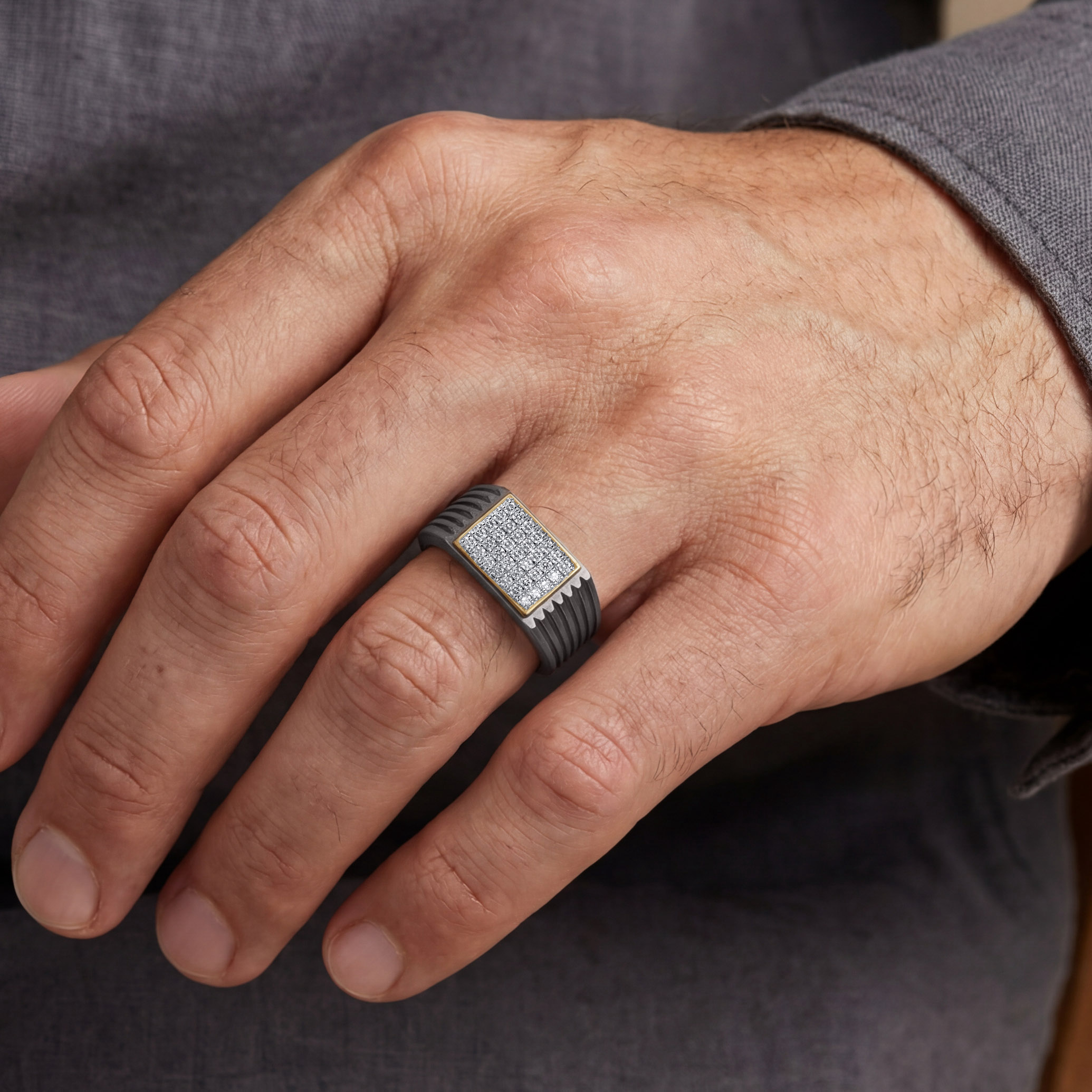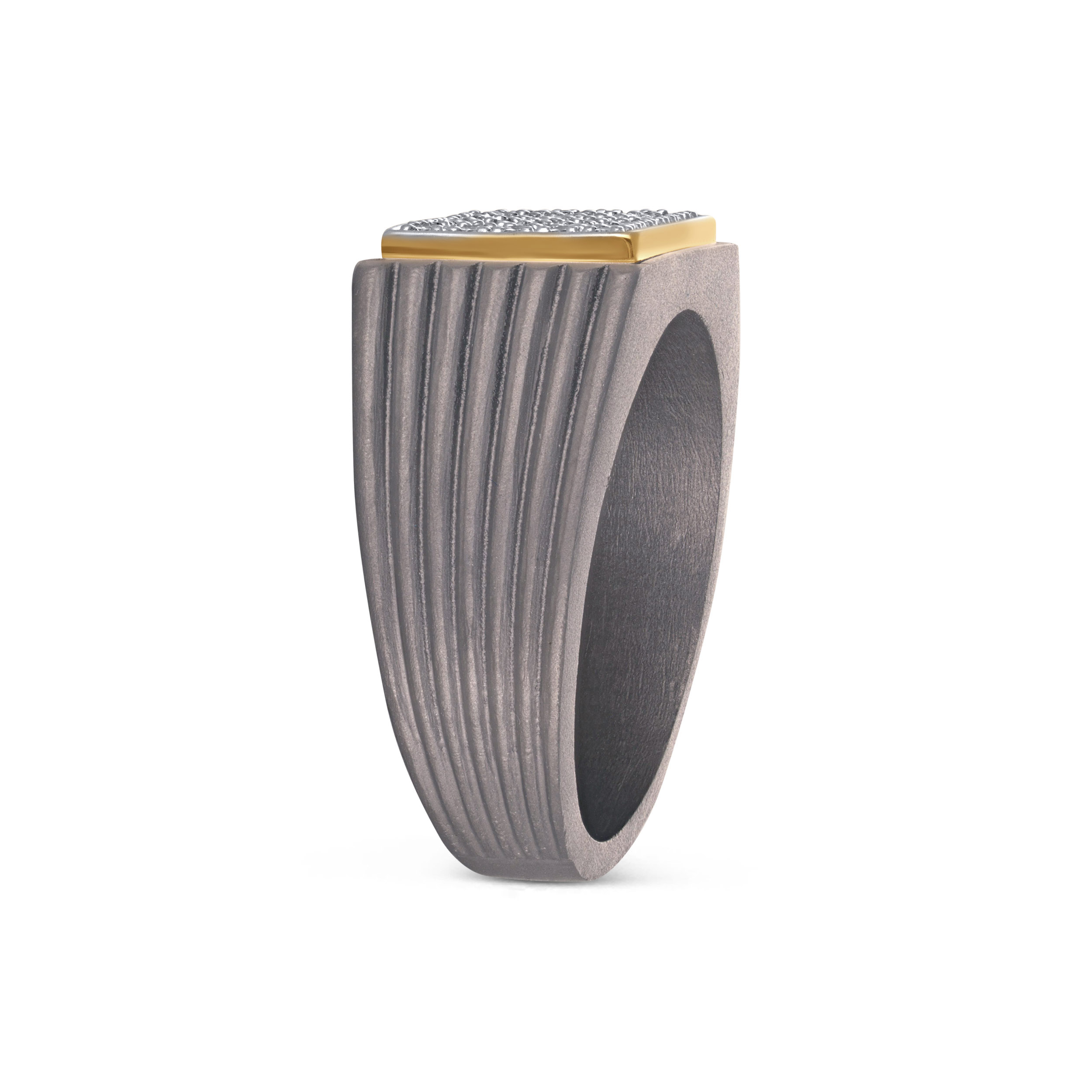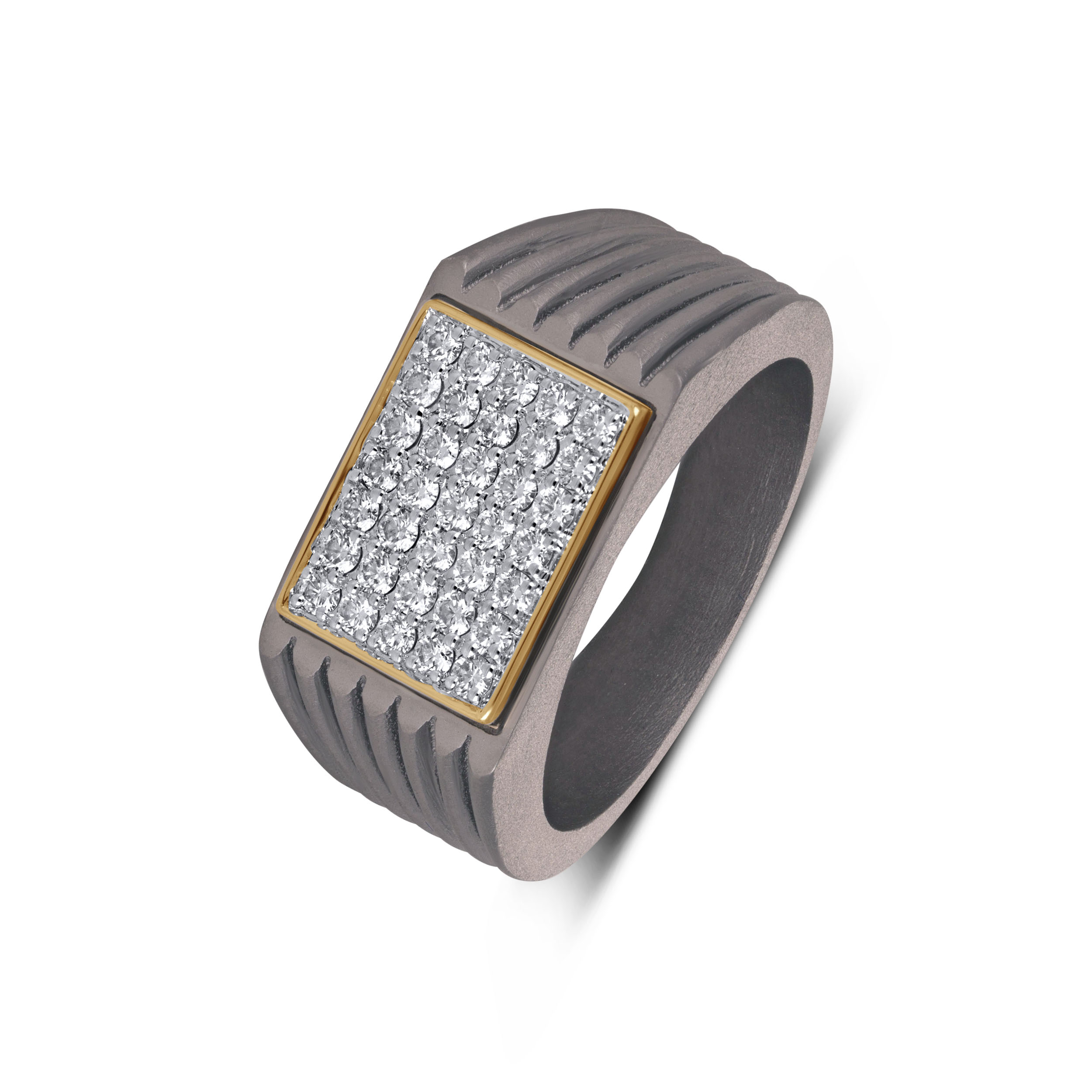 Take modern craftsmanship to new heights with this titanium diamond ring built on strength and precision. The matte, ridged band adds depth and structure, while a gold-framed rectangular diamond cluster brings controlled brilliance. Style it with a charcoal or black shirt and tailored trousers for a sharp, refined finish.