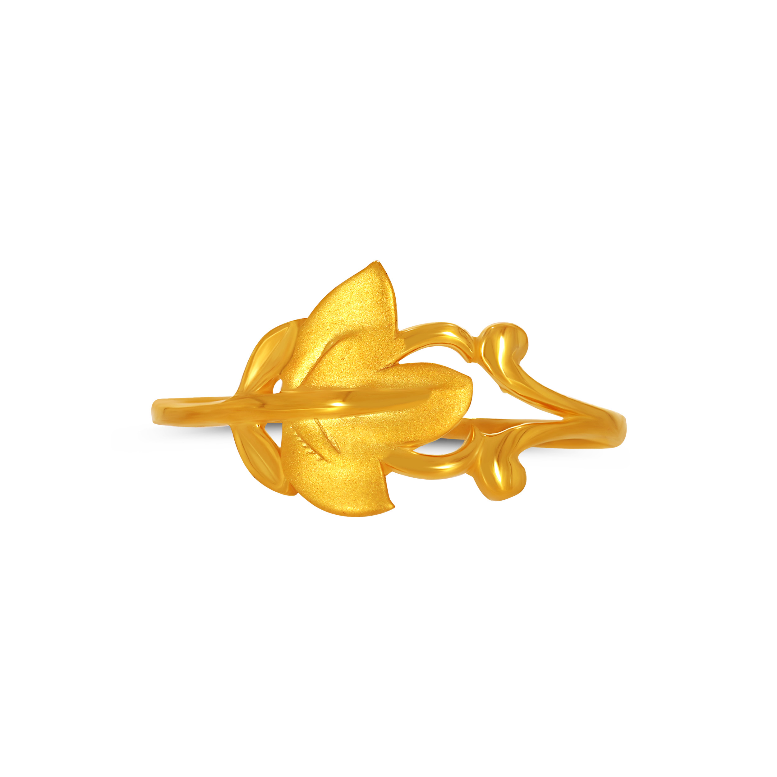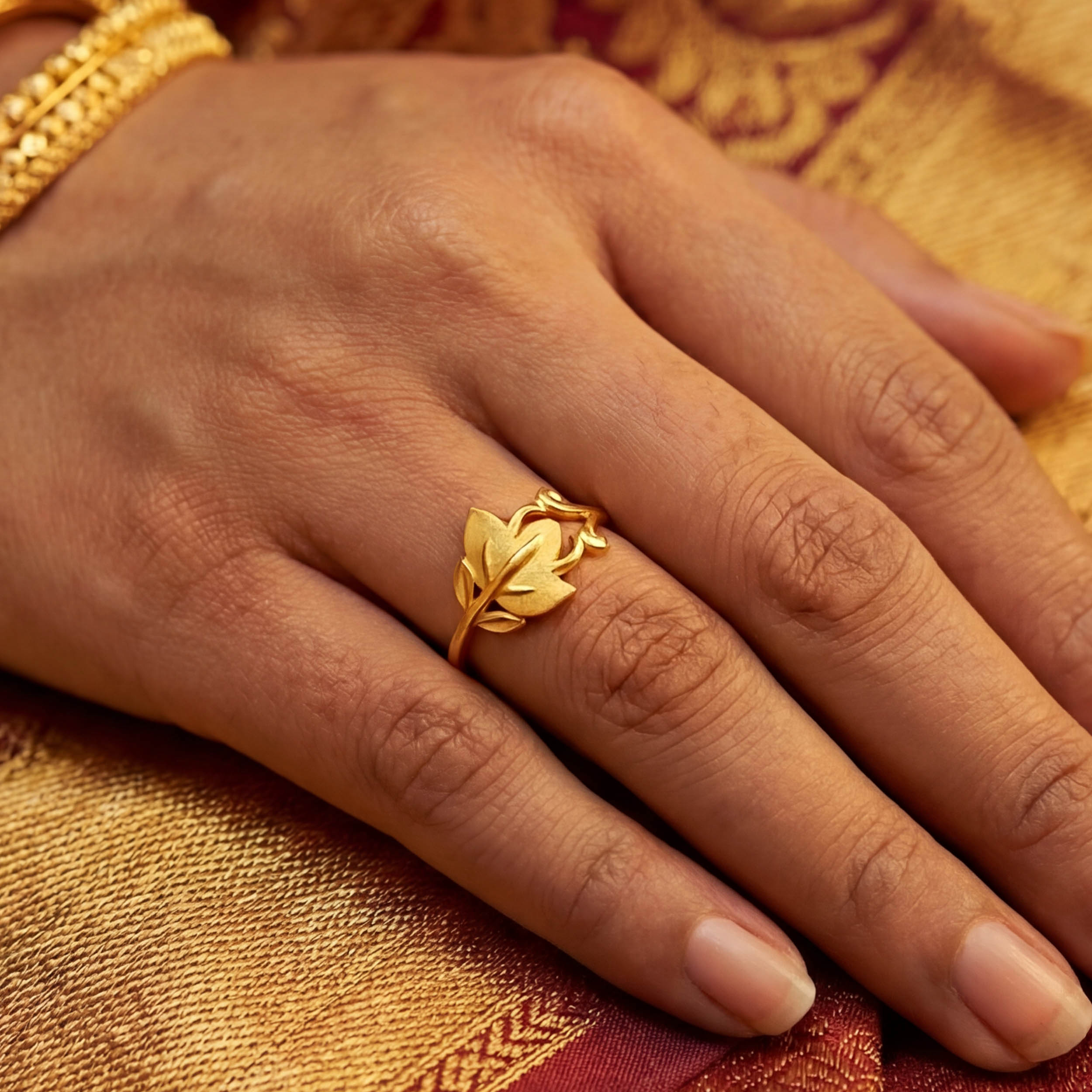 Like a flower catching the first light of dawn. This gold ring blossoms into an elegant sculpted floral form, where softly curved petals create a graceful and luminous silhouette. With its smooth matte finish and organic design, the ring captures the beauty of nature in a modern, wearable form. Pair it with a pastel saree or a breezy summer dress to highlight its delicate floral charm.