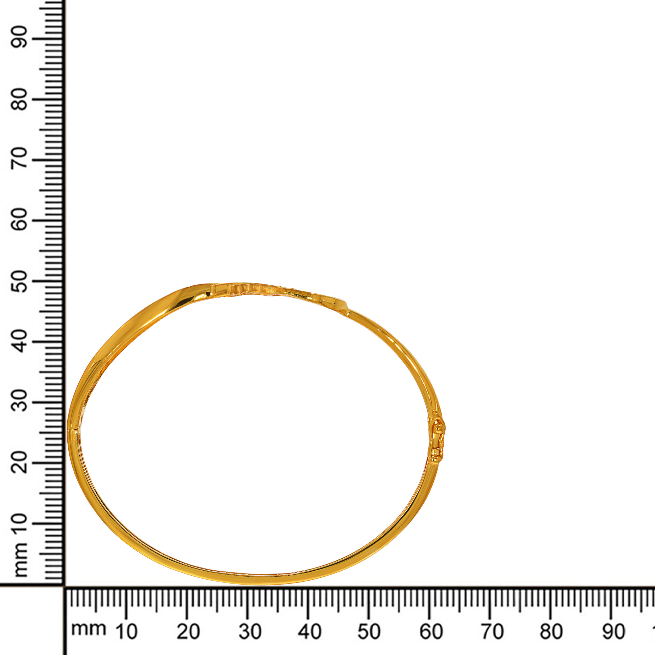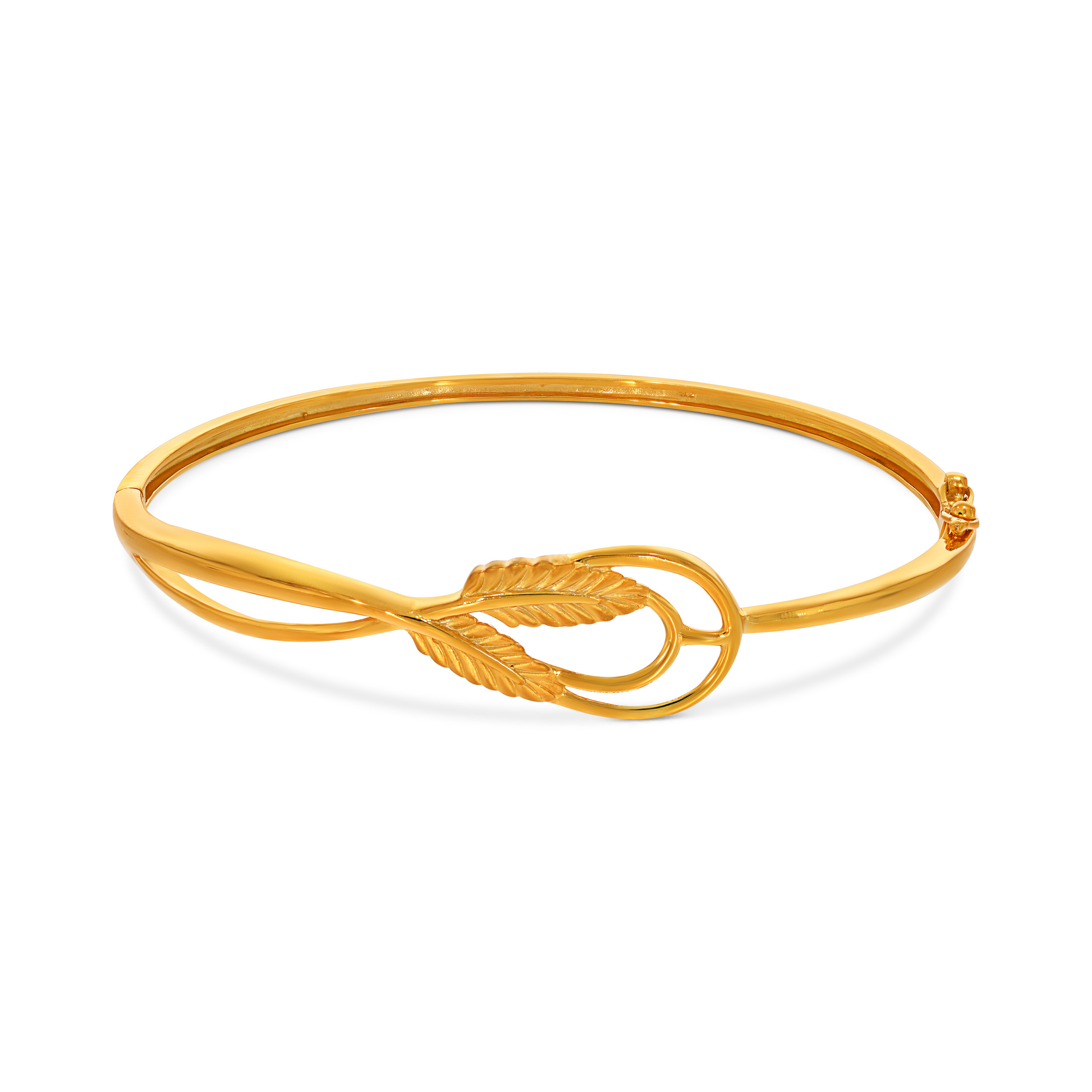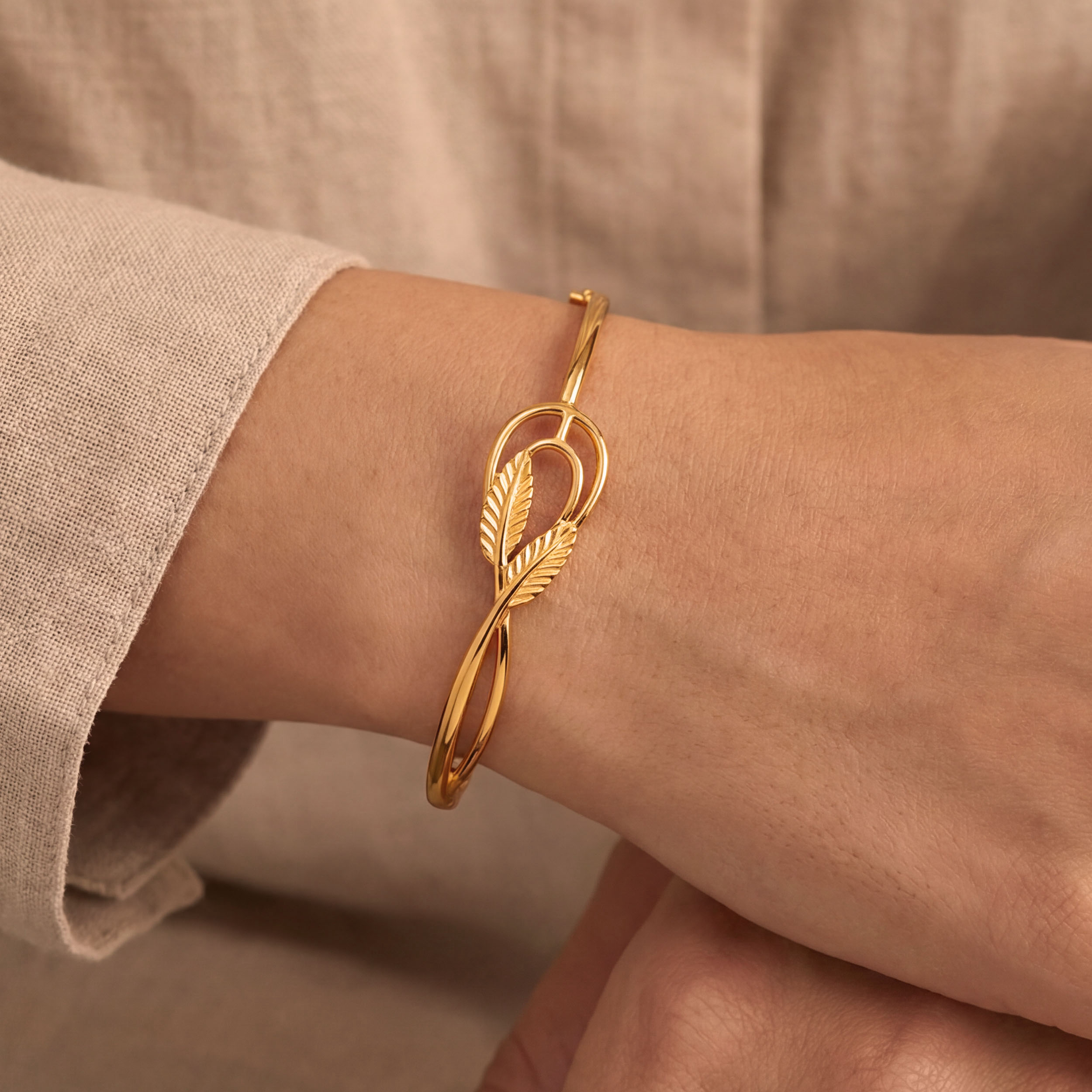 Elevate your outfit with this striking gold bangle, where meticulously etched leaves meet in a fluid, infinite loop. This contemporary chur celebrates the untethered spirit of the modern woman, blending traditional craftsmanship with a clean, organic silhouette that feels both grounded and ethereal.