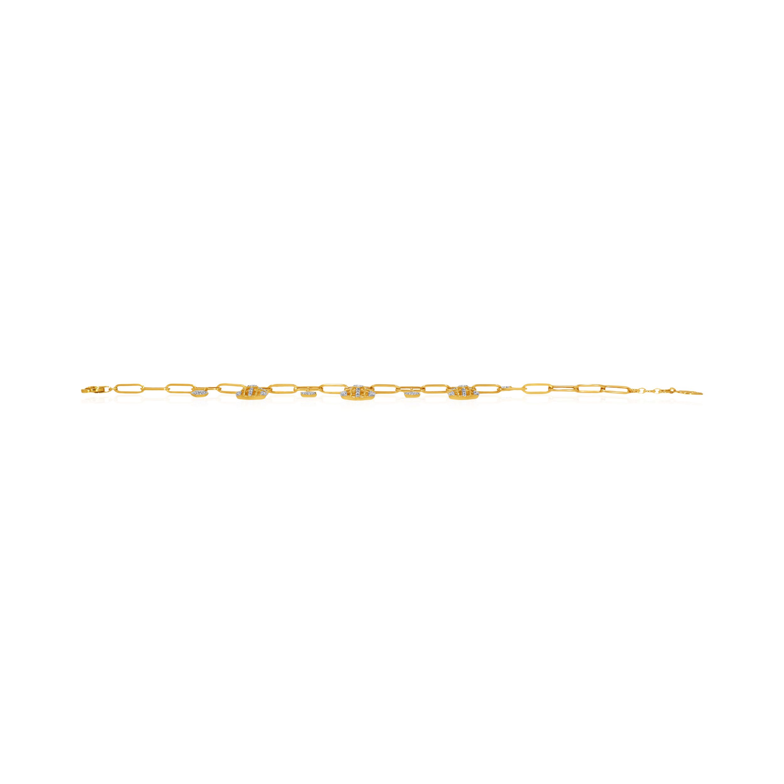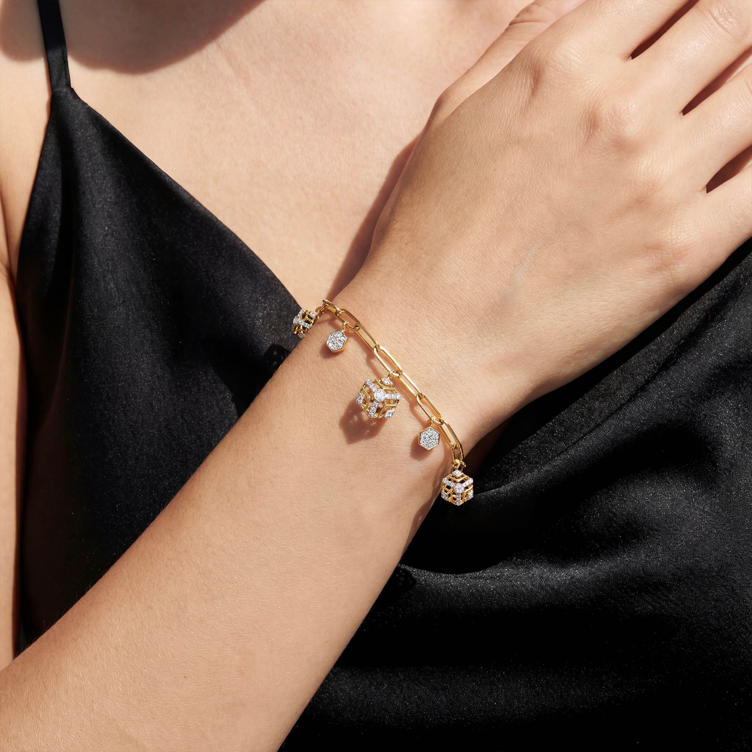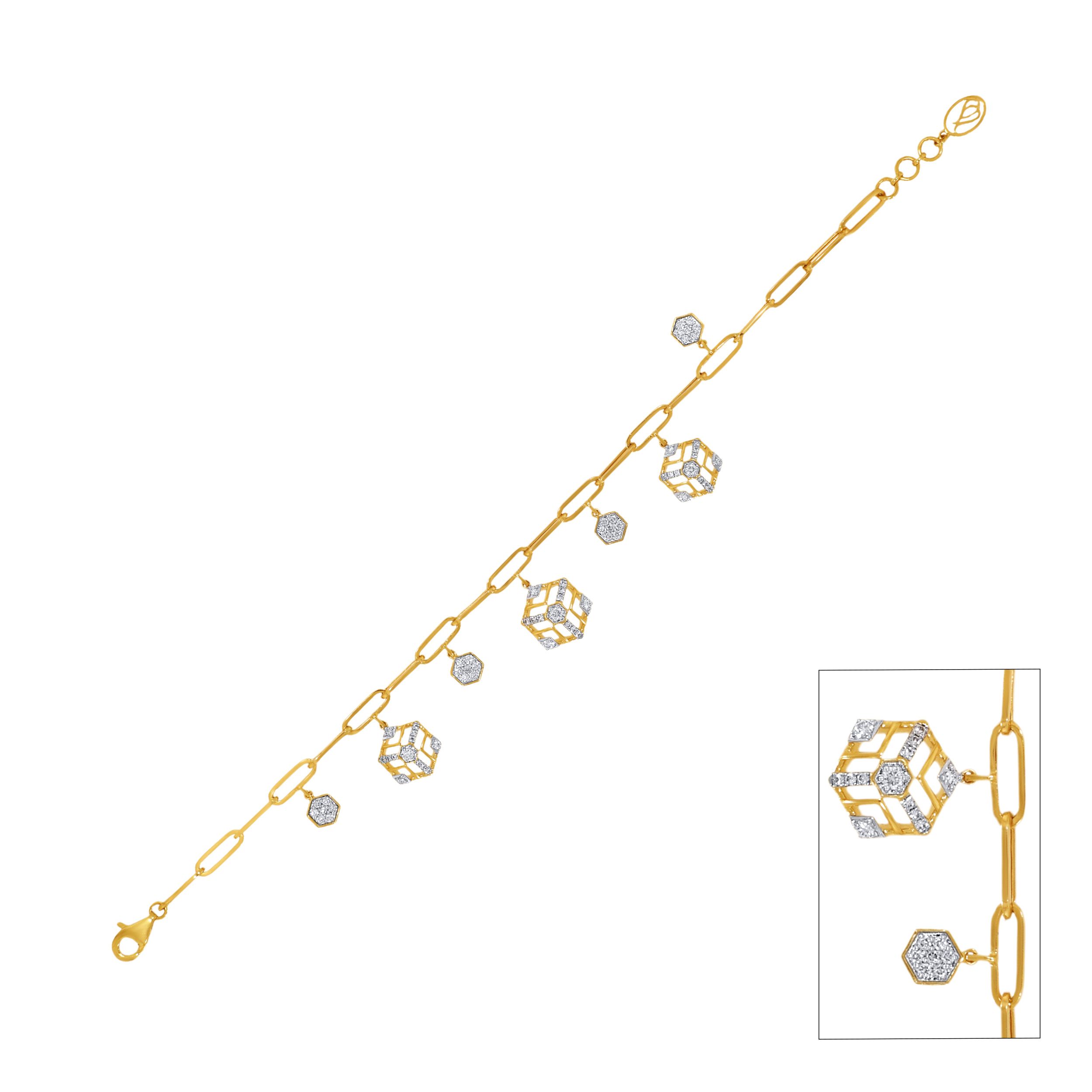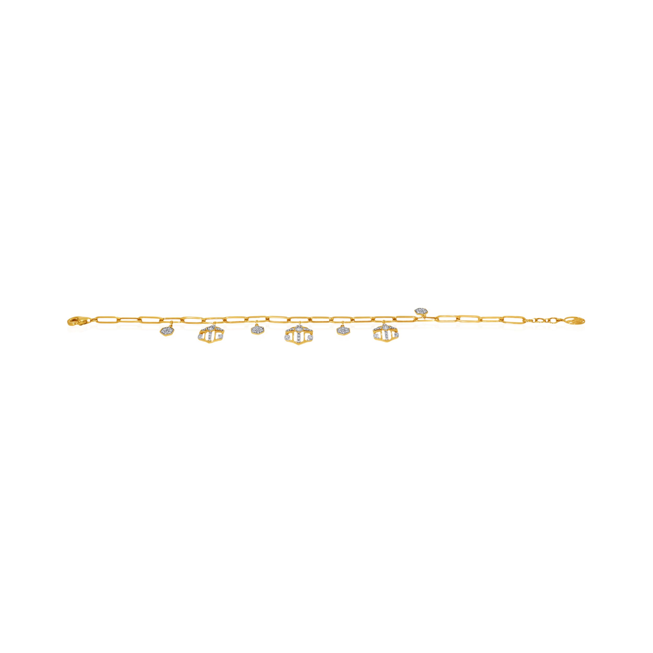Elevate your evening aesthetic with this exquisite diamond bracelet, defined by geometric charm drops that add dimension and movement to its sleek gold chain. The mix of structured forms and soft sparkle brings a sense of lightness and movement, creating a look that feels modern, easy, and quietly eye-catching for both special moments and everyday styling.