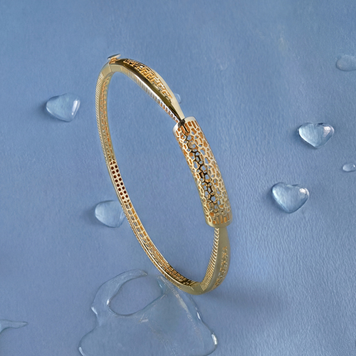 Crafted to captivate, this elegant gold chur bangle features a sleek rectangular motif adorned with intricate filigree detailing, flanked by finely worked bands. A timeless statement reserved for special occasions, where sophistication takes the spotlight. Please note, that the Meena / Chillai designs may have slight variations between the photographed image and the original product due to lighting effects
