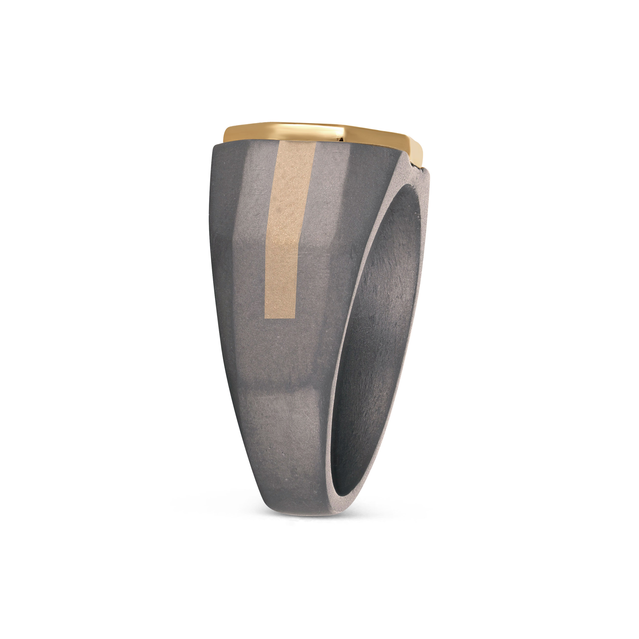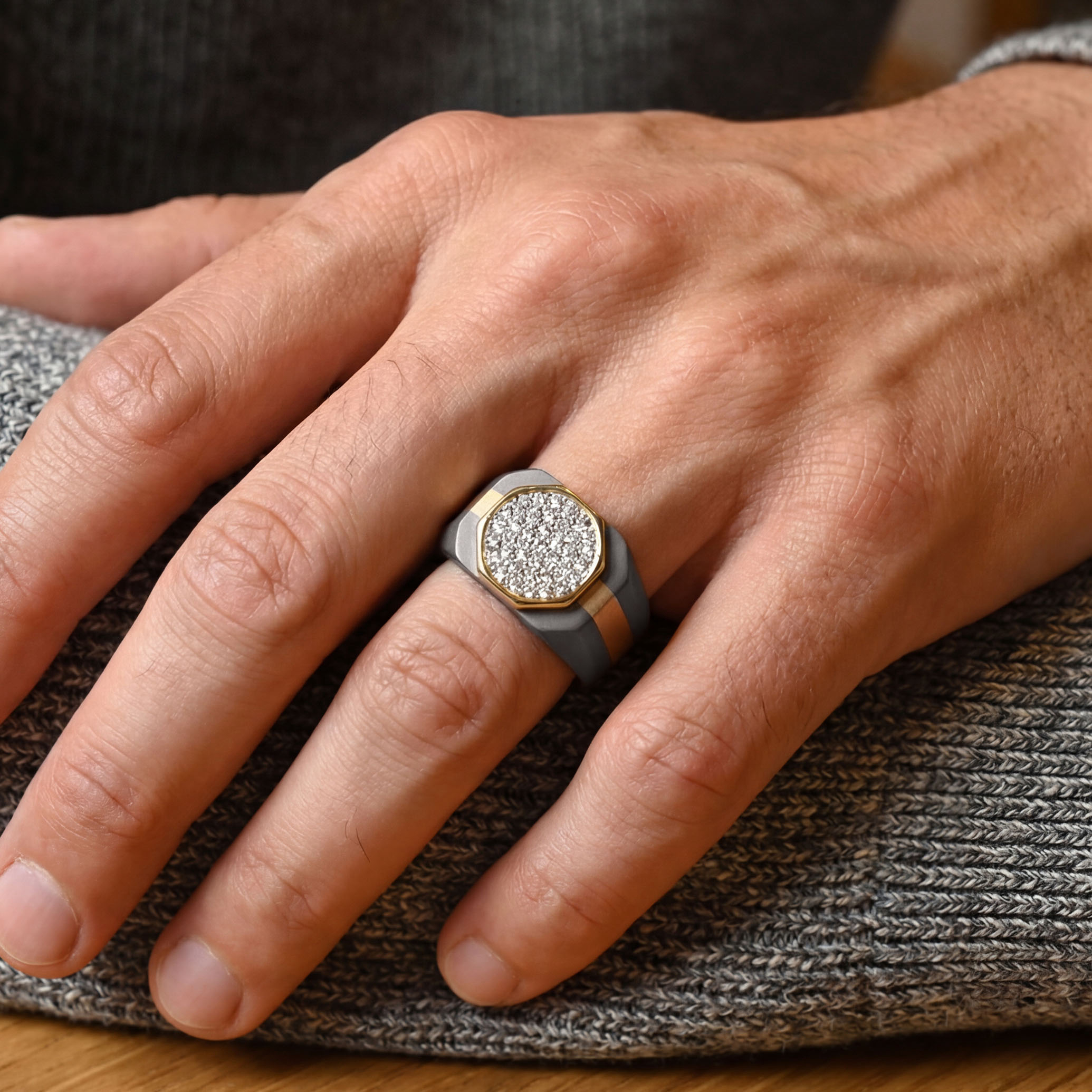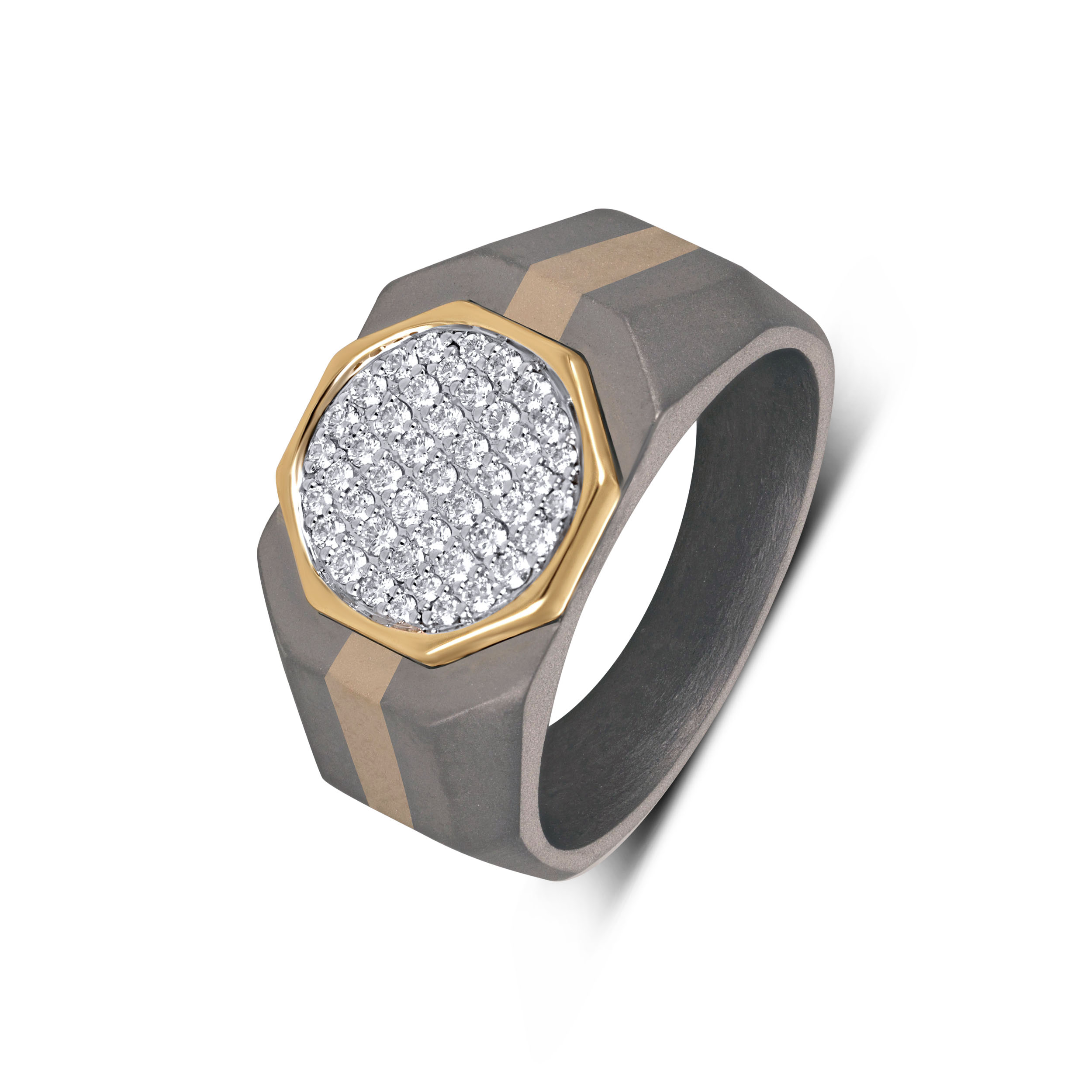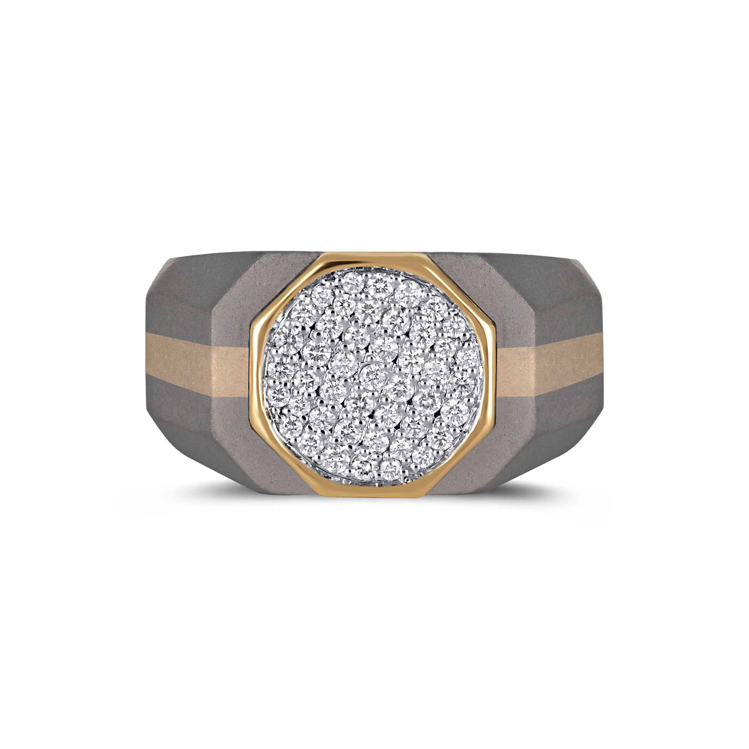 Command attention through form, not excess. This titanium diamond ring features a bold circular diamond cluster framed in gold, set against a matte deep-grey band with sharp, sculpted facets. The contrast of rugged titanium and controlled brilliance creates a powerful, modern silhouette, crafted for men who value precision, confidence, and presence that speaks quietly.