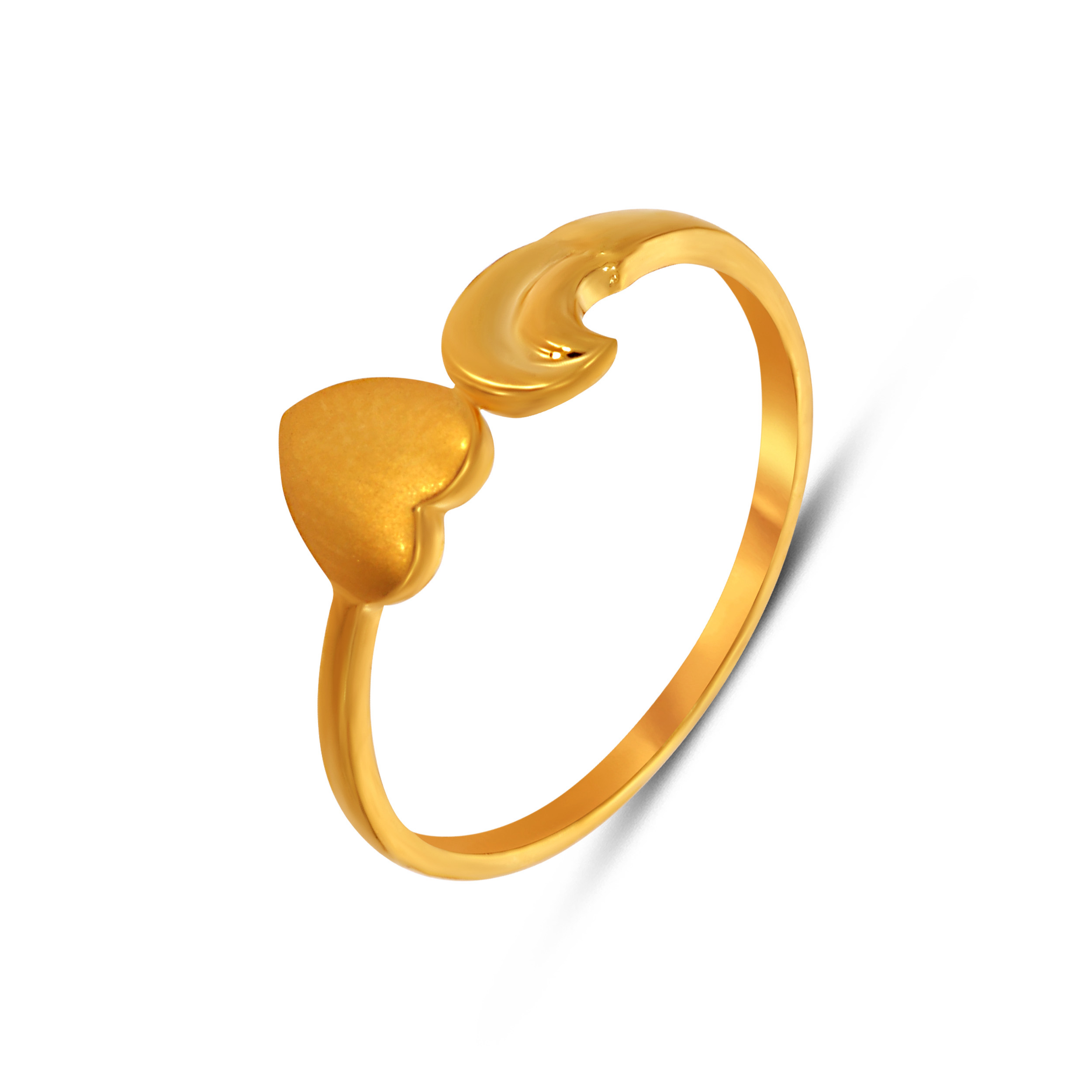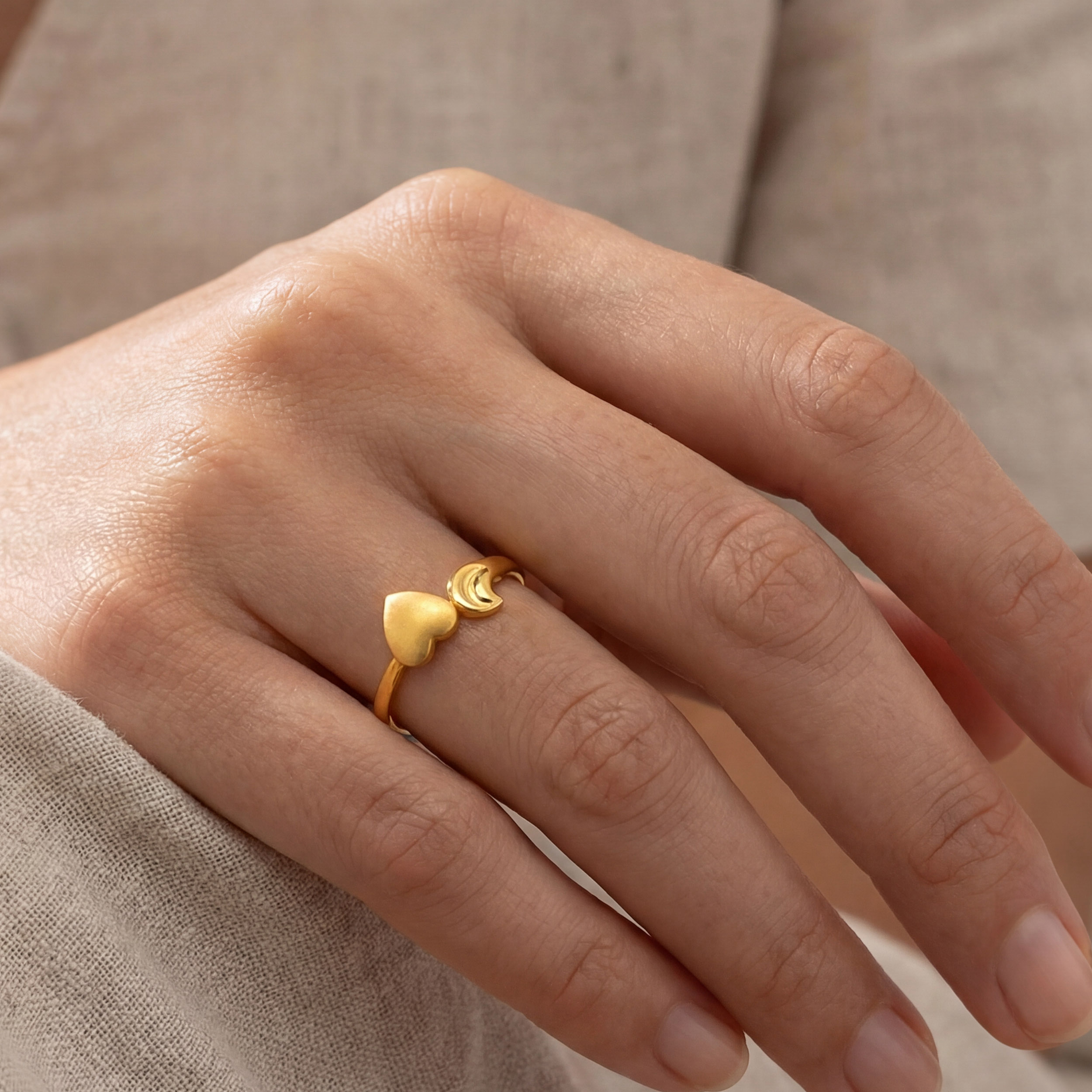 A subtle play of curves meets a delicate heart in this lightweight gold ring designed for quiet romantics. The soft contrast of polished and matte finishes adds dimension without weight. Style it with a breezy kurti or a satin blouse for understated charm.