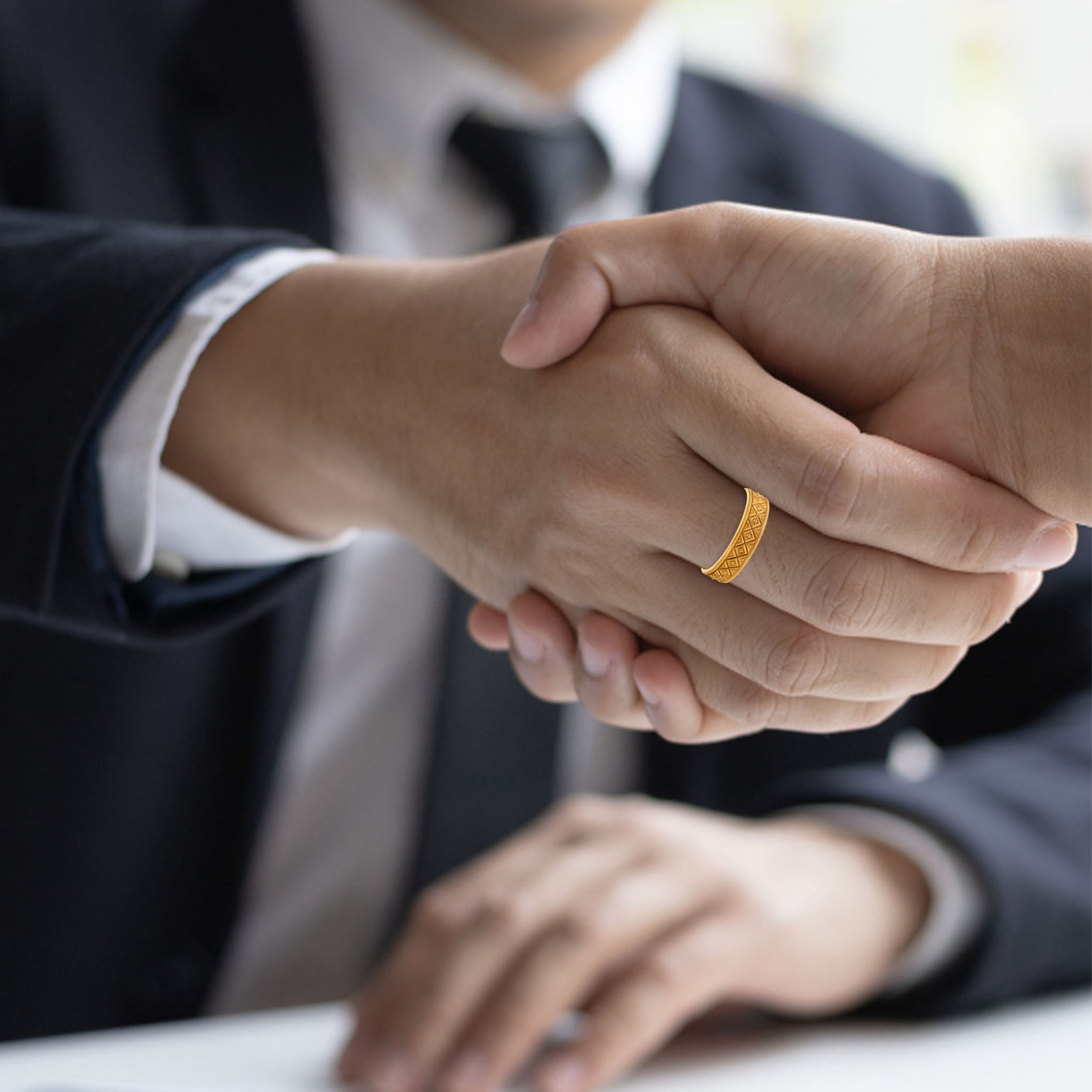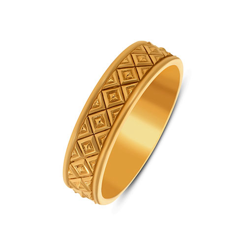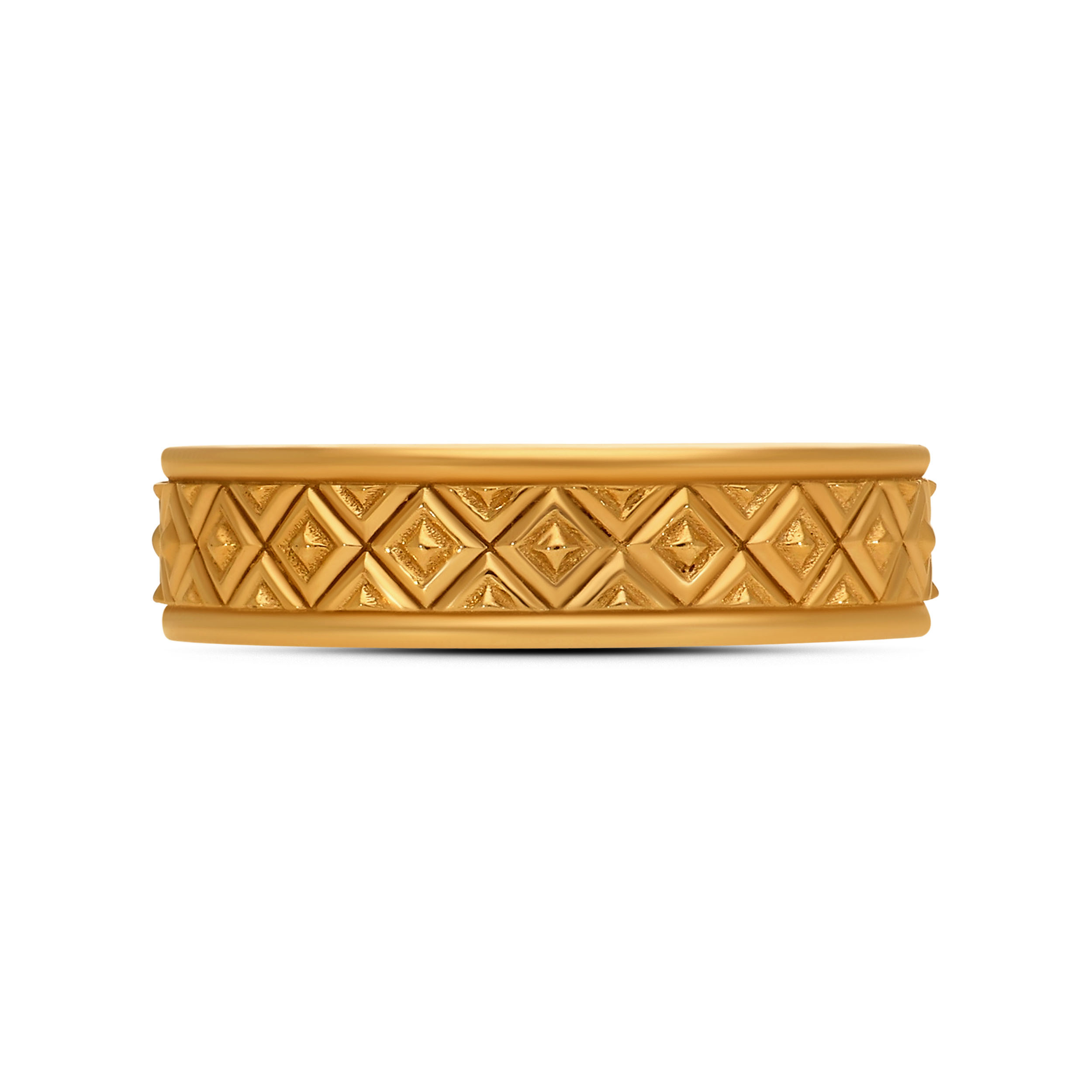 Elevate your signature look with this ring, a statement of contemporary masculine design. The repeating pattern of sculpted golden pyramids catches the light from every angle, creating a dynamic play of depth and dimension. Bold yet refined, it pairs effortlessly with smart casuals and dapper formals alike.