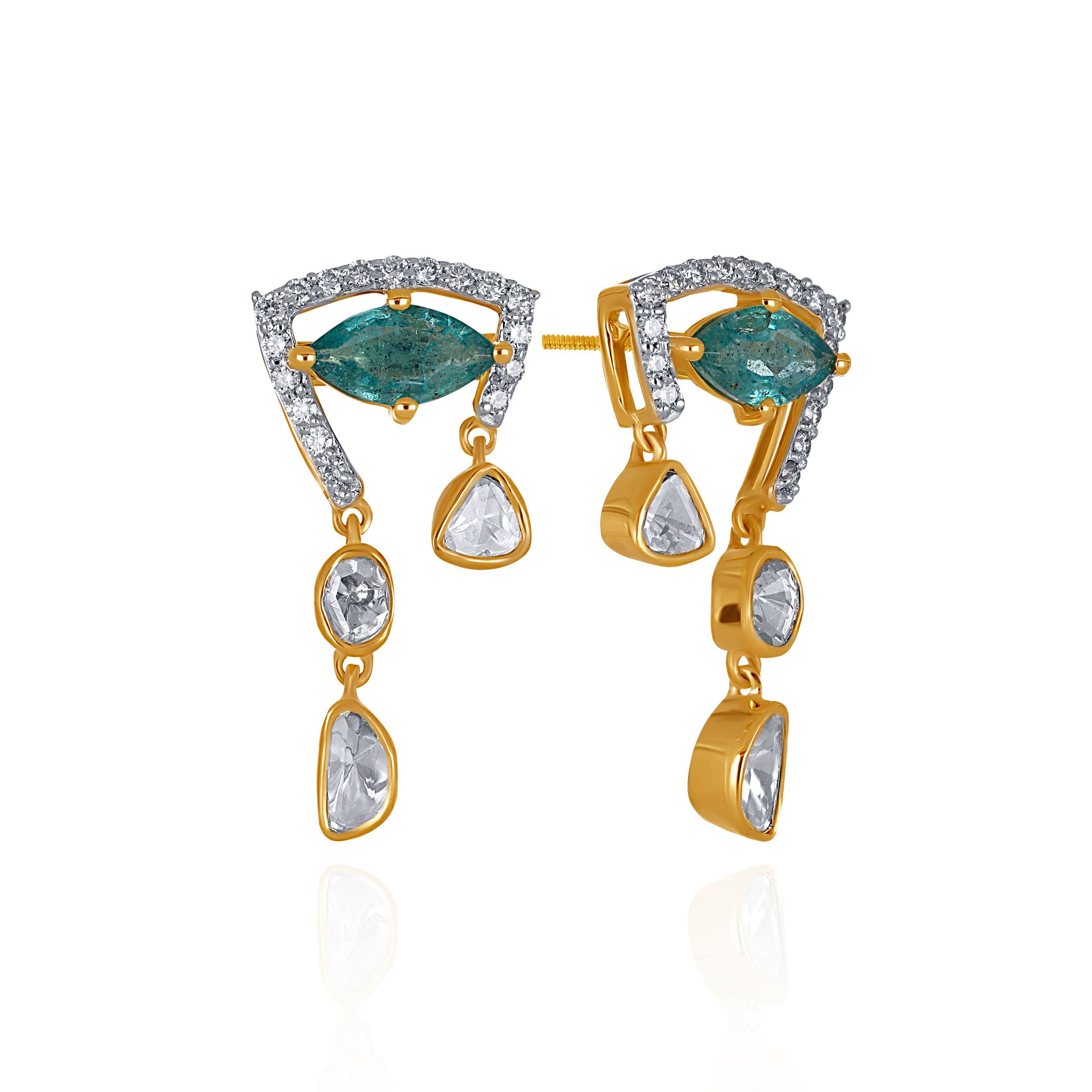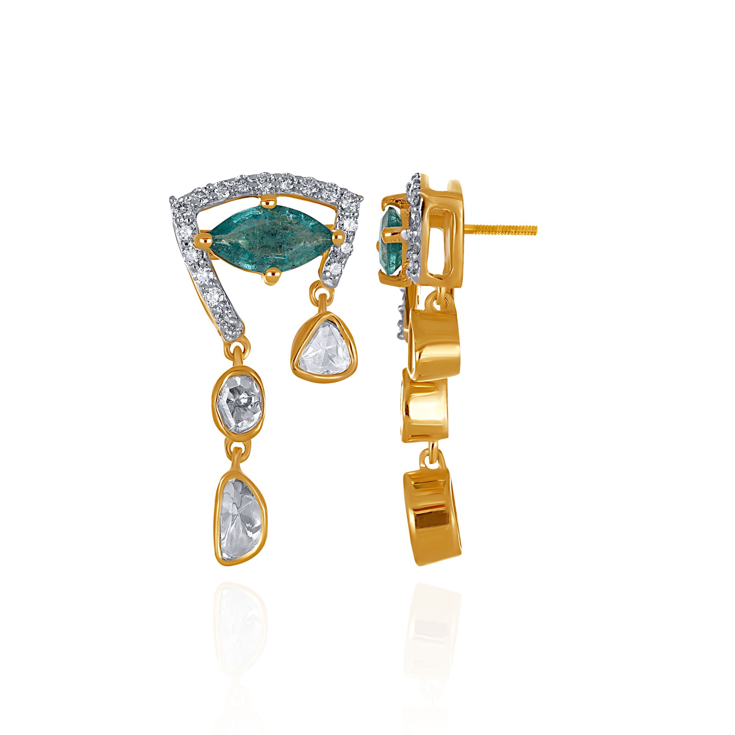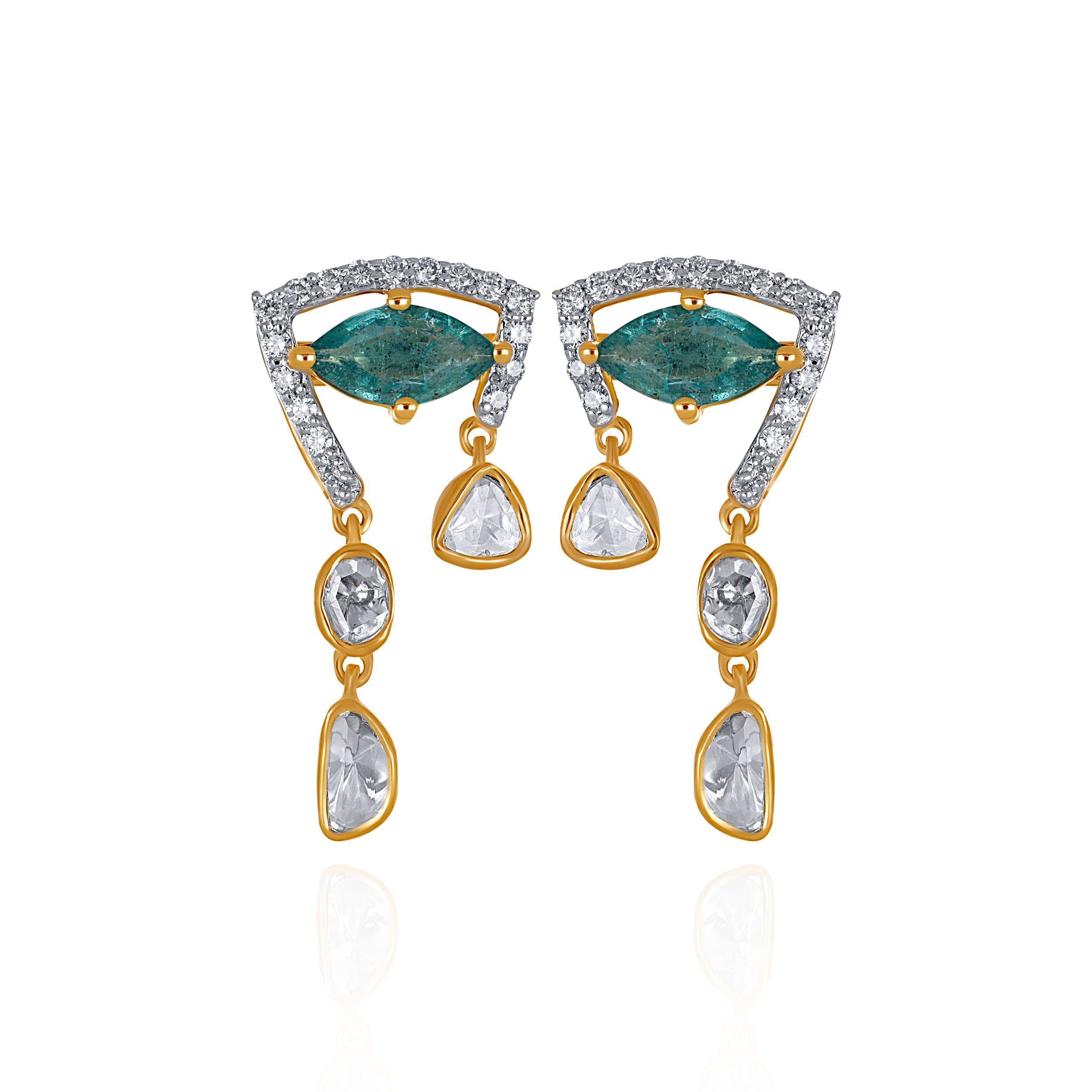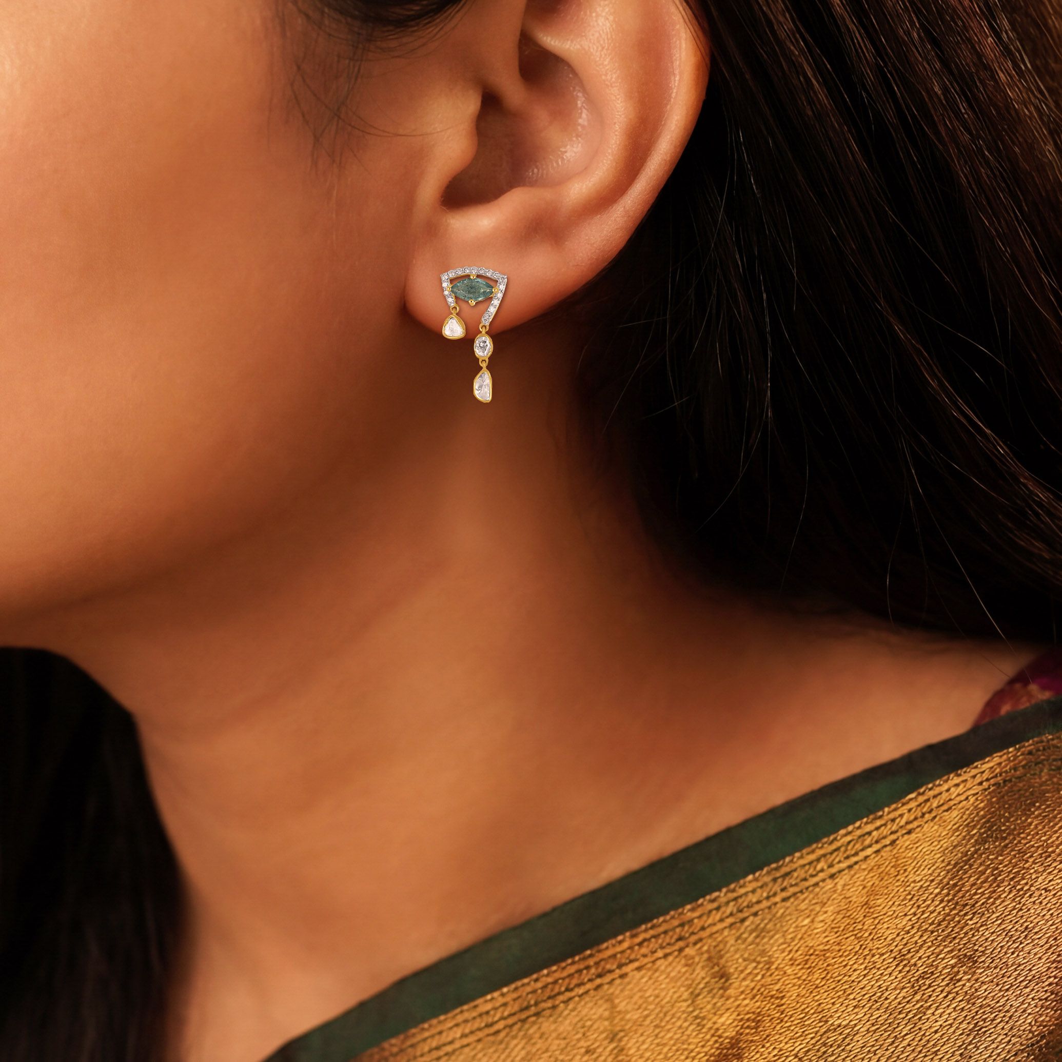 Where colour meets craftsmanship, these earrings showcase a striking pear-cut emerald complemented by cascading uncut Polki and diamonds. The airy, sculptural form creates effortless movement, offering a bold, architectural take on traditional Indian artistry. Style them with a jewel-toned lehenga or a flowing Anarkali for a refined, regal look.
