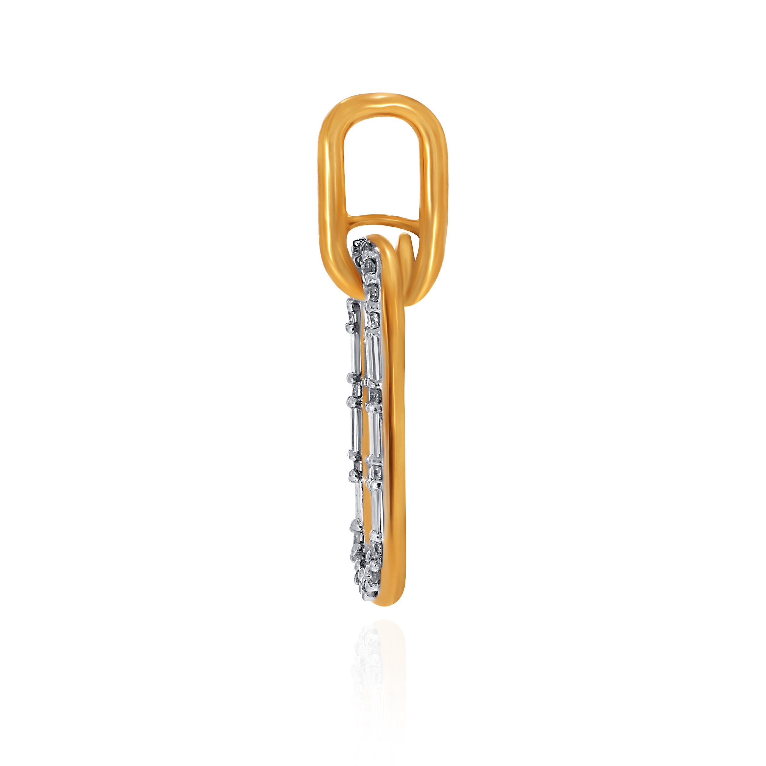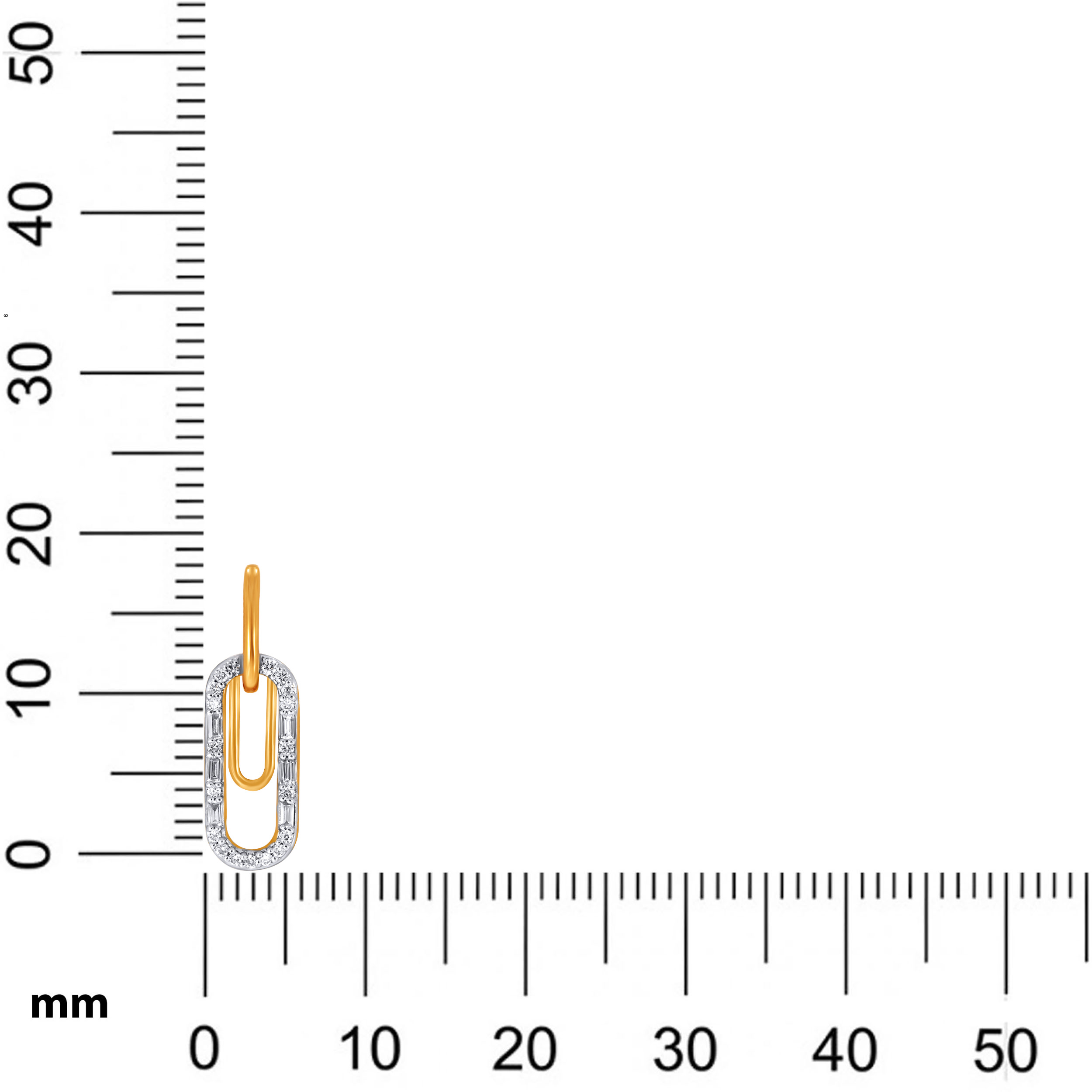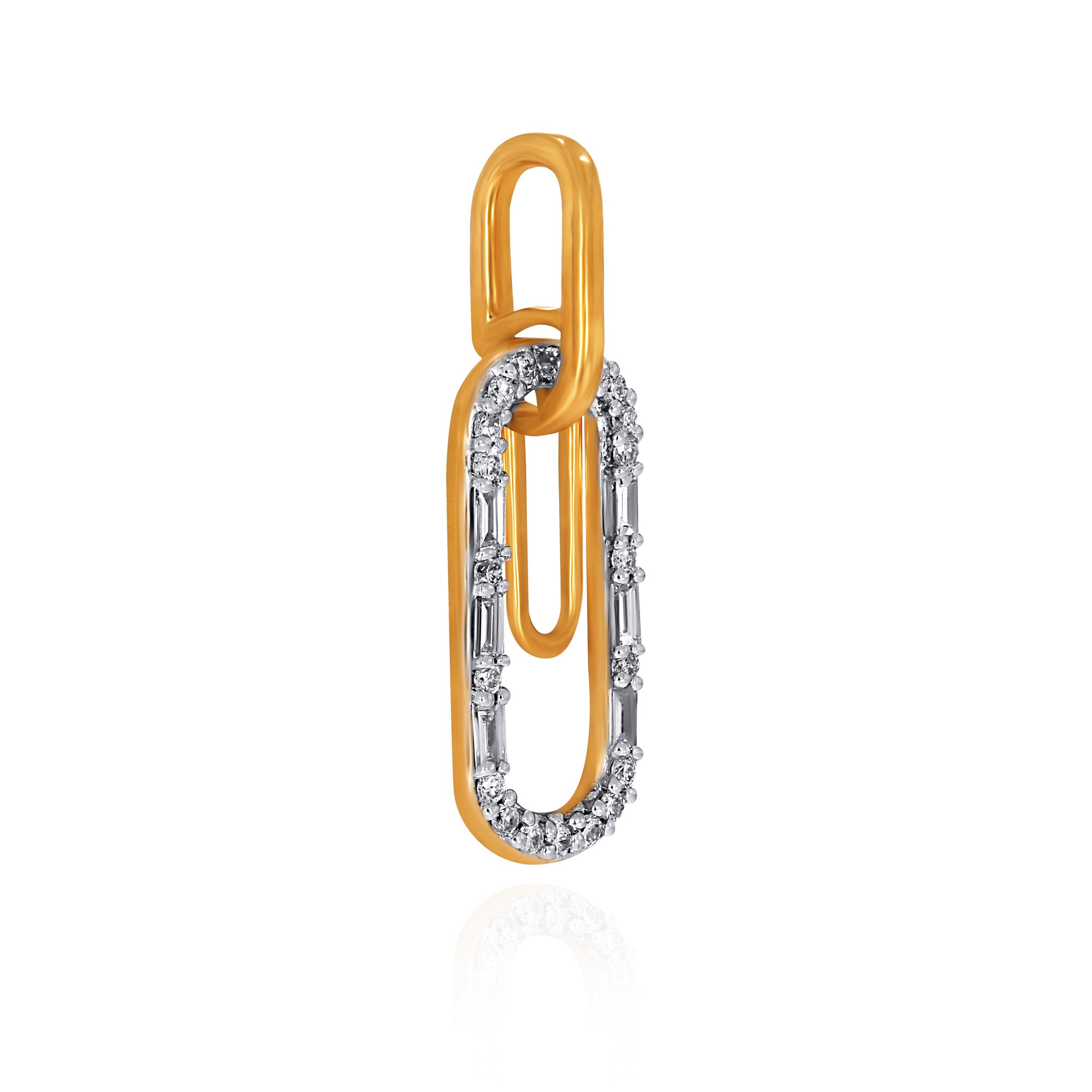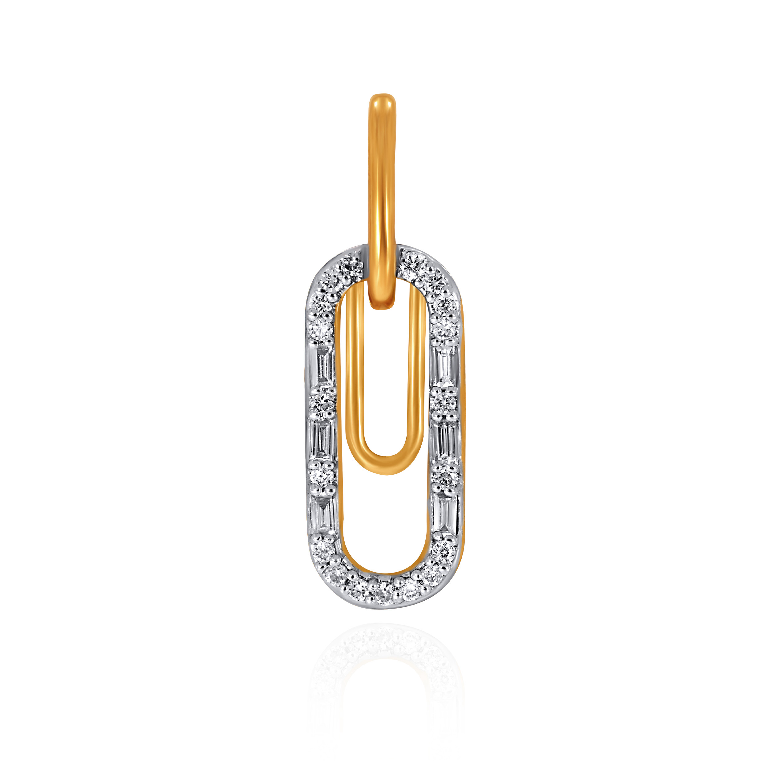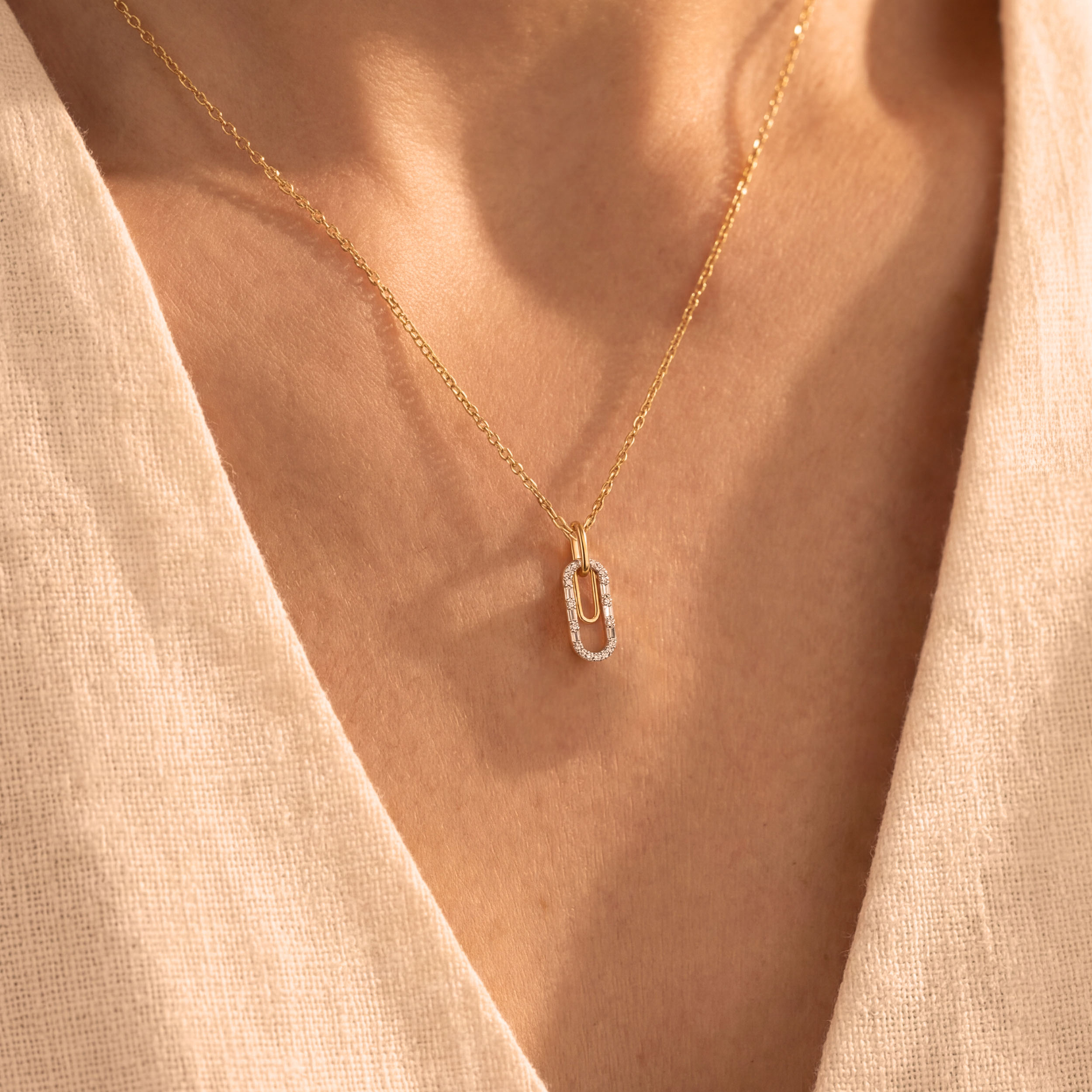 Symbolising layered connection, this contemporary diamond pendant reimagines the paperclip silhouette with refined elegance. An elongated, diamond-set outer link - accented with a mix of brilliant and baguette cuts- frames a sleek, polished gold link suspended within, creating depth and striking contrast. Structured yet fluid in form, it captures modern sophistication with a distinctive, design-forward appeal.