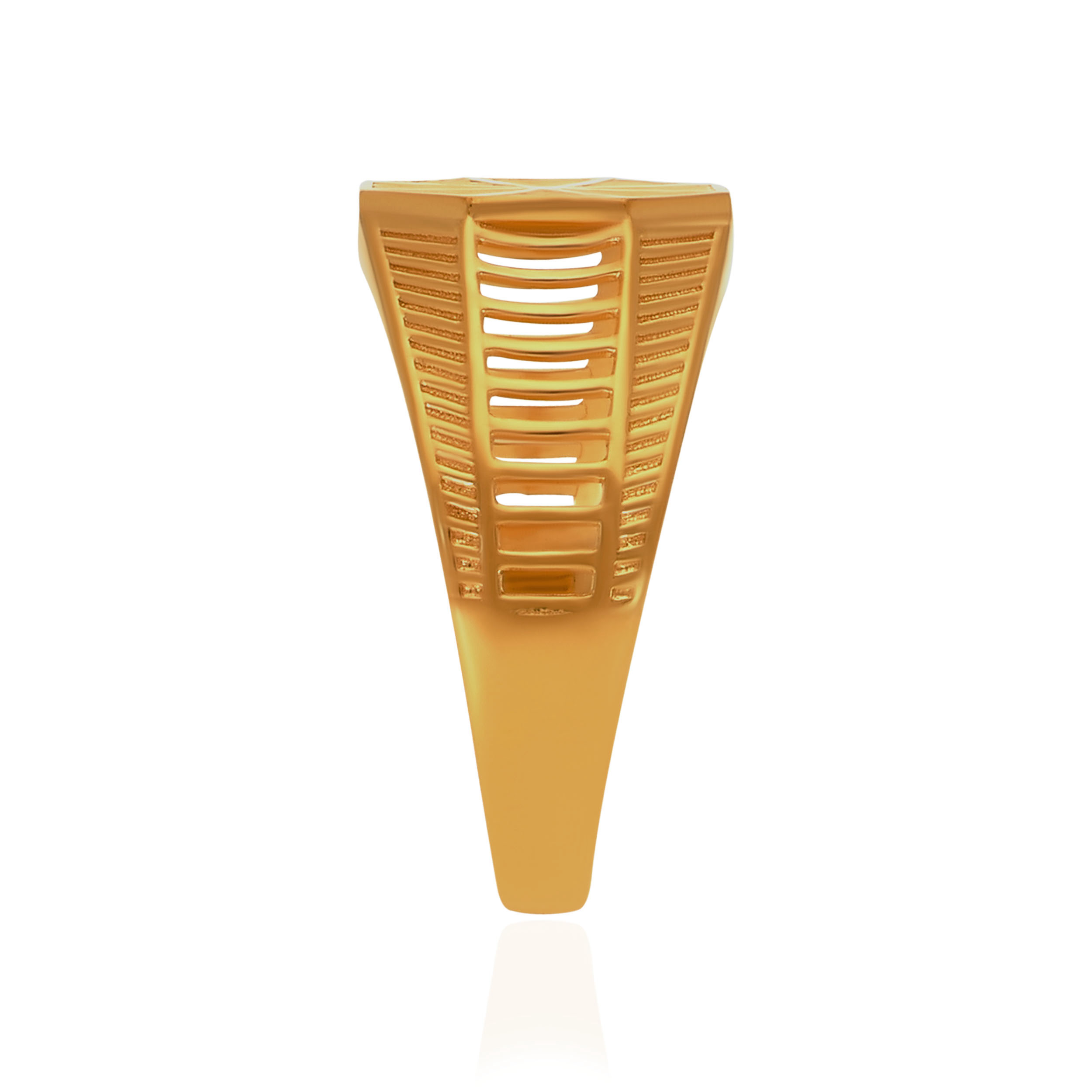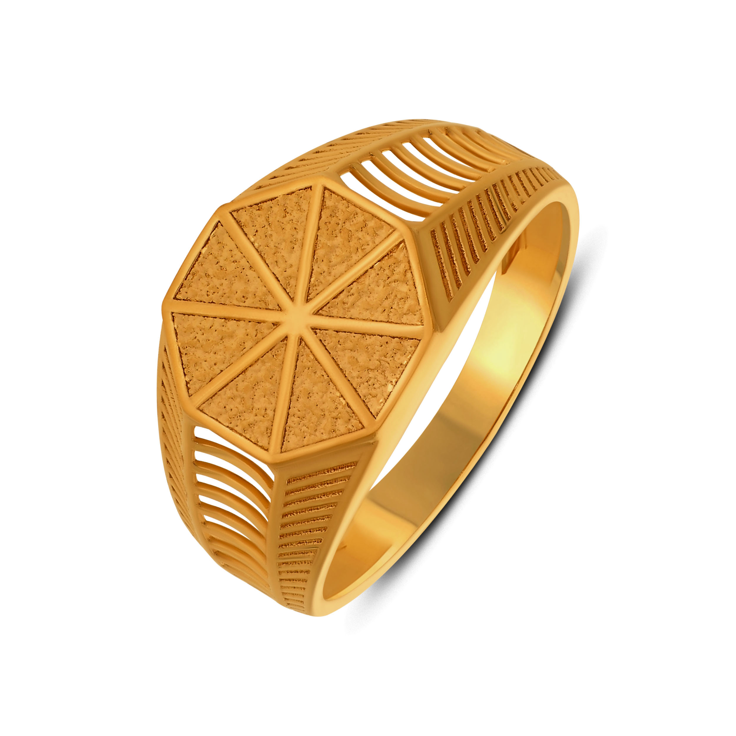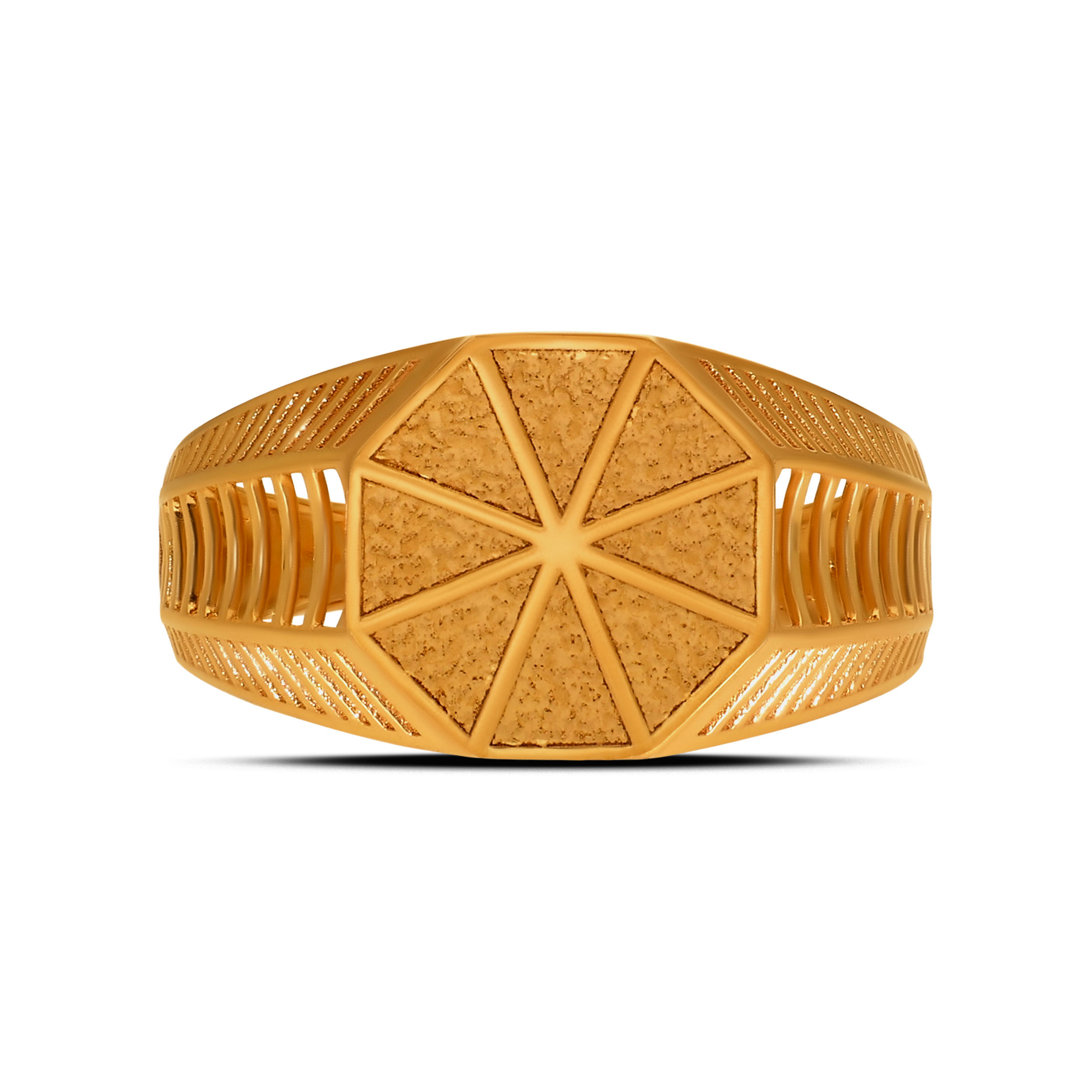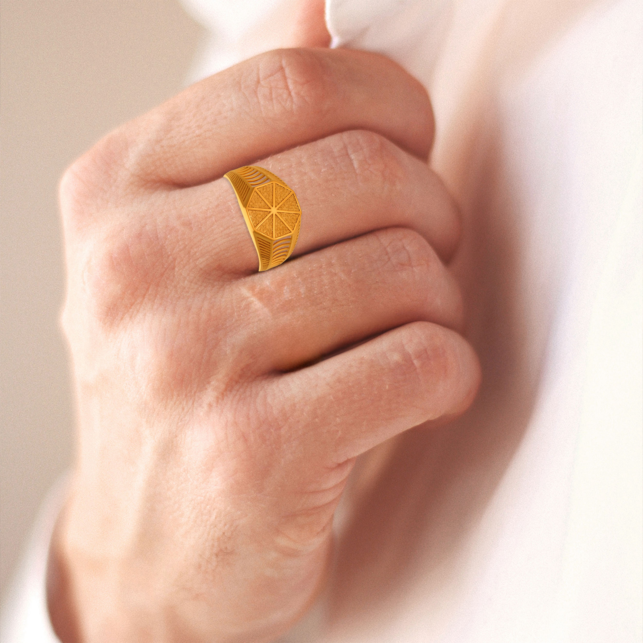 Defined by bold geometry and architectural intent, this gold ring stands apart through structure and detail. The octagonal face and open lattice sides lend it a modern, industrial edge, built for men who appreciate design with depth. Style it with structured blazers, monochrome outfits, and sharp silhouettes.