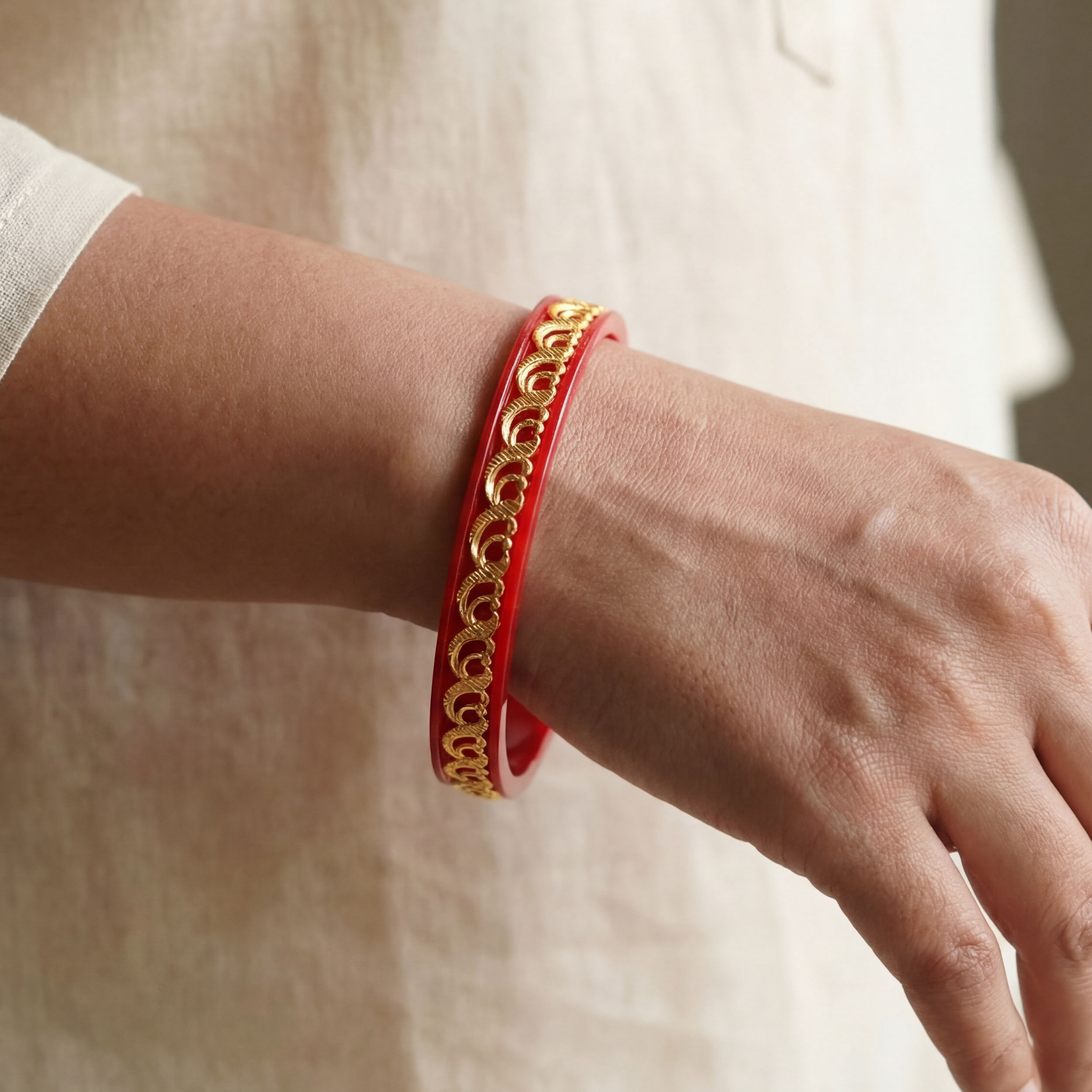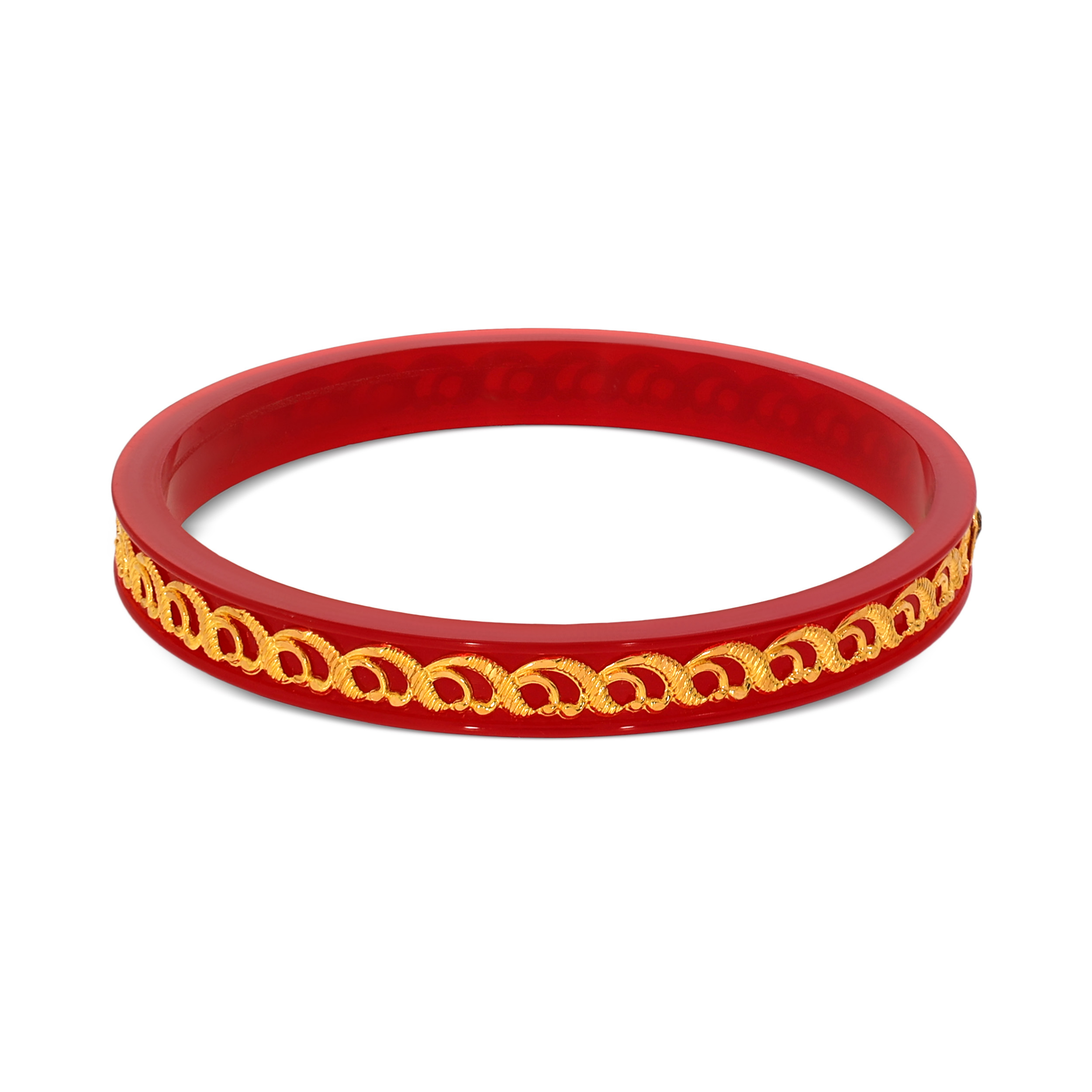 This gold pola bangle epitomises your marriage vows, symbolising commitment, prosperity, and enduring tradition. Ornate paisley-inspired gold detailing arcs beautifully across the vibrant red band. A classic design reimagined with intricate craftsmanship, it lends depth and grace to bridal and festive attire.