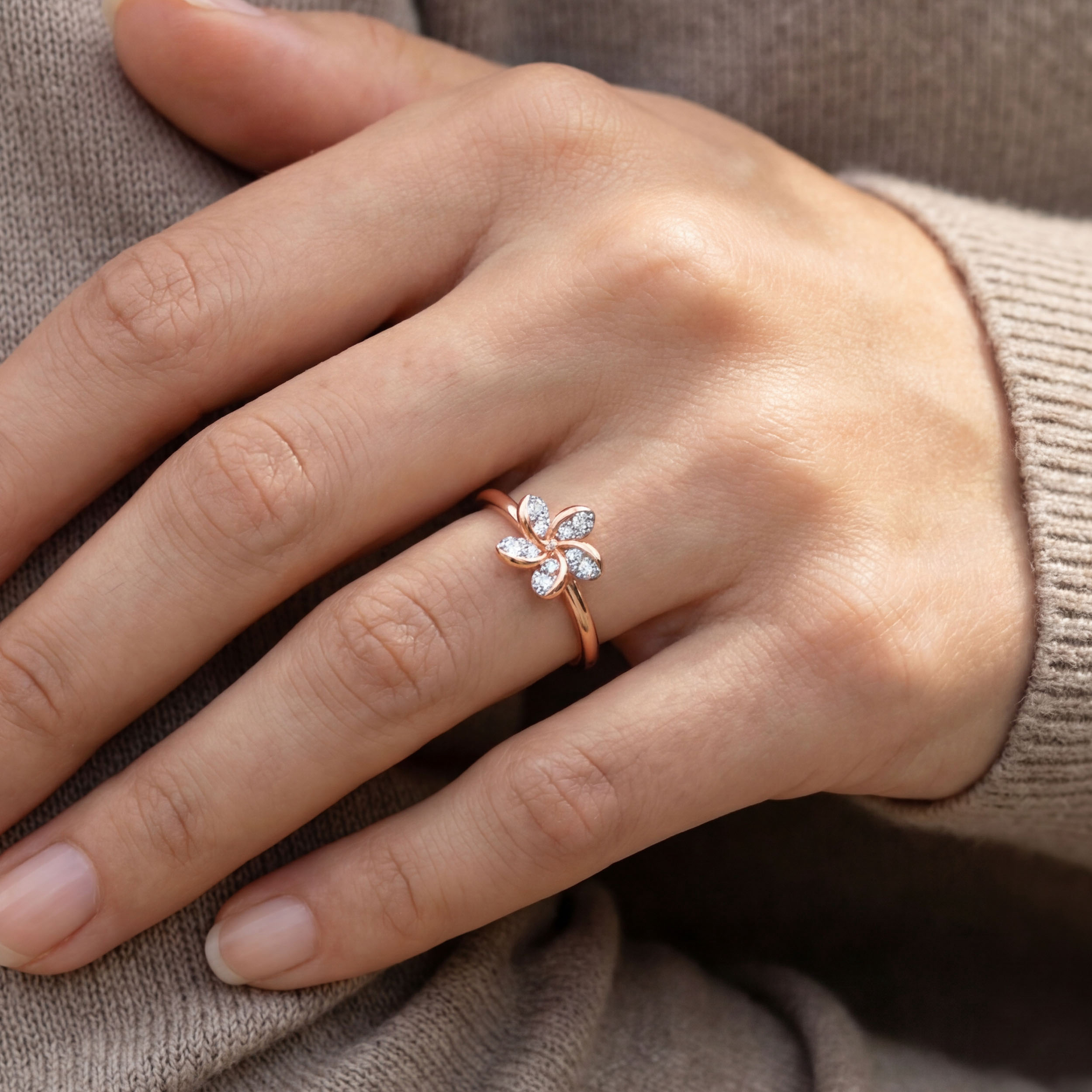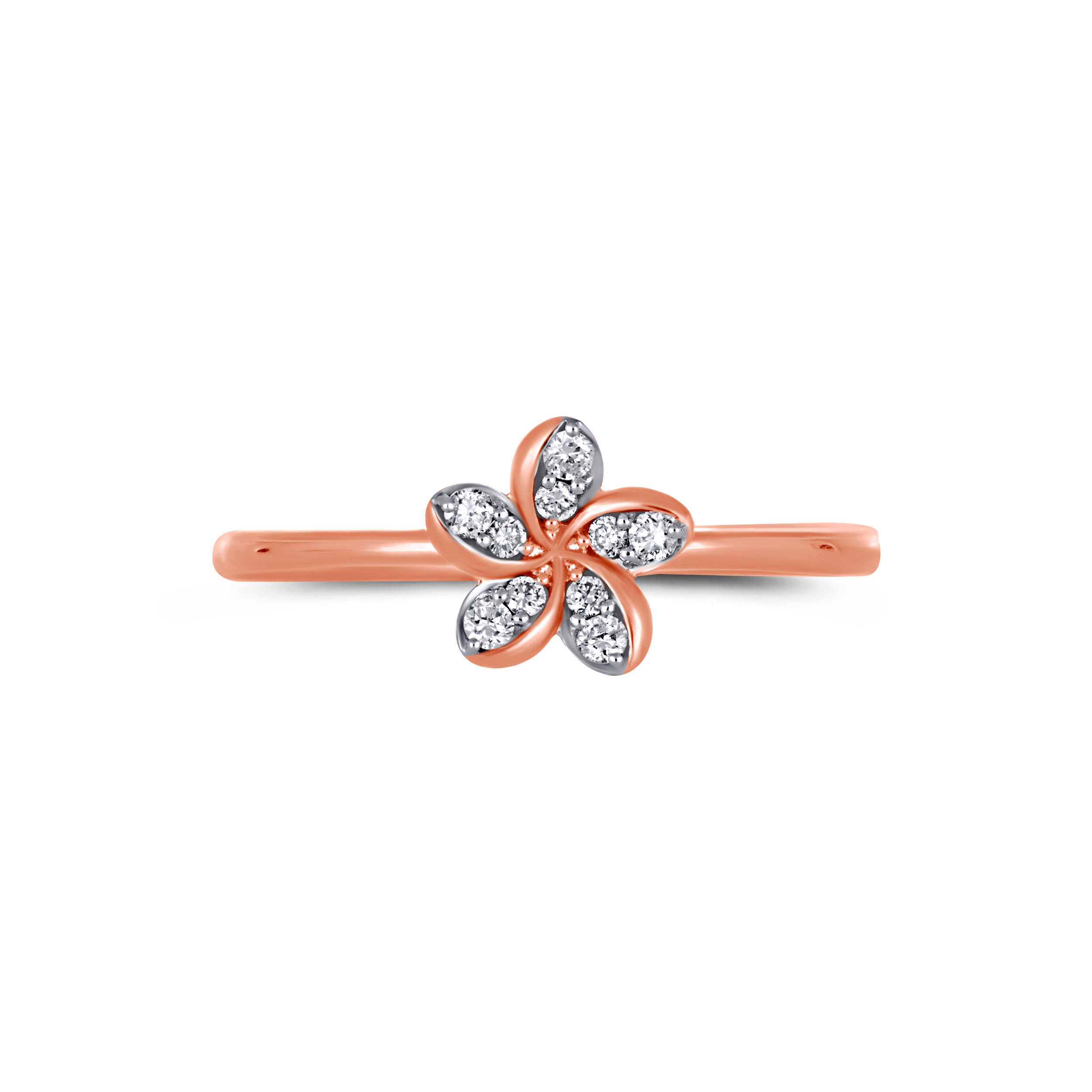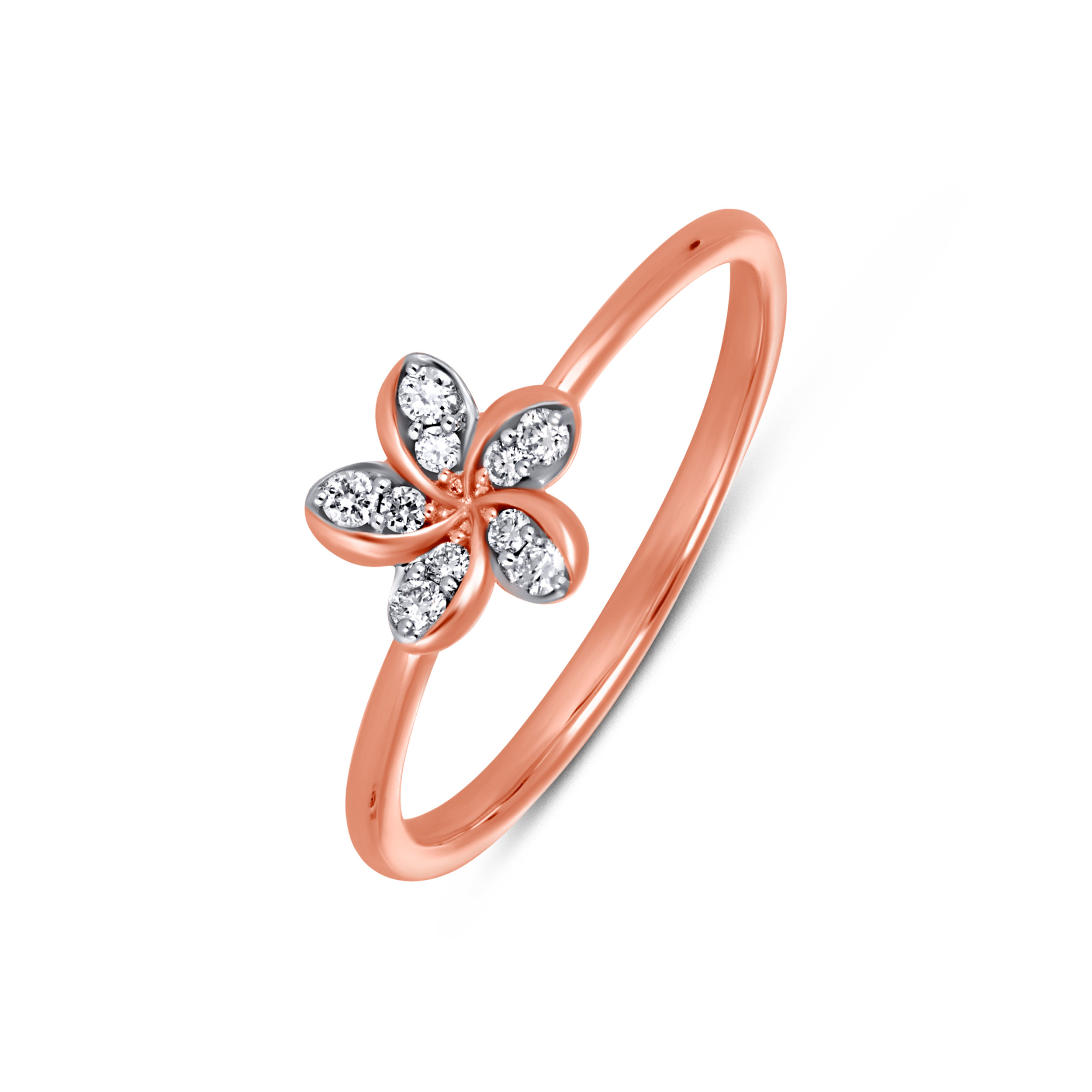 Embrace your feminine elegance with effortless grace. This diamond ring features a single sculpted blossom resting on a slender rose gold band. Diamond-set petals shimmer with subtle brilliance, creating an understated yet refined statement. Chic and versatile, it’s perfect for everyday sophistication or delicate stacking.