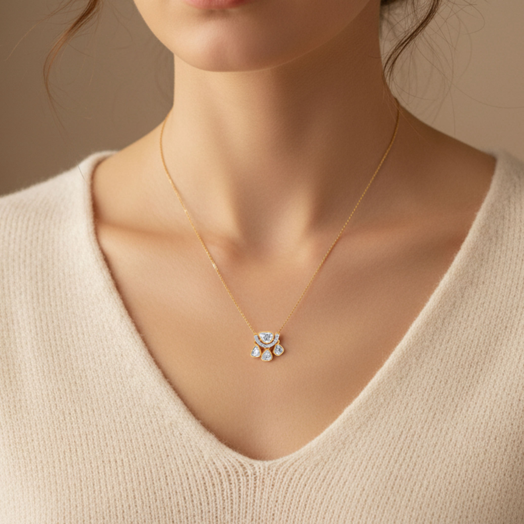 Celebrate timeless beauty with this artisanal diamond pendant, adorned by the traditional Polki technique. Naturally formed uncut Polki rest in warm gold, reflecting light with a vintage glow. A graceful expression of heritage craftsmanship, designed for the modern woman who values enduring elegance.