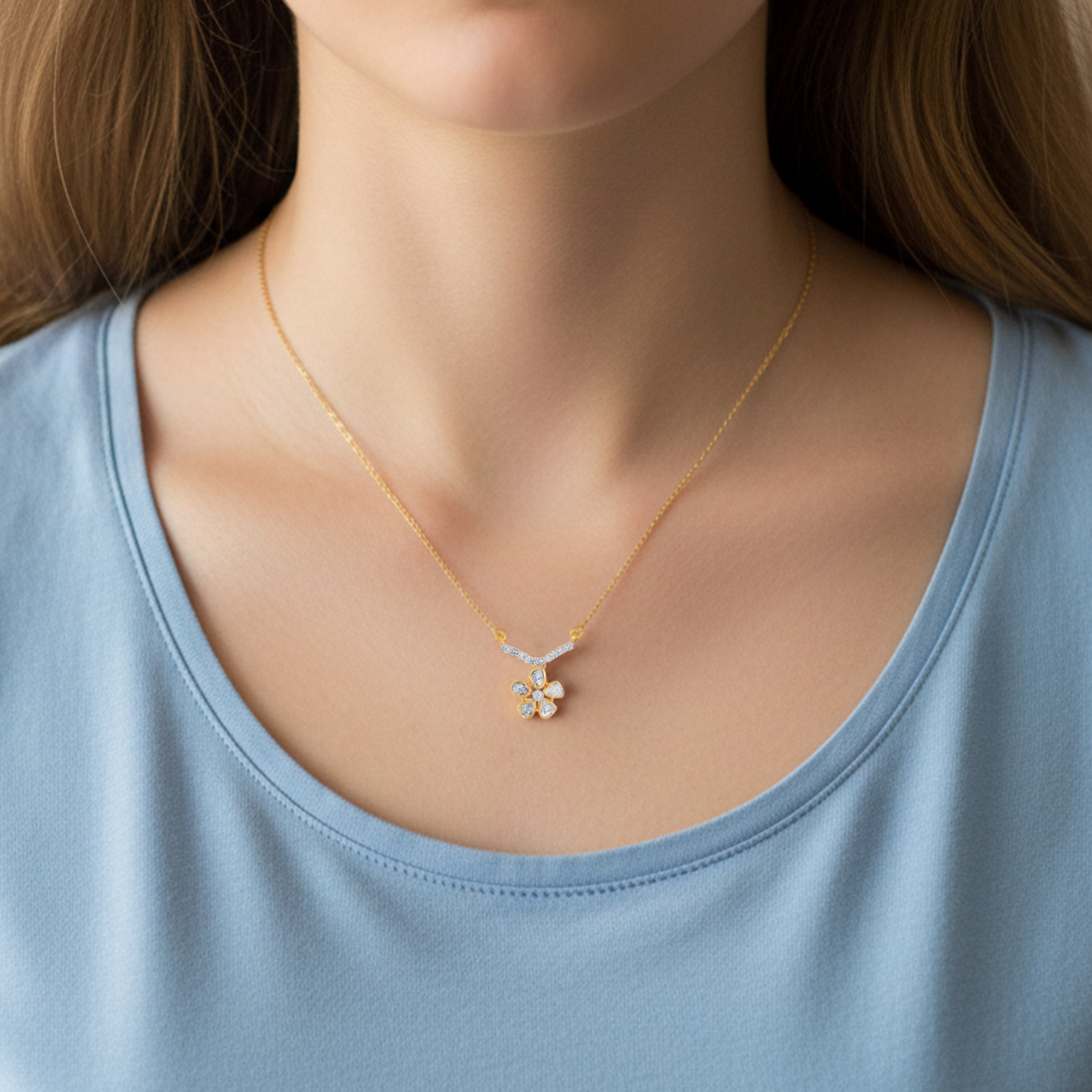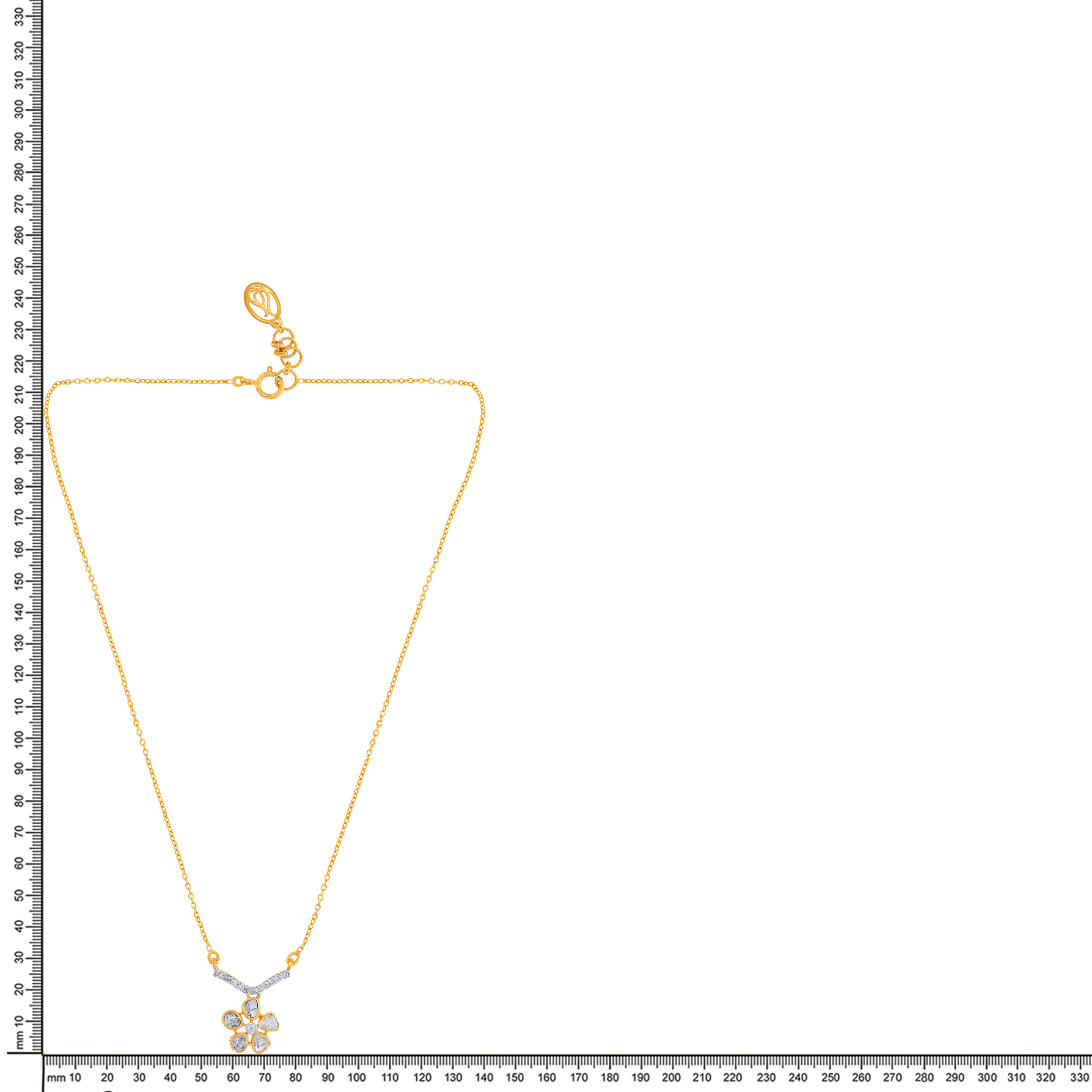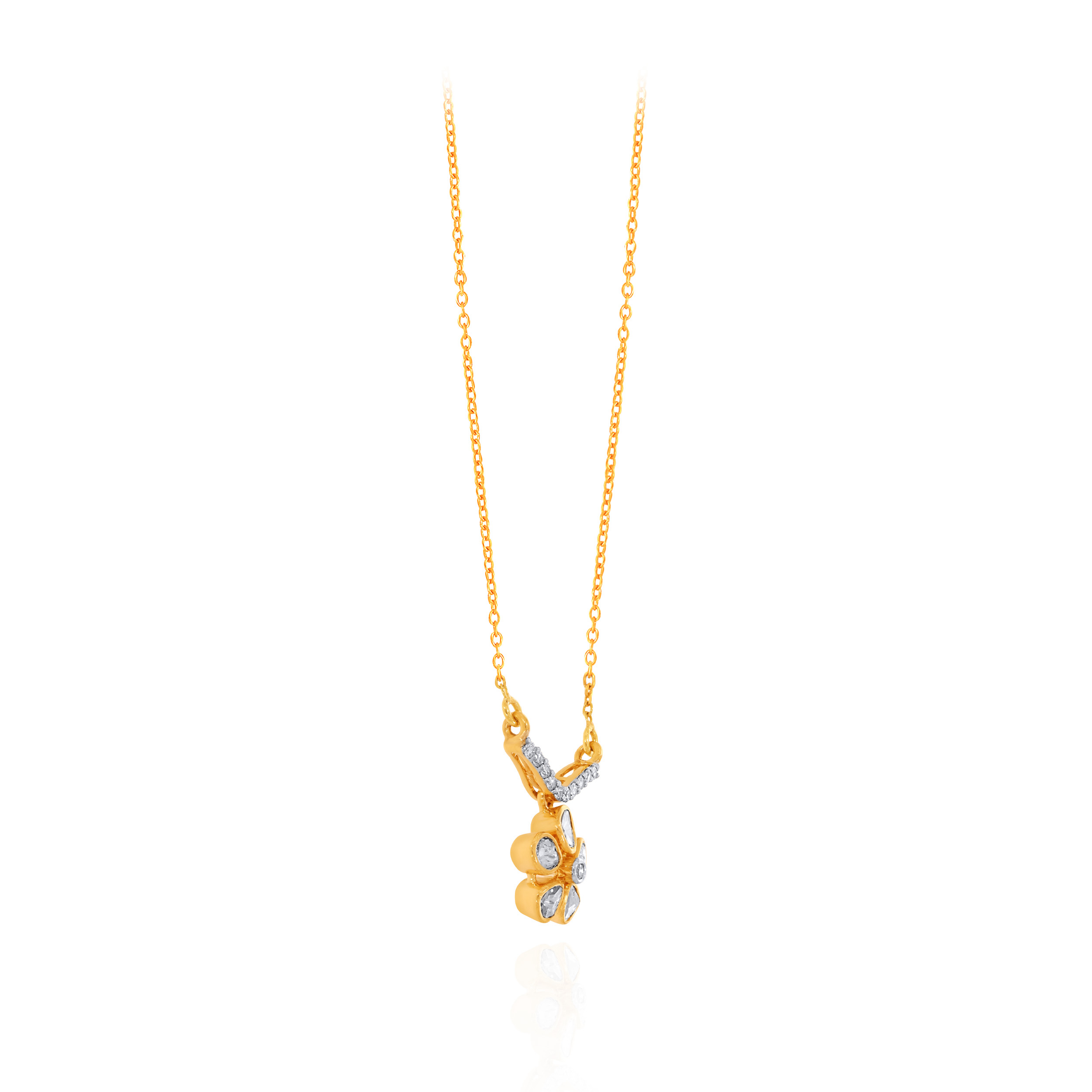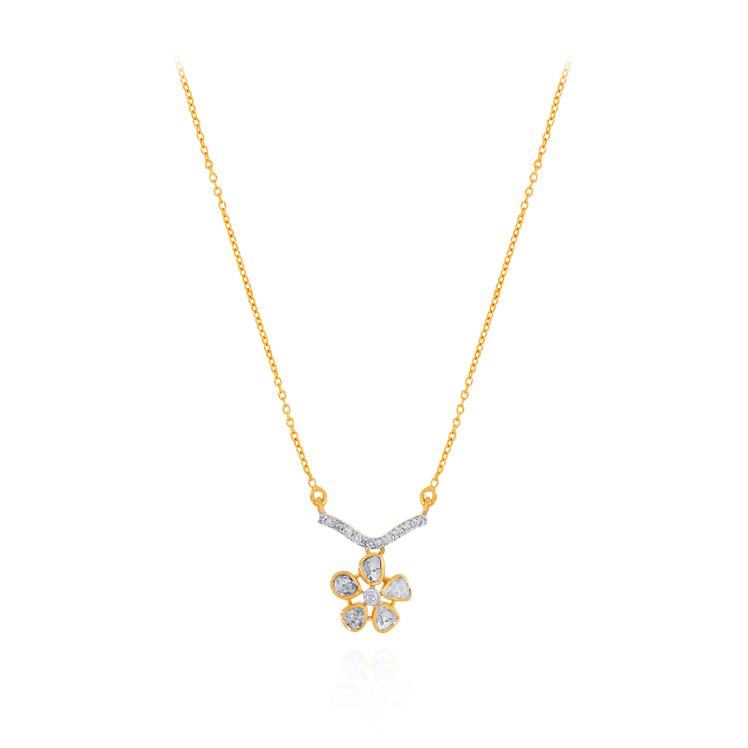 Elevate your jewellery collection with this floral-inspired pendant, crafted in warm gold. Five shimmering uncut Polki stones form the flower motif, centred by a brilliant-cut diamond. The studded curved silhouette adds a contemporary touch, balancing tradition with modern elegance, perfect for celebrations and everyday refinement.