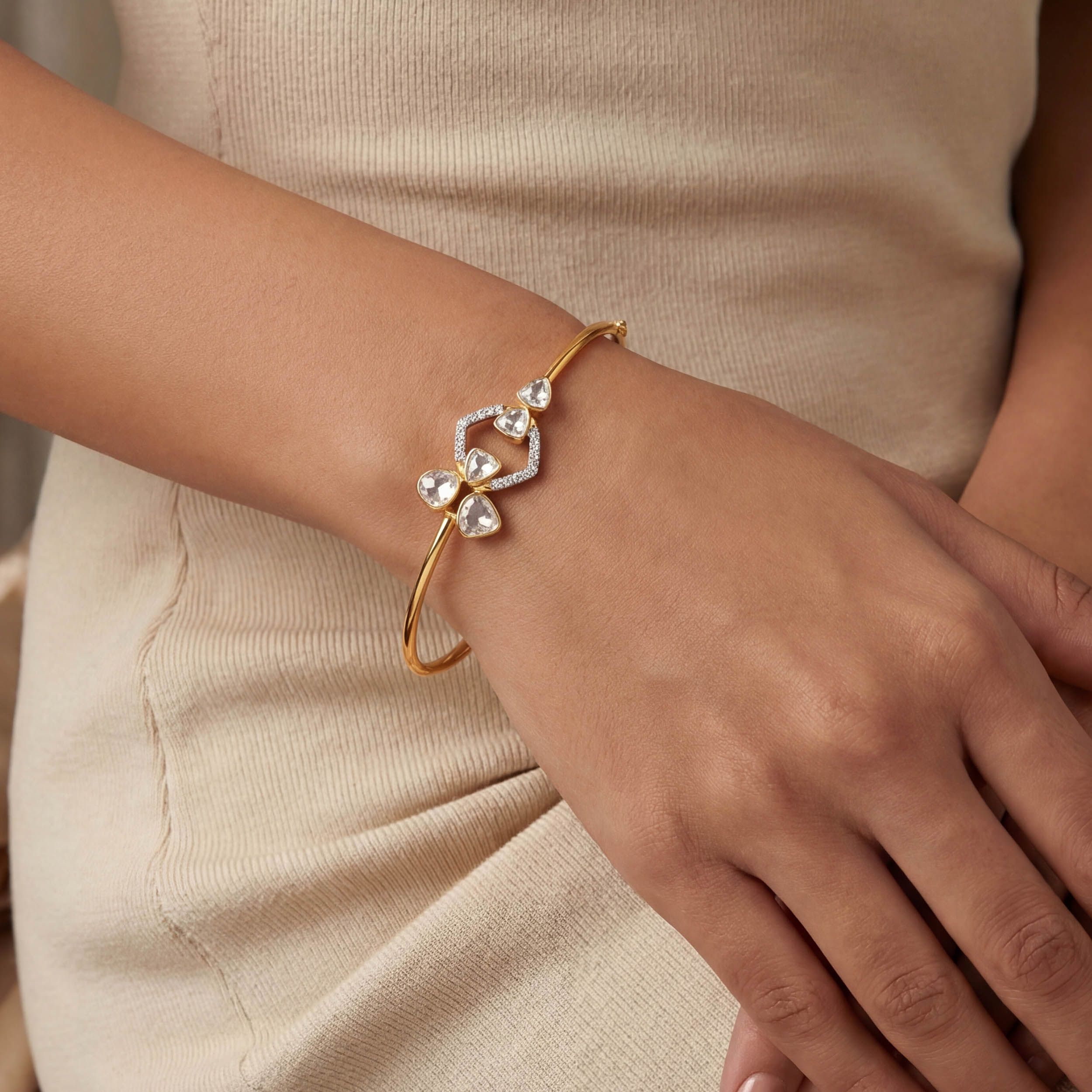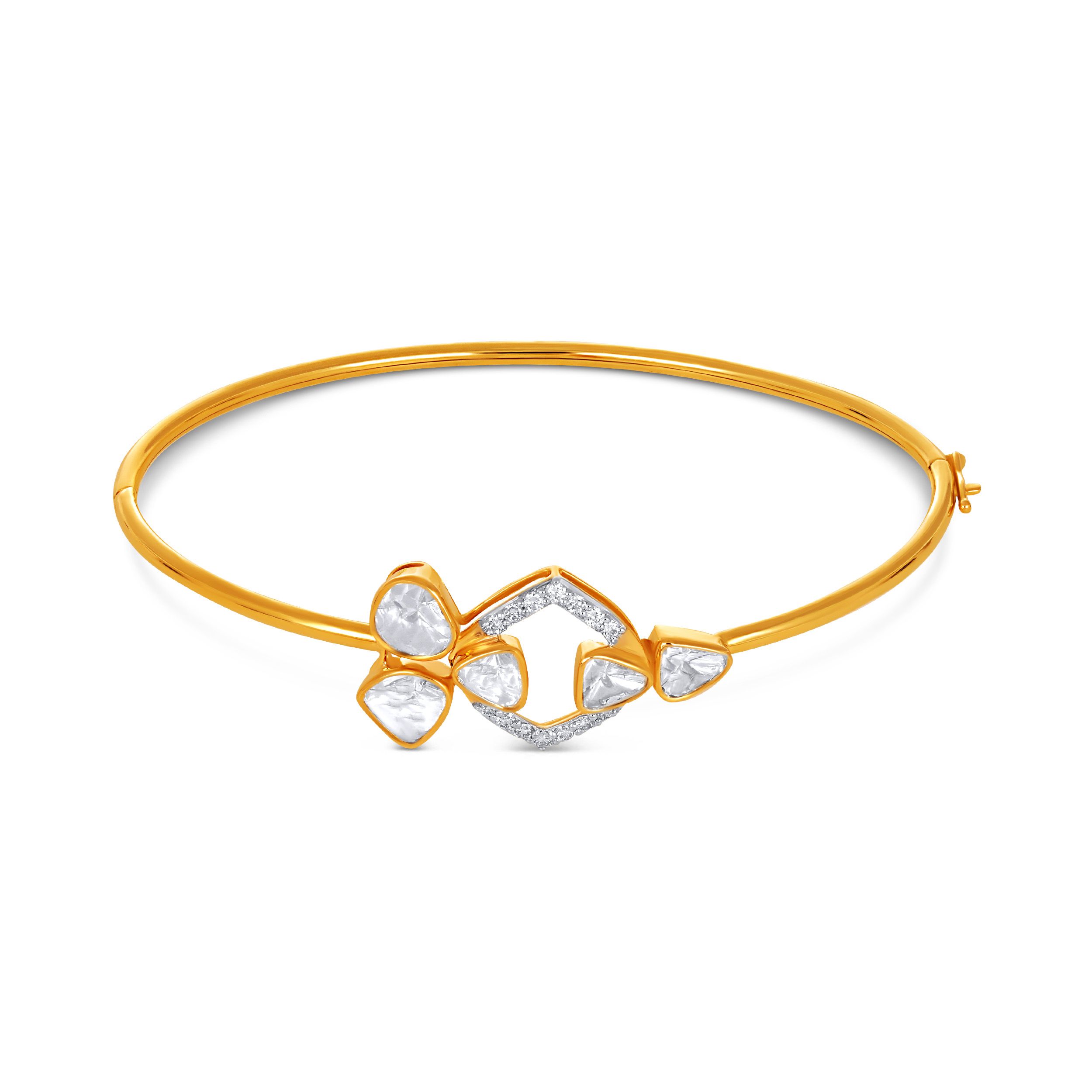 Minimalism at its finest, this dainty bangle features a delicate diamond halo framed with softly set polki stones. The clean gold form keeps the look light and effortless, adding just the right touch of sparkle to everyday styling. This bracelet complements Indo-Western ensembles perfectly and styles beautifully with lehengas.